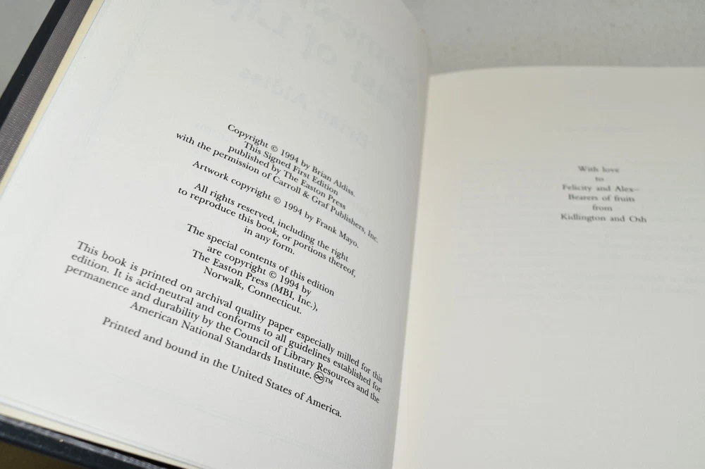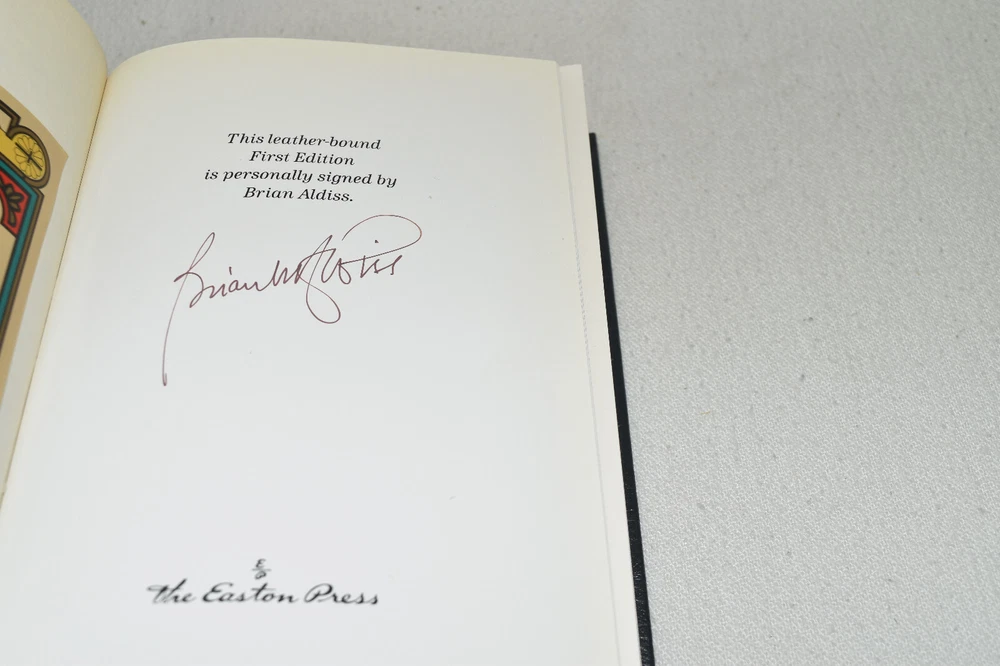 From the Easton Press Signed Collection... Somewhere East of Life PERSONALLY SIGNED by Brian Aldiss Introduction by James Gunn Illustrated by Frank Mayo Easton Press Signed Edition Copyright 1994 by The Easton Press Bound in Premium Full Leather This Signed Edition contains all of the classic Easton Press trimmings: Premium Leather Silk Moire Endleaves Distinctive Cover Design Hubbed Spine, Accented in Real 22KT Gold Satin Ribbon Page Marker Gilded Page Edges Long-lasting, High Quality Acid-neutral Paper Smyth-sewn Pages for Strength and Durability A very scarce title in any condition, this copy is in Fine condition. The front and back covers are both in near perfect condition and the gilded page edges show hardly any wear (see pictures of all sides). There is a blank bookplate on the second page. This book is personally signed by the Author and would be a beautiful addition to your Easton Press collection. Hopefully you can add this book to your collection and enjoy it in the years to come... Please Email Me With Any Questions You Might Have! Shipping Info: Buyer to Pay Shipping and Handling International Bidders Pay Extra Shipping Seller Not Responsible For Uninsured Items Lost or Damaged in Mail Forms of Payment Accepted: Paypal Good luck and happy bidding! Powered by eBay Turbo Lister The free listing tool. List your items fast and easy and manage your active items.