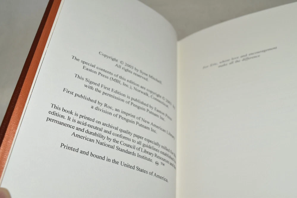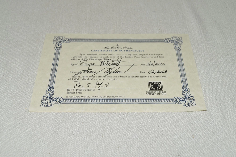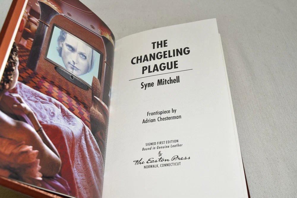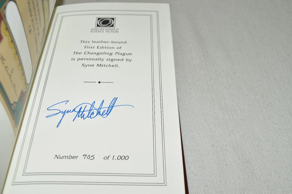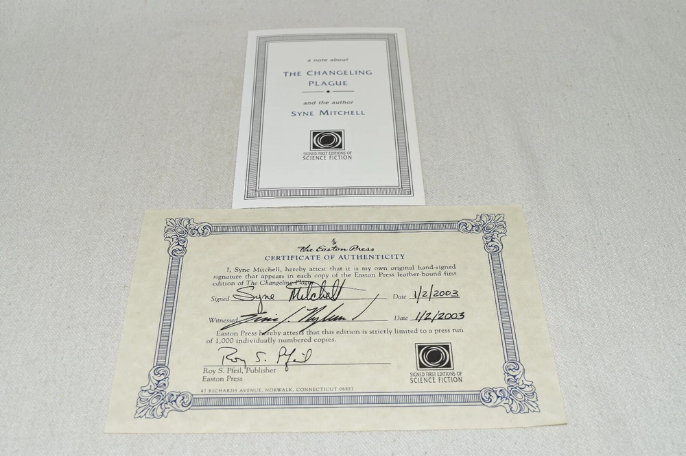 From the Easton Press Signed Collection... The Changeling Plague PERSONALLY SIGNED by Syne Mitchell Frontispiece by Adrian Chesterman Easton Press Signed Edition Copyright 2003 by The Easton Press Bound in Premium Full Leather This Signed Edition contains all of the classic Easton Press trimmings: Premium Leather Silk Moire Endleaves Distinctive Cover Design Hubbed Spine, Accented in Real 22KT Gold Satin Ribbon Page Marker Gilded Page Edges Long-lasting, High Quality Acid-neutral Paper Smyth-sewn Pages for Strength and Durability A very scarce title in any condition, this copy is in Fine condition. The front and back covers are both in terrific condition and the gilded page edges show minor wear (see pictures of all sides). There is a blank bookplate affixed on second page. This book is personally signed by the Author and comes complete with Collector's Notes and a Certificate of Authenticity. It would be a beautiful addition to your Easton Press collection. Hopefully you can add this book to your collection and enjoy it in the years to come... Please Email Me With Any Questions You Might Have! Shipping Info: Buyer to Pay Shipping and Handling International Bidders Pay Extra Shipping Seller Not Responsible For Uninsured Items Lost or Damaged in Mail Forms of Payment Accepted: Paypal Good luck and happy bidding! Powered by eBay Turbo Lister The free listing tool. List your items fast and easy and manage your active items.