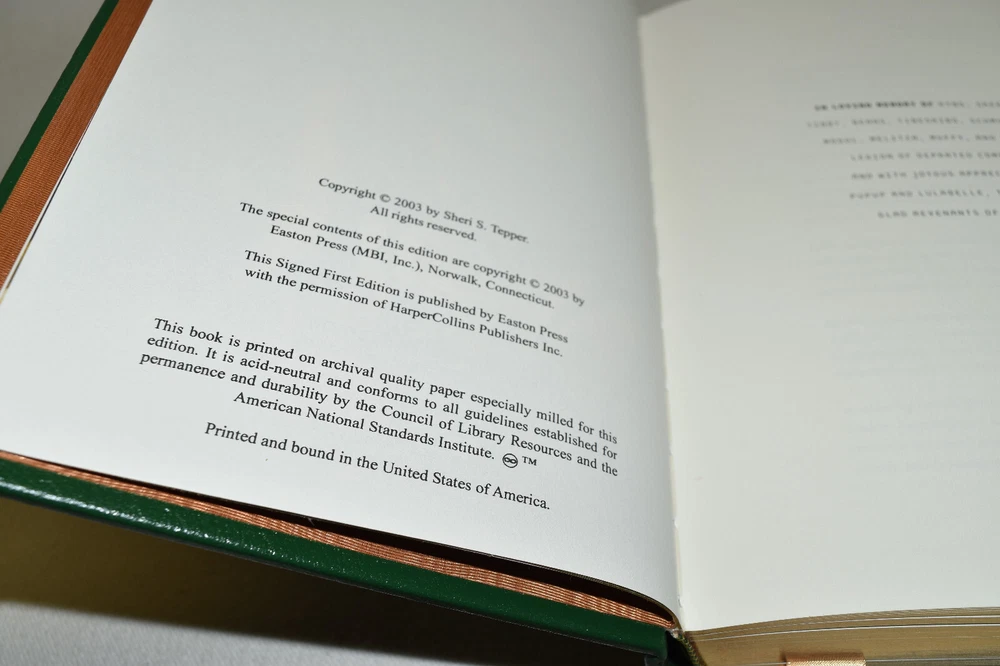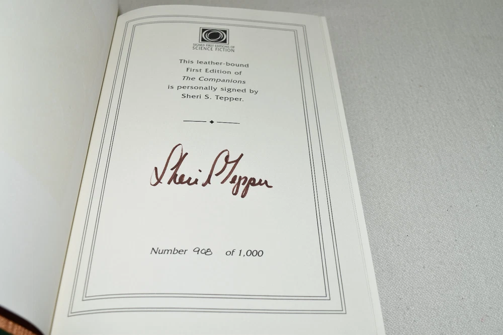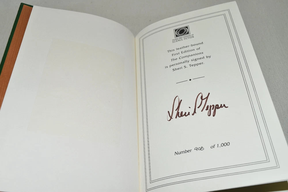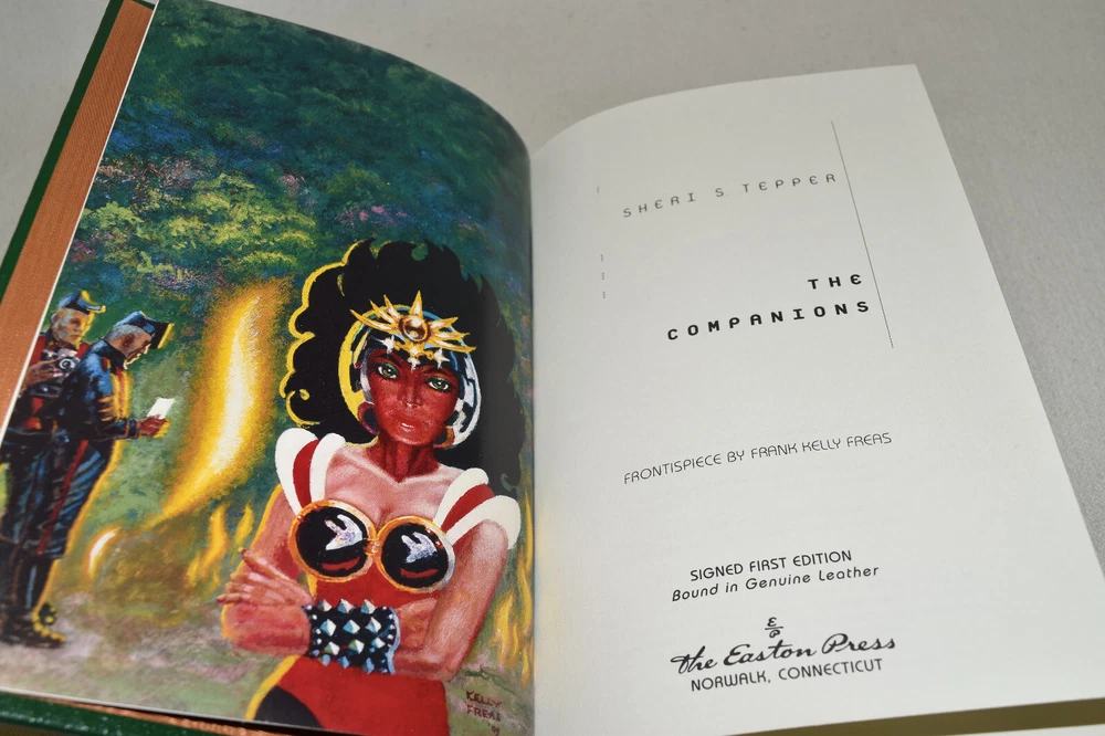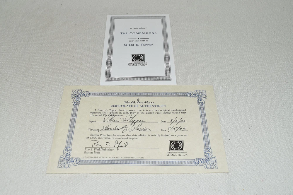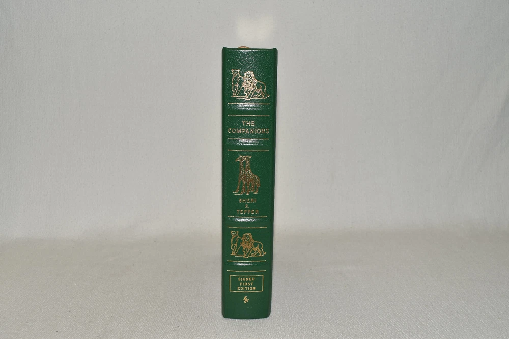 From the Easton Press Signed Collection... The Companions PERSONALLY SIGNED by Author Sheri S. Tepper Frontispiece by Frank Kelly Freas Easton Press Signed Edition Copyright 2003 by The Easton Press Number 908 of 1,000 Signed Copies Bound in Premium Full Leather This Signed Edition contains all of the classic Easton Press trimmings: Premium Leather Silk Moire Endleaves Distinctive Cover Design Hubbed Spine, Accented in Real 22KT Gold Satin Ribbon Page Marker Gilded Page Edges Long-lasting, High Quality Acid-neutral Paper Smyth-sewn Pages for Strength and Durability A very scarce title in any condition, this copy is in Fine condition. The front and back covers are both in terrific condition and the gilded page edges show only minor wear (see pictures). There is faint residue on the second page. This book is personally signed by the Author. It comes complete with Collector's Notes and a Certificate of Authenticity and would be a beautiful addition to your Easton Press collection. Overall, this copy is a grade collector's book. This book is very elusive in this superior condition, as only a limited number of them were ever published, so now is the time to act. Hopefully you can add this book to your collection and enjoy it in the years to come... Please Email Me With Any Questions You Might Have! Shipping Info: Buyer to Pay Shipping and Handling International Bidders Pay Extra Shipping Seller Not Responsible For Uninsured Items Lost or Damaged in Mail Forms of Payment Accepted: Paypal Good luck and happy bidding! Powered by eBay Turbo Lister The free listing tool. List your items fast and easy and manage your active items.