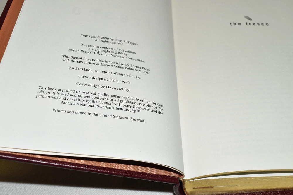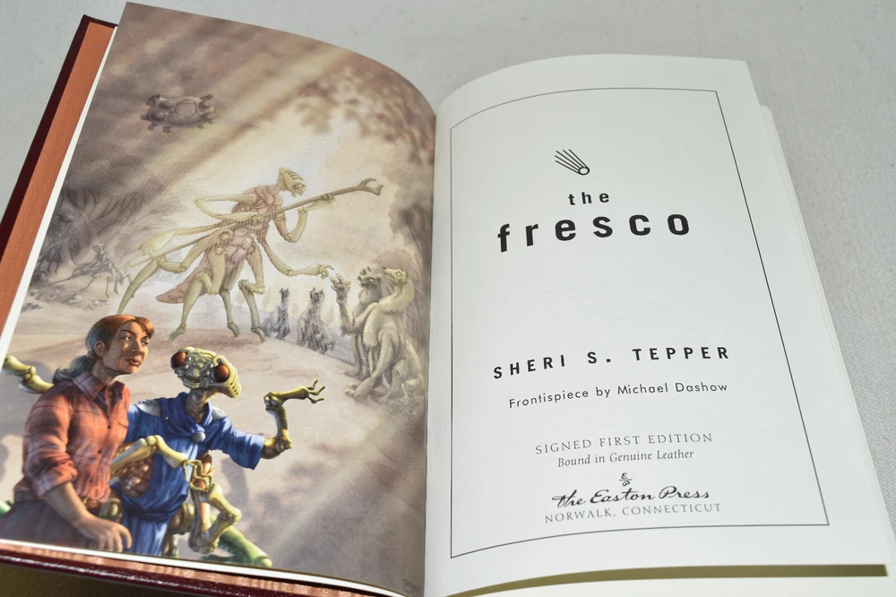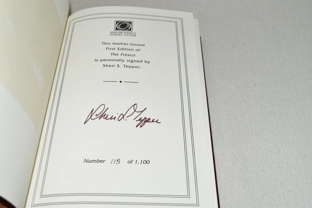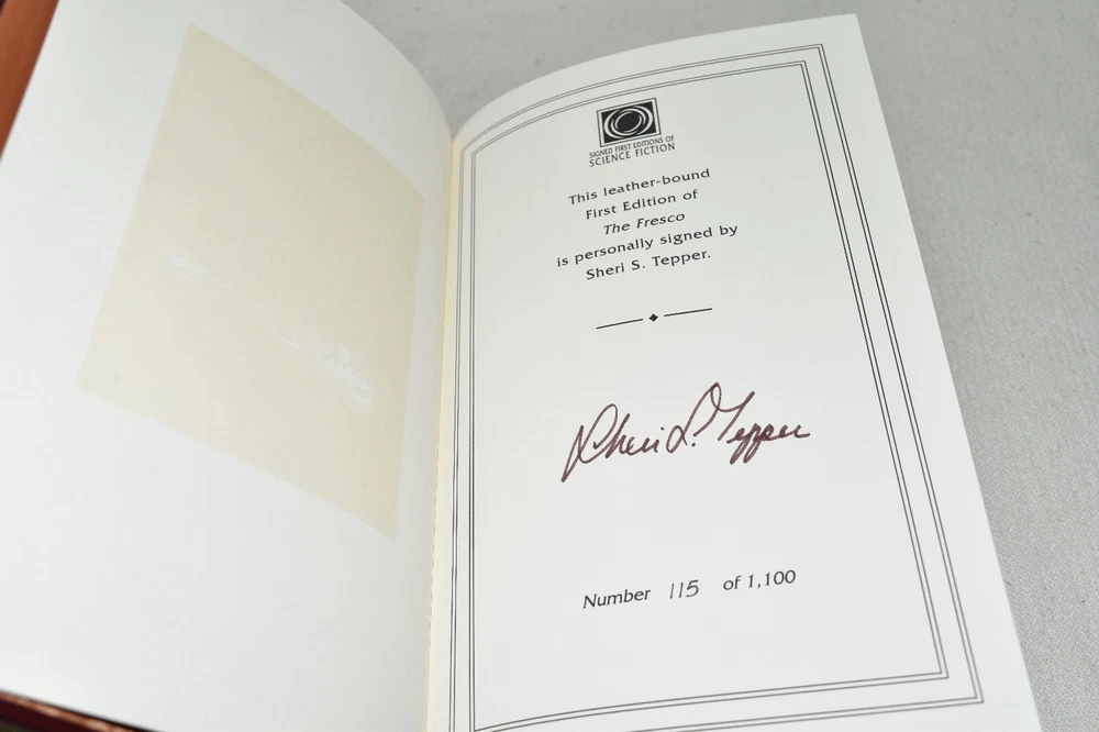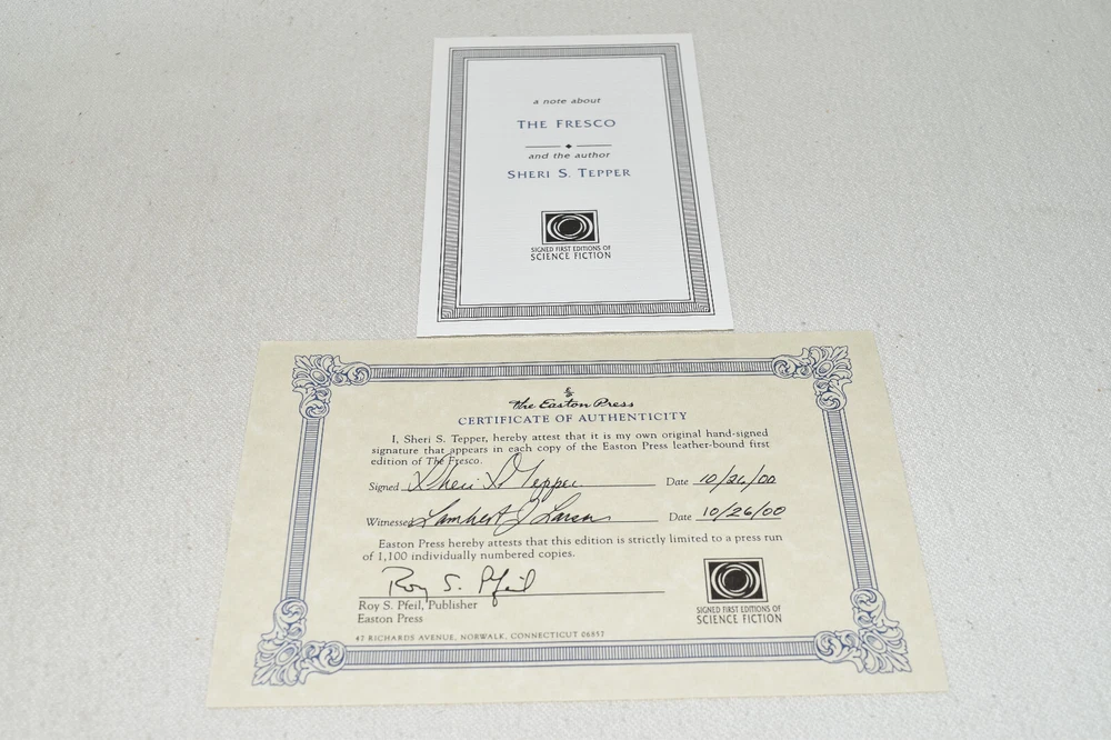 From the Easton Press Signed Collection... The Fresco PERSONALLY SIGNED by Author Sheri S. Tepper Frontispiece by Michael Dashow Easton Press Signed Edition Copyright 2000 by The Easton Press Number 115 of 1,100 Signed Copies Bound in Premium Full Leather This Signed Edition contains all of the classic Easton Press trimmings: Premium Leather Silk Moire Endleaves Distinctive Cover Design Hubbed Spine, Accented in Real 22KT Gold Satin Ribbon Page Marker Gilded Page Edges Long-lasting, High Quality Acid-neutral Paper Smyth-sewn Pages for Strength and Durability A very scarce title in any condition, this copy is in Fine condition. The front and back covers are both in terrific condition and the gilded page edges show only faint wear (see pictures). There is minor residue inside the second page. This book is personally signed by the Author. It comes complete with Collector's Notes and a Certificate of Authenticity and would be a beautiful addition to your Easton Press collection. Overall, this copy is a grade collector's book. This book is very elusive in this superior condition, as only a limited number of them were ever published, so now is the time to act. Hopefully you can add this book to your collection and enjoy it in the years to come... Please Email Me With Any Questions You Might Have! Shipping Info: Buyer to Pay Shipping and Handling International Bidders Pay Extra Shipping Seller Not Responsible For Uninsured Items Lost or Damaged in Mail Forms of Payment Accepted: Paypal Good luck and happy bidding! Powered by eBay Turbo Lister The free listing tool. List your items fast and easy and manage your active items.
