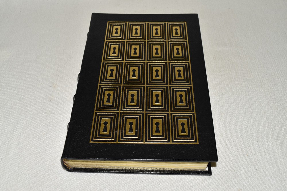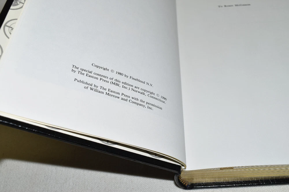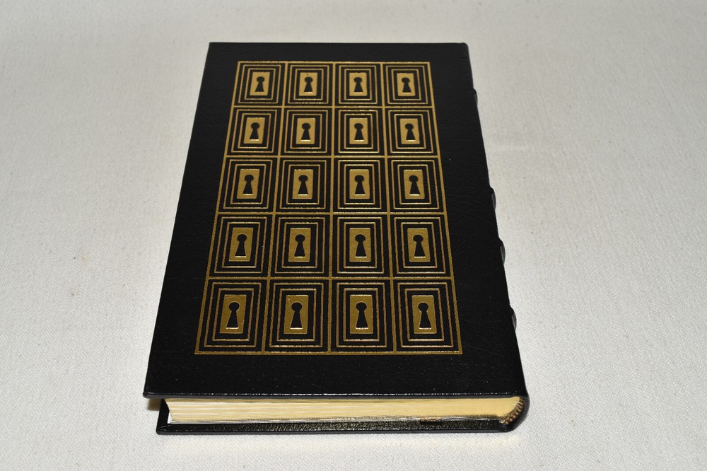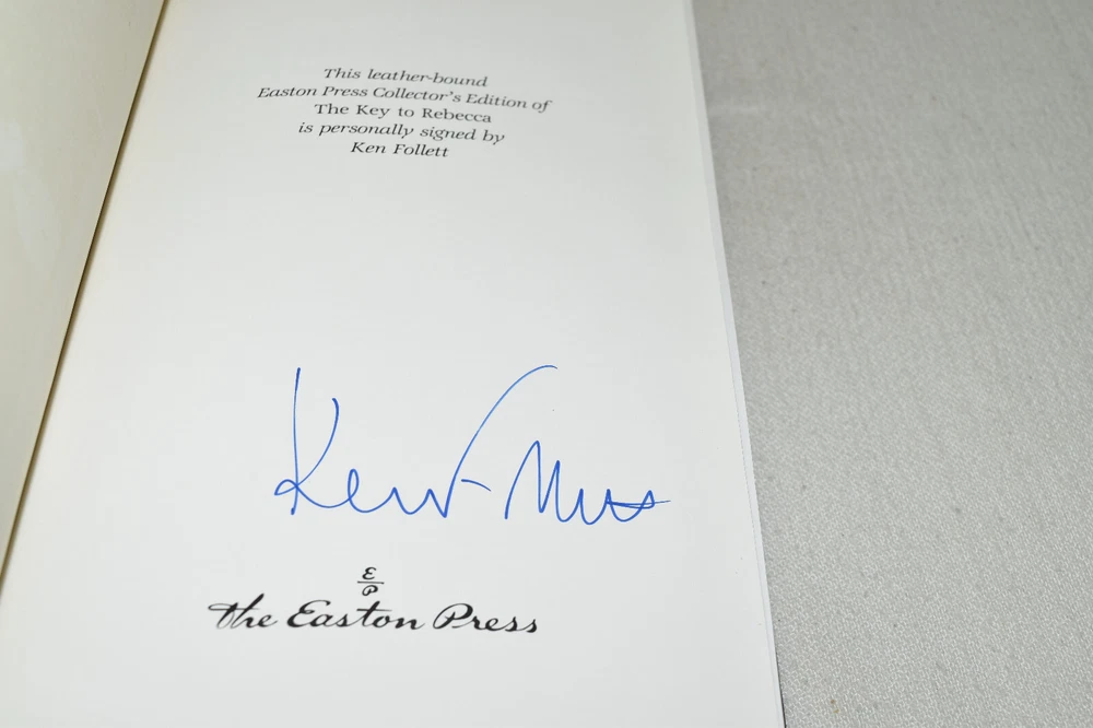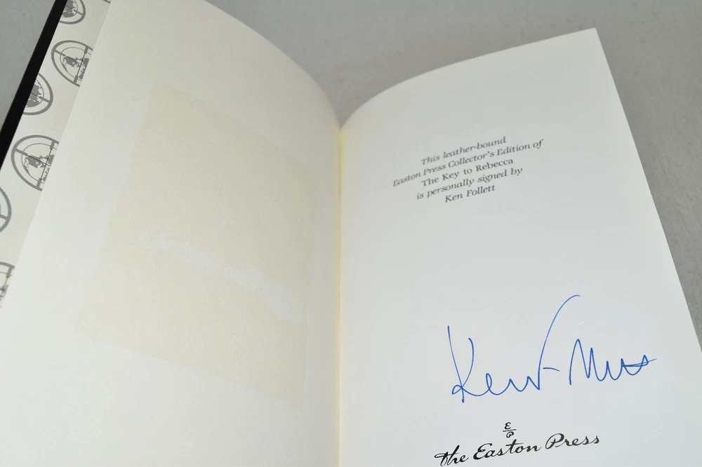 From the Easton Press Spy Collection... The Key to Rebecca PERSONALLY SIGNED by Ken Follett Collector's Edition Copyright 1990 by The Easton Press Bound in Premium Full Leather This volume contains all of the classic Easton Press trimmings: Premium Leather Decorated Endleaves Distinctive Cover Design Hubbed Spine, Accented in Real 22KT Gold Satin Ribbon Page Marker Gilded Page Edges Long-lasting, High Quality Acid-neutral Paper Smyth-sewn Pages for Strength and Durability Beautiful Illustrations A very scarce title in any condition, this Easton Press Limited Edition is in Fine condition. The front and back covers are both in near perfect condition and the gilded page edges show only faint wear (see pictures of all gilt sides). There is faint bookplate residue on the second page. This book was published by Easton Press and would be a beautiful addition to your Easton Press collection. Overall, this copy is a grade collector's book. This book is very elusive in this superior condition, as only a limited number of them were ever published, so now is the time to act. Hopefully you can add this book to your collection and enjoy it in the years to come... Please Email Me With Any Questions You Might Have! Shipping Info: Buyer to Pay Shipping and Handling International Bidders Pay Extra Shipping Seller Not Responsible For Uninsured Items Lost or Damaged in Mail Forms of Payment Accepted: Paypal Good luck and happy bidding! Powered by eBay Turbo Lister The free listing tool. List your items fast and easy and manage your active items.