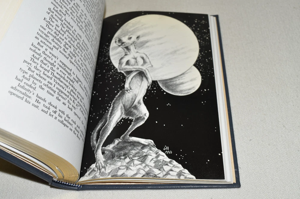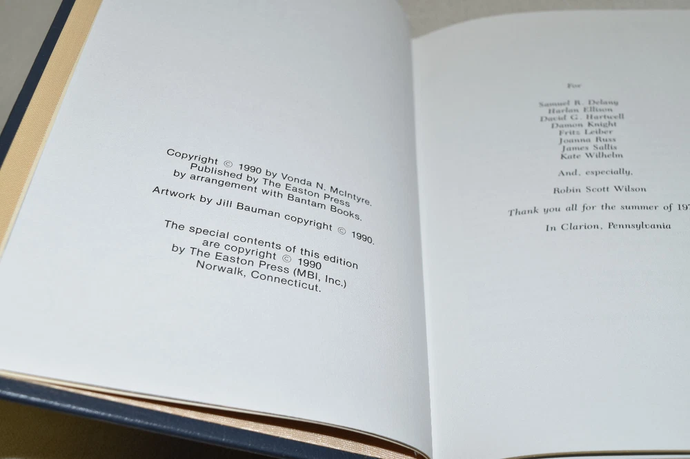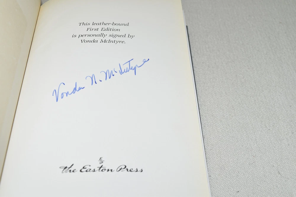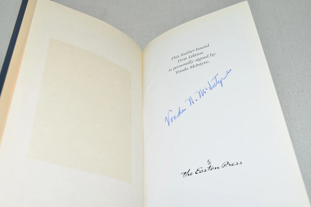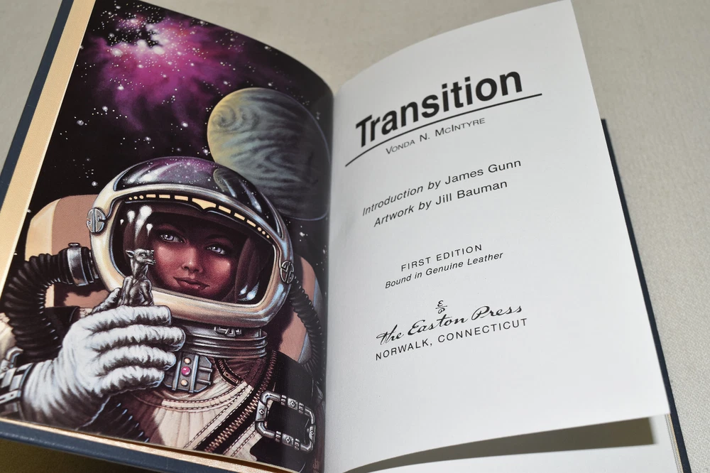 From the Easton Press Signed Collection... Transition PERSONALLY SIGNED by Author Vonda McIntyre Introduction by James Gunn Artwork by Jill Bauman Easton Press Signed Edition Copyright 1990 by The Easton Press Bound in Premium Full Leather This Signed Edition contains all of the classic Easton Press trimmings: Premium Leather Silk Moire Endleaves Distinctive Cover Design Hubbed Spine, Accented in Real 22KT Gold Satin Ribbon Page Marker Gilded Page Edges Long-lasting, High Quality Acid-neutral Paper Smyth-sewn Pages for Strength and Durability A very scarce title in any condition, this copy is in Fine condition. The front and back covers are both in terrific condition and the gilded page edges show only faint wear (see pictures). There is minor residue inside the second page. This book is personally signed by the Author and would be a beautiful addition to your Easton Press collection. Overall, this copy is a grade collector's book. This book is very elusive in this superior condition, as only a limited number of them were ever published, so now is the time to act. Hopefully you can add this book to your collection and enjoy it in the years to come... Please Email Me With Any Questions You Might Have! Shipping Info: Buyer to Pay Shipping and Handling International Bidders Pay Extra Shipping Seller Not Responsible For Uninsured Items Lost or Damaged in Mail Forms of Payment Accepted: Paypal Good luck and happy bidding! Powered by eBay Turbo Lister The free listing tool. List your items fast and easy and manage your active items.