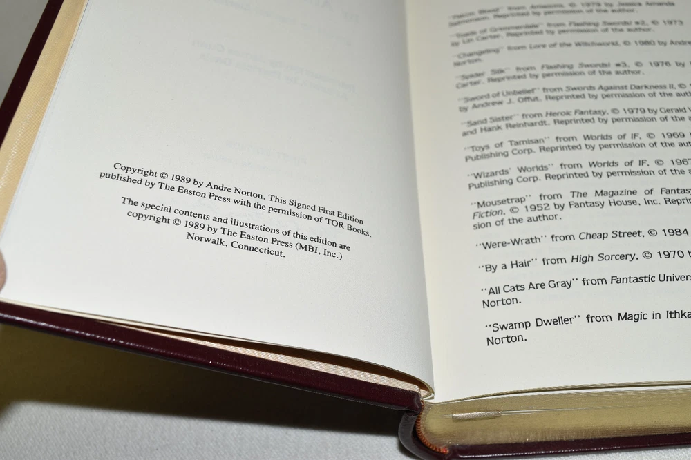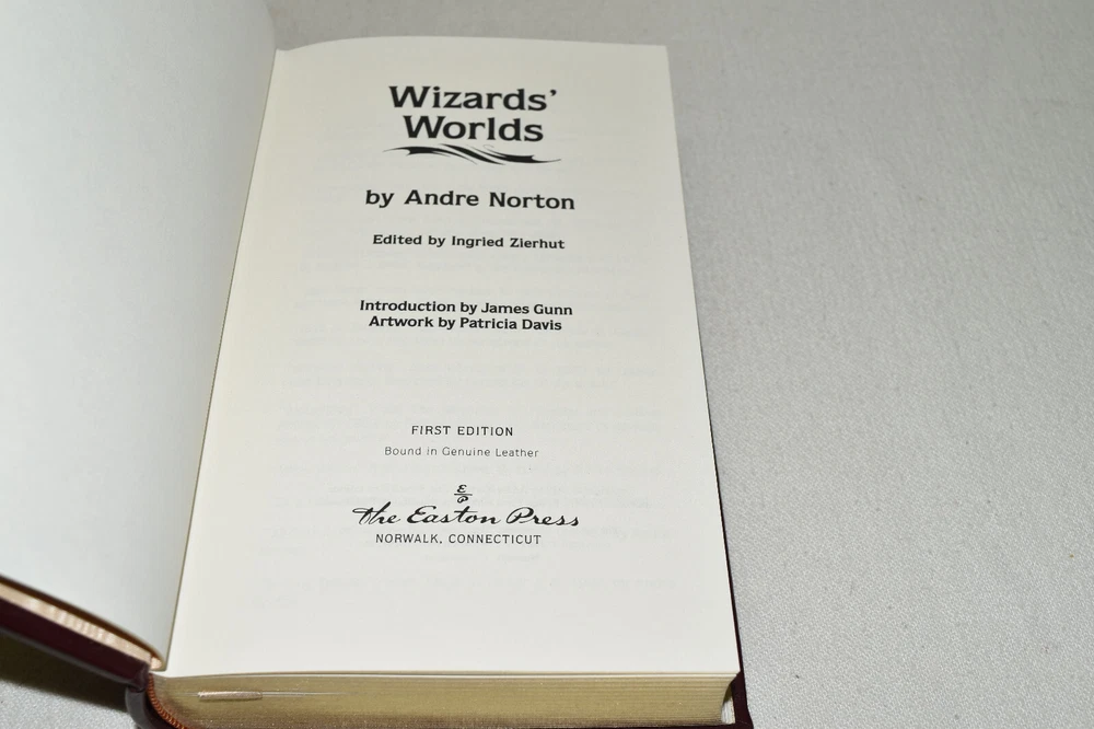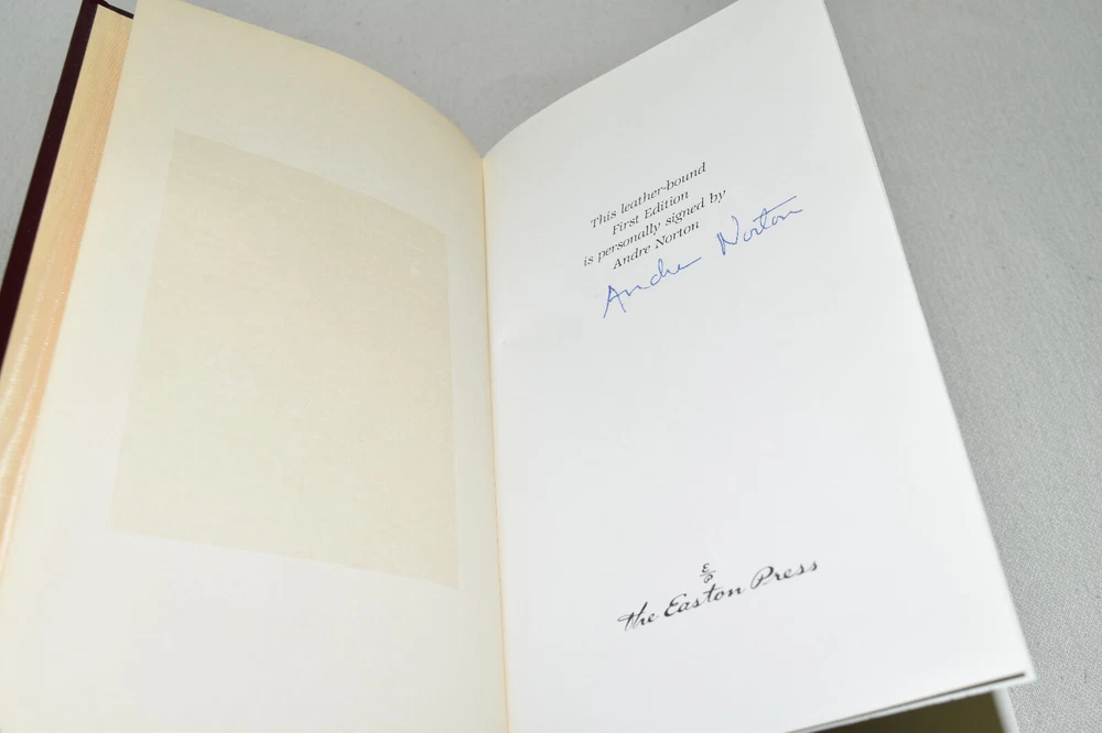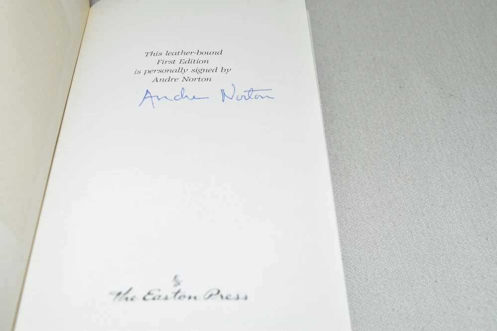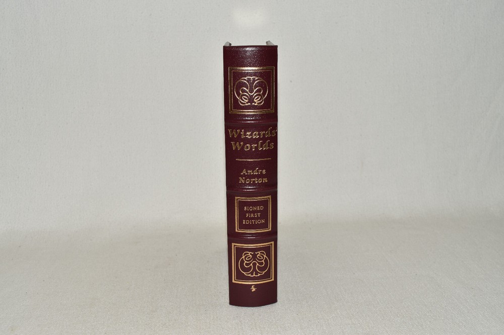 From the Easton Press Signed Collection... Wizard's World PERSONALLY SIGNED by Author Andre Norton Introduction by James Gunn Frontispiece by Patricia Davis Easton Press Signed Edition Copyright 1989 by The Easton Press Bound in Premium Full Leather This Signed Edition contains all of the classic Easton Press trimmings: Premium Leather Silk Moire Endleaves Distinctive Cover Design Hubbed Spine, Accented in Real 22KT Gold Satin Ribbon Page Marker Gilded Page Edges Long-lasting, High Quality Acid-neutral Paper Smyth-sewn Pages for Strength and Durability A very scarce title in any condition, this copy is in Fine condition. The front and back covers are both in terrific condition and the gilded page edges show only faint wear (see pictures of all sides). There is faint residue on the second page. This book is personally signed by the Author and would be a beautiful addition to your Easton Press collection. Hopefully you can add this book to your collection and enjoy it in the years to come... Please Email Me With Any Questions You Might Have! Shipping Info: Buyer to Pay Shipping and Handling International Bidders Pay Extra Shipping Seller Not Responsible For Uninsured Items Lost or Damaged in Mail Forms of Payment Accepted: Paypal Good luck and happy bidding! Powered by eBay Turbo Lister The free listing tool. List your items fast and easy and manage your active items.