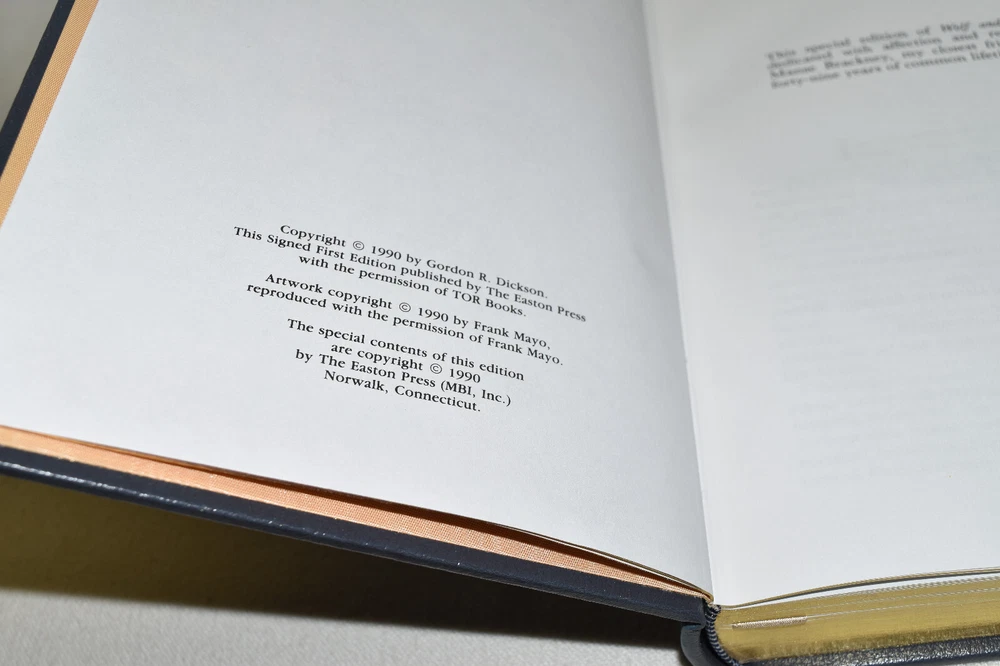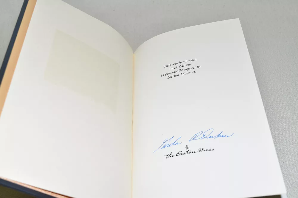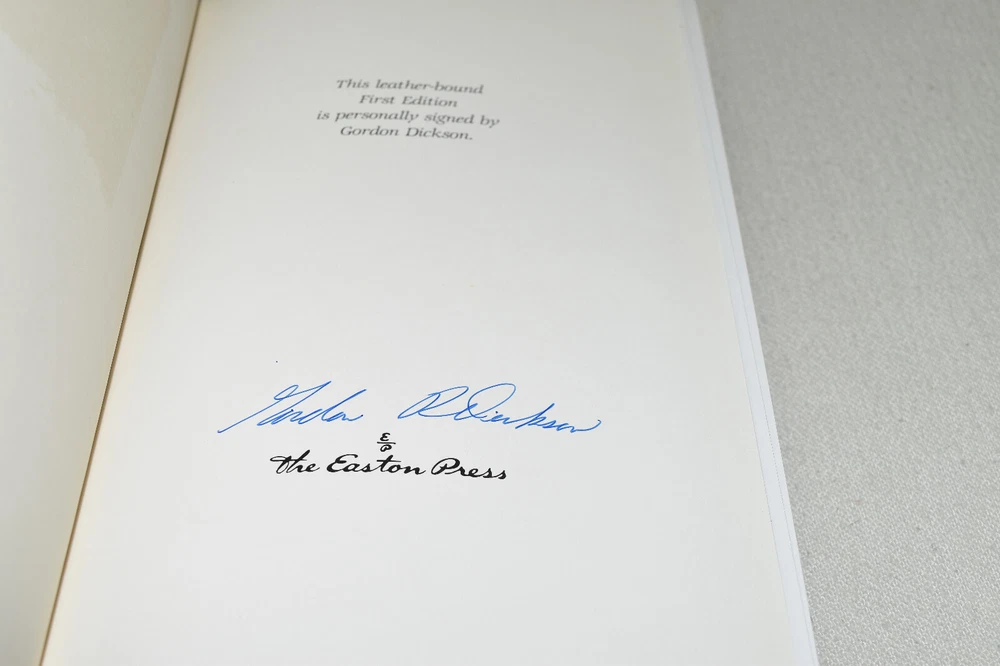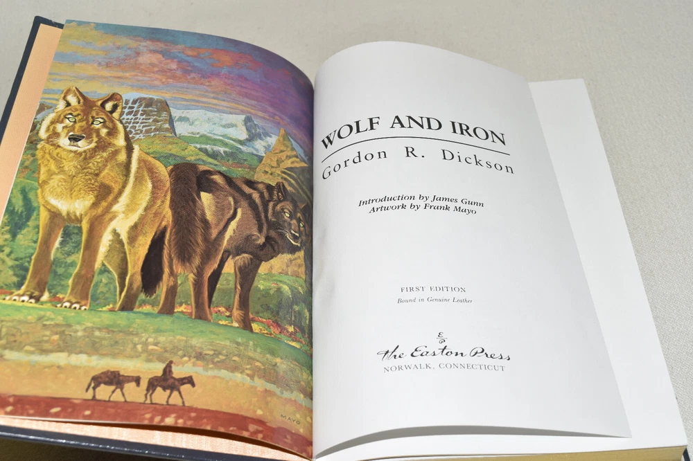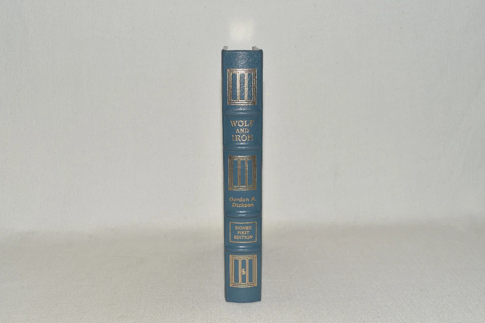 From the Easton Press Signed Collection... Wolf and Iron PERSONALLY SIGNED by Author Gordon R. Dickson Introduction by James Gunn Artwork by Frank Mayo Easton Press Signed Edition Copyright 1990 by The Easton Press Bound in Premium Full Leather This Signed Edition contains all of the classic Easton Press trimmings: Premium Leather Silk Moire Endleaves Distinctive Cover Design Hubbed Spine, Accented in Real 22KT Gold Satin Ribbon Page Marker Gilded Page Edges Long-lasting, High Quality Acid-neutral Paper Smyth-sewn Pages for Strength and Durability A very scarce title in any condition, this copy is in Fine condition. The front and back covers are both in terrific condition and the gilded page edges show only minor wear (see pictures). There is faint residue inside the second page. This book is personally signed by Gordon Dickson. It would be a beautiful addition to your Easton Press collection. Overall, this copy is a grade collector's book. This book is very elusive in this superior condition, as only a limited number of them were ever published, so now is the time to act. Hopefully you can add this book to your collection and enjoy it in the years to come... Please Email Me With Any Questions You Might Have! Shipping Info: Buyer to Pay Shipping and Handling International Bidders Pay Extra Shipping Seller Not Responsible For Uninsured Items Lost or Damaged in Mail Forms of Payment Accepted: Paypal Good luck and happy bidding! Powered by eBay Turbo Lister The free listing tool. List your items fast and easy and manage your active items.
