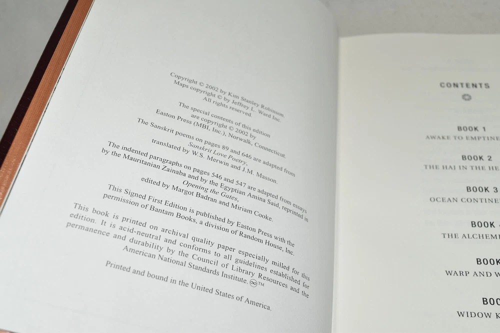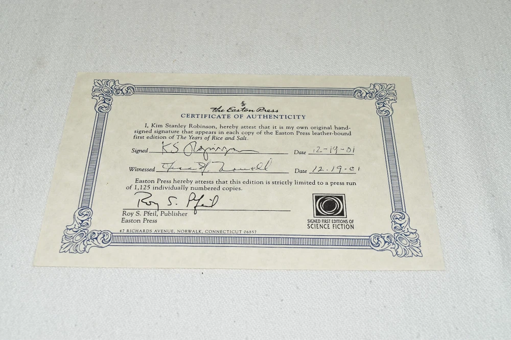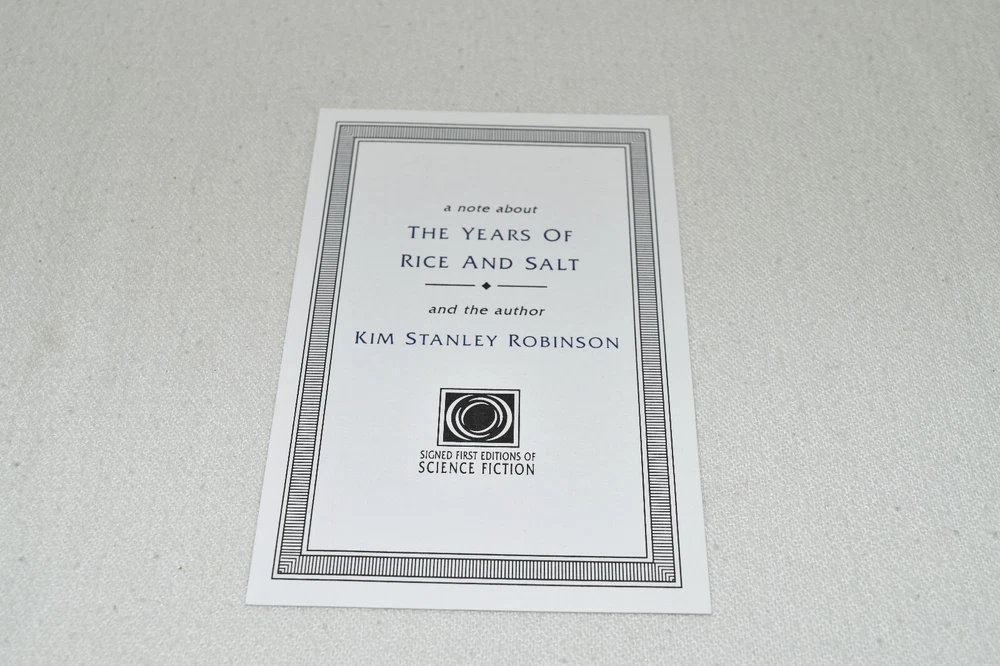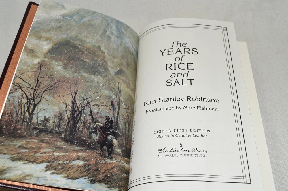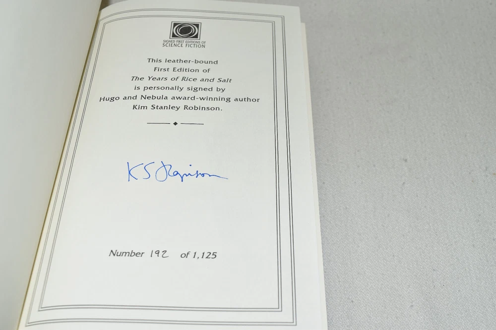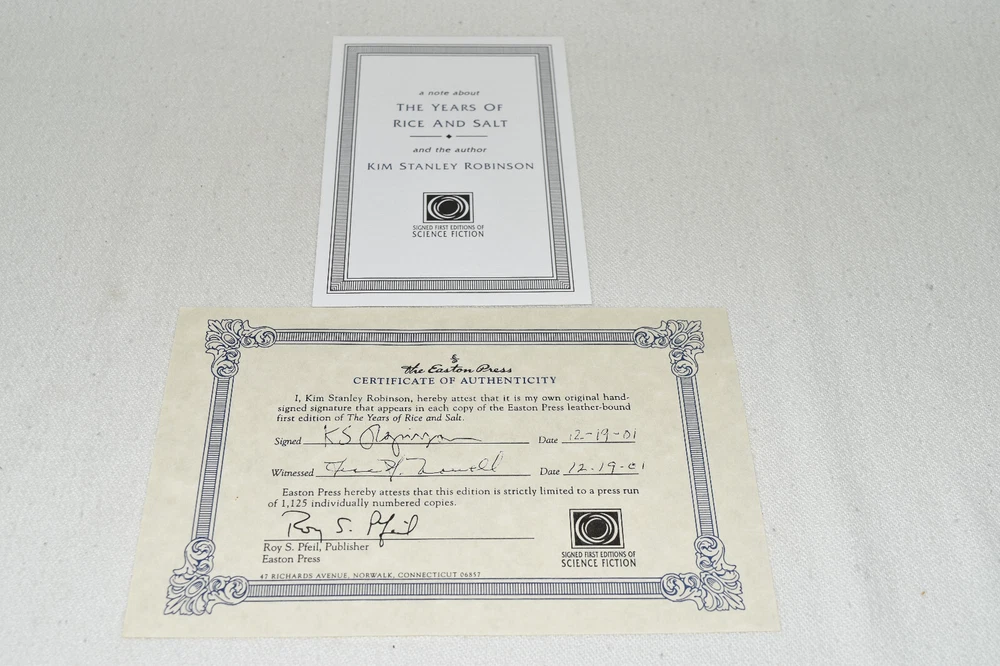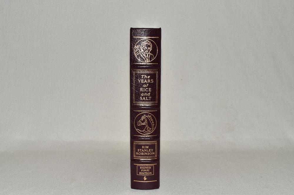 From the Easton Press Signed Collection... The Years of Rice and Salt PERSONALLY SIGNED by Kim Stanley Robinson Illustrated by Marc Fishman Limited to 1,125 Copies, this is Number 192 Easton Press Signed Edition Copyright 2002 by The Easton Press Bound in Premium Full Leather This Signed Edition contains all of the classic Easton Press trimmings: Premium Leather Silk Moire Endleaves Distinctive Cover Design Hubbed Spine, Accented in Real 22KT Gold Satin Ribbon Page Marker Gilded Page Edges Long-lasting, High Quality Acid-neutral Paper Smyth-sewn Pages for Strength and Durability A very scarce title in any condition, this copy is in Fine condition. The front and back covers are both in near perfect condition and the gilded page edges show minor wear (see pictures of all sides). There is a blank bookplate attached to the second page. This book is personally signed by the Author and comes with Collector's Notes and a Certificate of Authenticity. It would be a beautiful addition to your Easton Press collection. Hopefully you can add this book to your collection and enjoy it in the years to come... Please Email Me With Any Questions You Might Have! Shipping Info: Buyer to Pay Shipping and Handling International Bidders Pay Extra Shipping Seller Not Responsible For Uninsured Items Lost or Damaged in Mail Forms of Payment Accepted: Paypal Good luck and happy bidding! Powered by eBay Turbo Lister The free listing tool. List your items fast and easy and manage your active items.