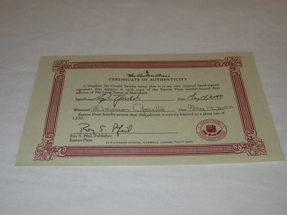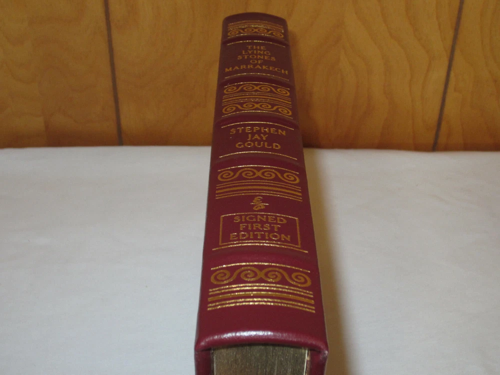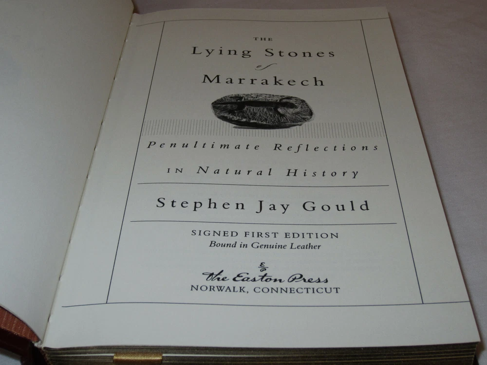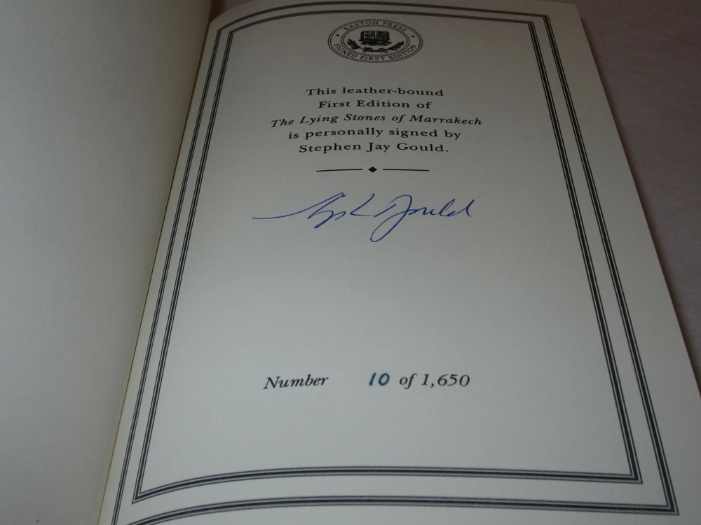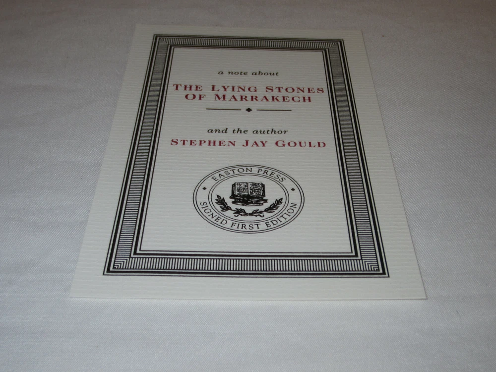 From the Easton Press Signed First Editions Collection... The Lying Stones of Marrakech Penultimate Reflections in Natural History PERSONALLY SIGNED by Author Steven Jay Gould Easton Press Signed First Edition Copyright 2000 by The Easton Press Bound in Premium Full Leather This Signed First Edition contains all of the classic Easton Press trimmings: Premium Leather Silk Moire Endleaves Distinctive Cover Design Hubbed Spine, Accented in Real 22KT Gold Satin Ribbon Page Marker Gilded Page Edges Long-lasting, High Quality Acid-neutral Paper Smyth-sewn Pages for Strength and Durability A very scarce title in any condition, this copy is in Fine condition. The front and back covers are both in near perfect condition and the gilded page edges show hardly any wear! There is NO attached bookplate nor any other signs of previous ownership. This book is personally signed by Steven Jay Gould. It comes with a Certificate of Authenticity and Collector's Notes and would be a beautiful addition to your Easton Press collection. Overall, this copy is a grade collector's book. This book is very elusive in this superior condition, as only a limited number of them were ever published, so now is the time to act. Hopefully you can add this book to your collection and enjoy it in the years to come... Please Email Me With Any Questions You Might Have! Shipping Info: Buyer to Pay Shipping and Handling International Bidders Pay Extra Shipping Seller Not Responsible For Uninsured Items Lost or Damaged in Mail Forms of Payment Accepted: Paypal Good luck and happy bidding! Powered by eBay Turbo Lister The free listing tool. List your items fast and easy and manage your active items.