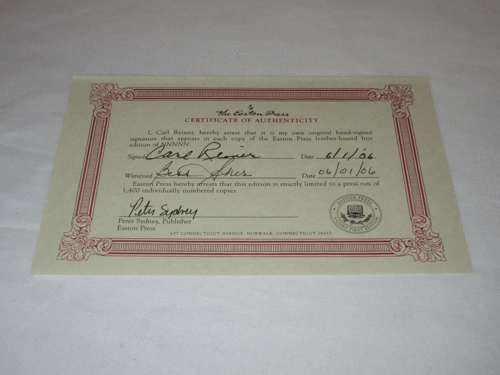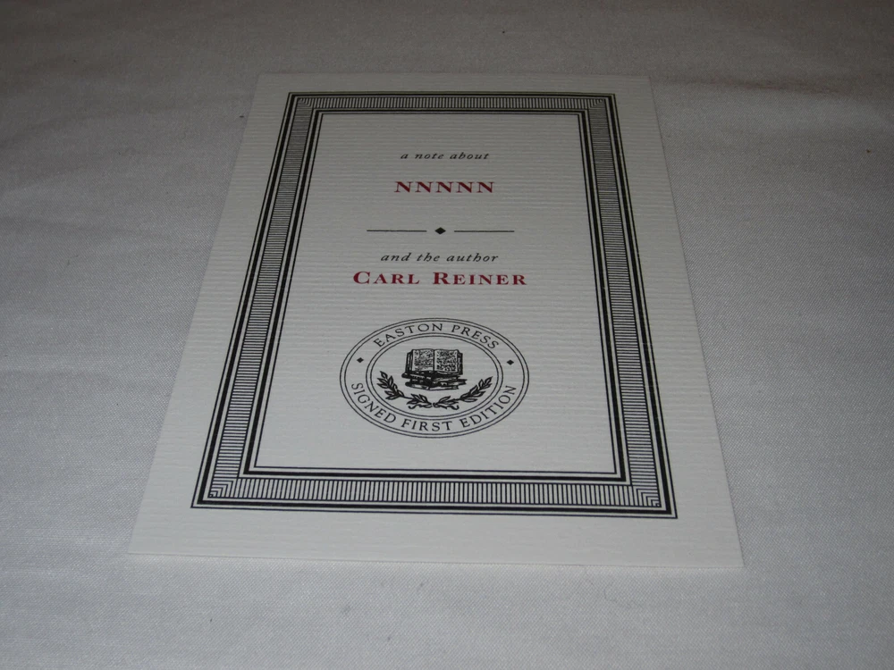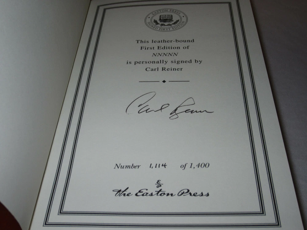 From the Easton Press Signed First Editions Collection... NNNNN PERSONALLY SIGNED by Author Carl Reiner Easton Press Signed First Edition Copyright 2006 by The Easton Press Number 1,114 of 1,400 Signed Copies Bound in Premium Full Leather This Signed First Edition contains all of the classic Easton Press trimmings: Premium Leather Silk Moire Endleaves Distinctive Cover Design Hubbed Spine, Accented in Real 22KT Gold Satin Ribbon Page Marker Gilded Page Edges Long-lasting, High Quality Acid-neutral Paper Smyth-sewn Pages for Strength and Durability A very scarce title in any condition, this copy is in Fine condition. The front and back covers are both in near perfect condition and the gilded page edges show hardly any wear! There is NO attached bookplate nor any other signs of previous ownership. This edition is limited to only 1,400 signed copies; this being number 1,114. This book is personally signed by Carl Reiner. It comes complete with Collector's Notes and a Certificate of Authenticity and would be a beautiful addition to your Easton Press collection. Overall, this copy is a grade collector's book. This book is very elusive in this superior condition, as only a limited number of them were ever published, so now is the time to act. Hopefully you can add this book to your collection and enjoy it in the years to come... Please Email Me With Any Questions You Might Have! Shipping Info: Buyer to Pay Shipping and Handling International Bidders Pay Extra Shipping Seller Not Responsible For Uninsured Items Lost or Damaged in Mail Forms of Payment Accepted: Paypal Good luck and happy bidding! Powered by eBay Turbo Lister The free listing tool. List your items fast and easy and manage your active items.