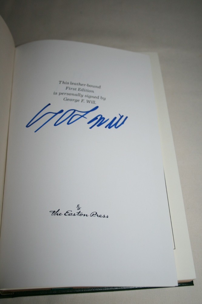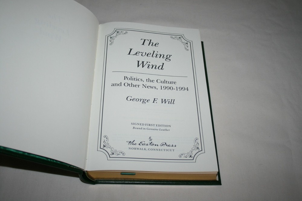 From the Easton Press Signed First Edition Collection... The Leveling Wind PERSONALLY SIGNED by Author George F. Will Easton Press Signed First Edition Copyright 1995 by The Easton Press Bound in Premium Full Leather This Signed First Edition contains all of the classic Easton Press trimmings: Premium Leather Silk Moire Endleaves Distinctive Cover Design Hubbed Spine, Accented in Real 22KT Gold Satin Ribbon Page Marker Gilded Page Edges Long-lasting, High Quality Acid-neutral Paper Smyth-sewn Pages for Strength and Durability A very scarce title in any condition, this Signed First Edition is in Absolute Fine and Unread condition. The front and back covers are both in Perfect condition and the gilded page edges show no wear at all! The binding is tight and square without spine lean. There is NO attached bookplate nor any other signs of previous ownership. This book is personally signed by George F. Will and would be a beautiful addition to your Easton Press collection. Overall, this copy is a grade collector's book. This book is very elusive in this superior condition, as only a limited number of them were ever published, so now is the time to act. Hopefully you can add this book to your collection and enjoy it in the years to come... Please Email Me With Any Questions You Might Have! Shipping Info: Buyer to Pay Shipping and Handling International Bidders Pay Extra Shipping Seller Not Responsible For Uninsured Items Lost or Damaged in Mail Forms of Payment Accepted: Paypal Good luck and happy bidding!