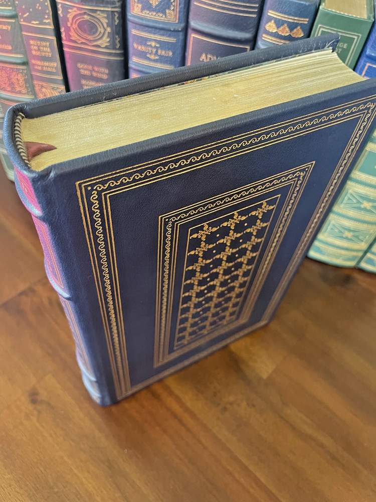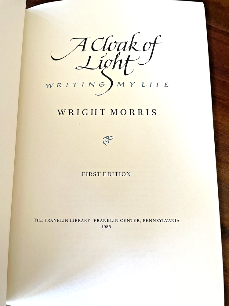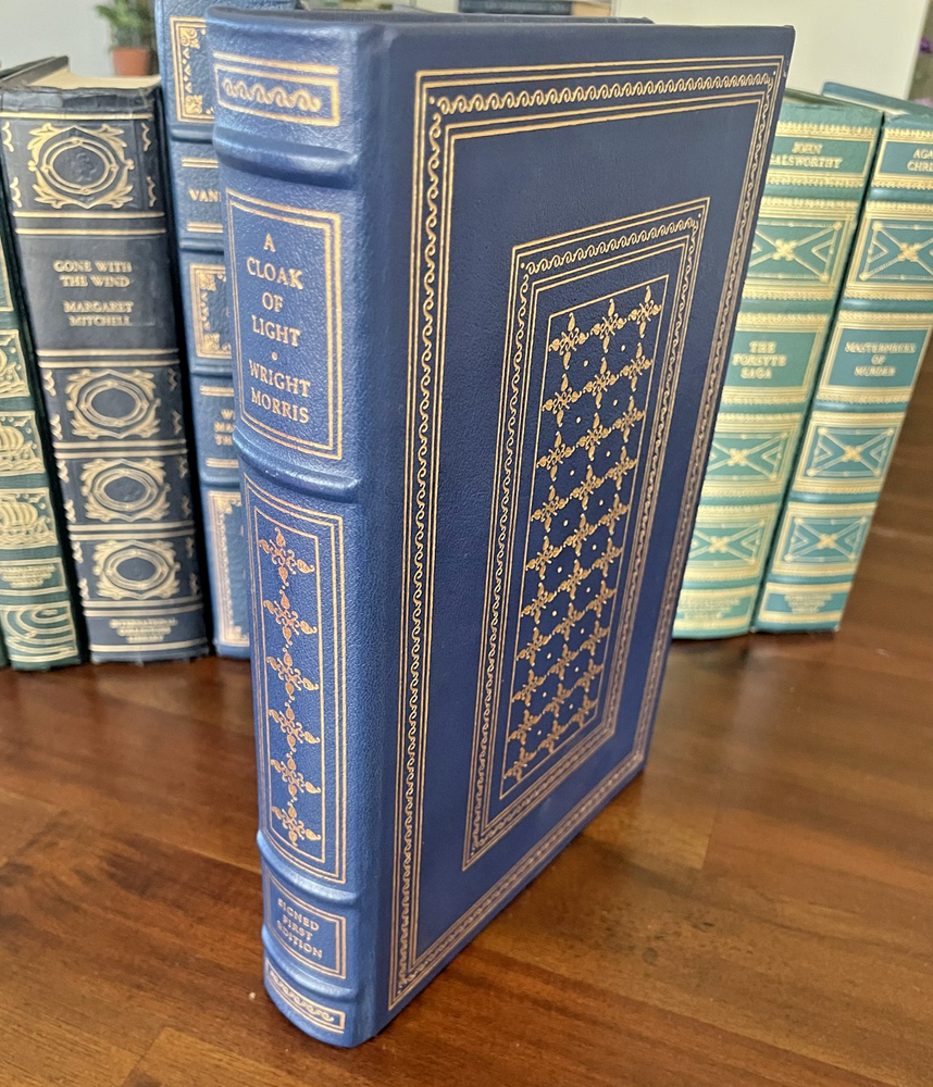 SIGNED FIRST EDITION FULLY LEATHERBOUND FRANKLIN LIBRARY A Cloak of Light by Wright Morris, published in 1985 Description Bound in fine genuine leather with 22 karat gold decorations Silk moire endpapers Raised spine hubs Pages are made of high-quality paper that are sewn in for strength and durability Edges of all pages are gilded with 22 karat gold Sewn-in satin ribbon bookmark Measures approximately 9 inches tall, 1 inch wide (spine), and 6 inches deep (cover) Condition Good used condition Minimal wear No obvious markings on pages
