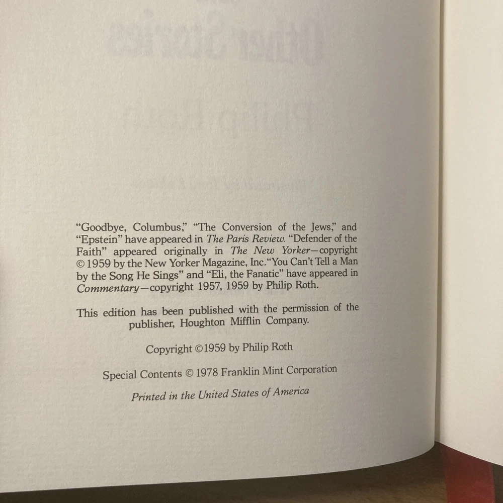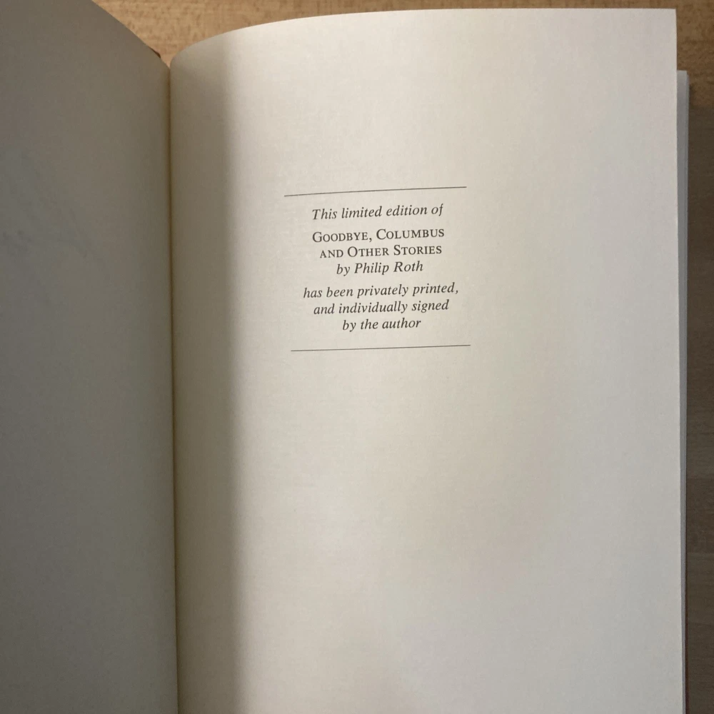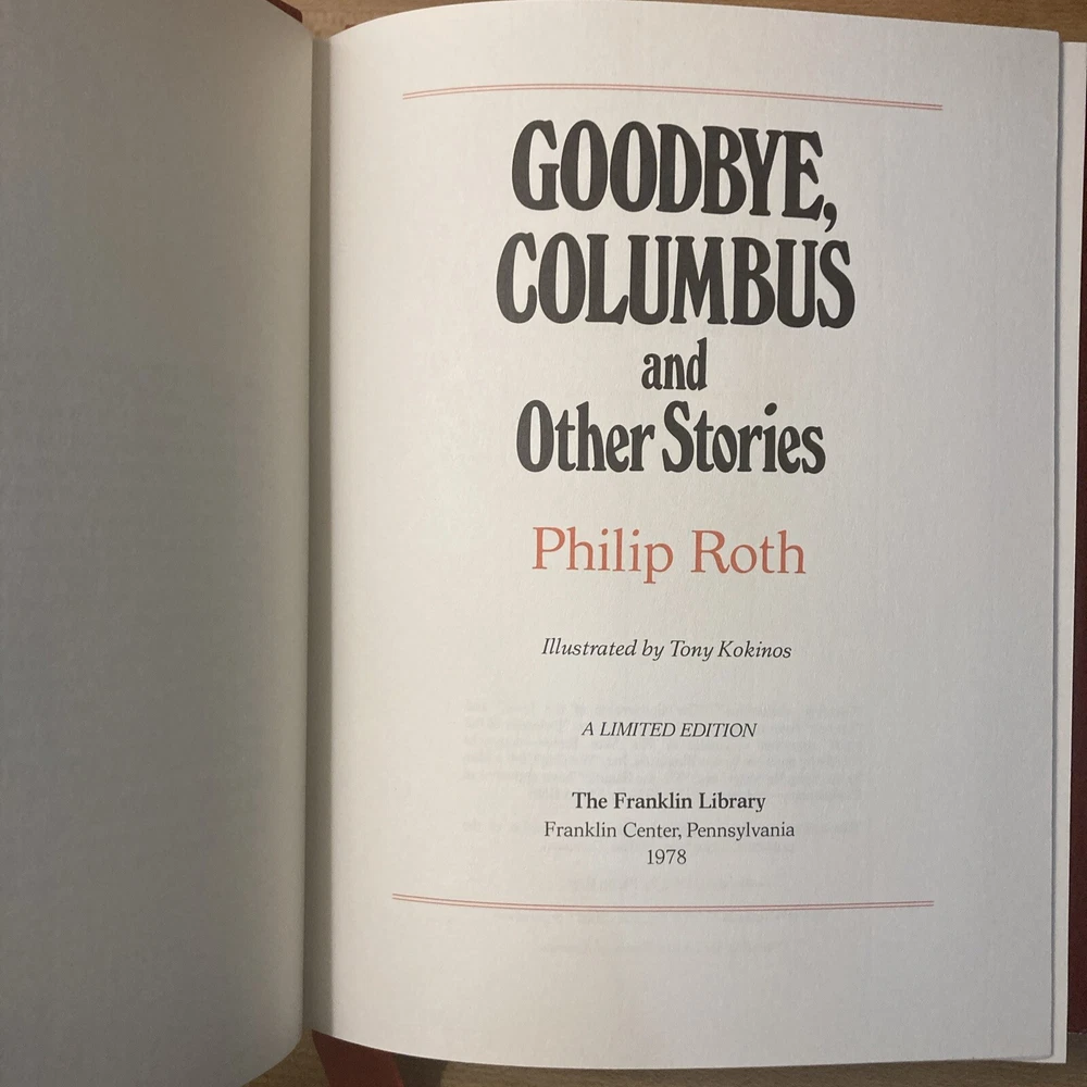From the Franklin Library Collection... Goodbye Columbus and Other Stories PERSONALLY SIGNED by Philip Roth Frontispiece by Tony Kokinos A Limited First Edition Copyright 1978 by The Franklin Library Premium Full Leather Binding This Signed First Edition contains all of these classic Franklin Library trimmings: Premium Leather Binding Silk Moire Endleaves Distinctive Cover Design Hubbed Spine, Acccented in Gold Satin Ribbon Page Marker Gilded Page Edges Long-lasting, High Quality Acid-neutral Paper Beautiful Illustrations A very scarce title in any condition, this copy is in Excellent condition. The front and back covers are both in terrific condition and the gilded page edges show only minor wear. There are no markings, bookplates, or other signs of prior ownership in this book! This book is part of the Signed First Editions Collection published by The Franklin Library and is PERSONALLY SIGNED by Philip Roth. It would be a beautiful addition to your Franklin Library book collection. Hopefully you can add this book to your collection and enjoy it in the years to come...