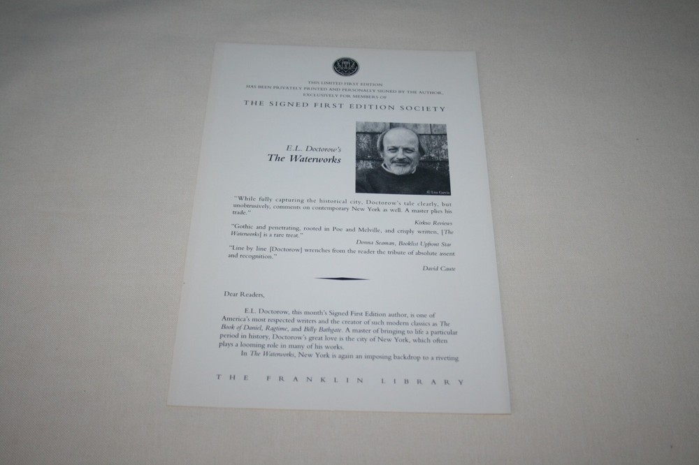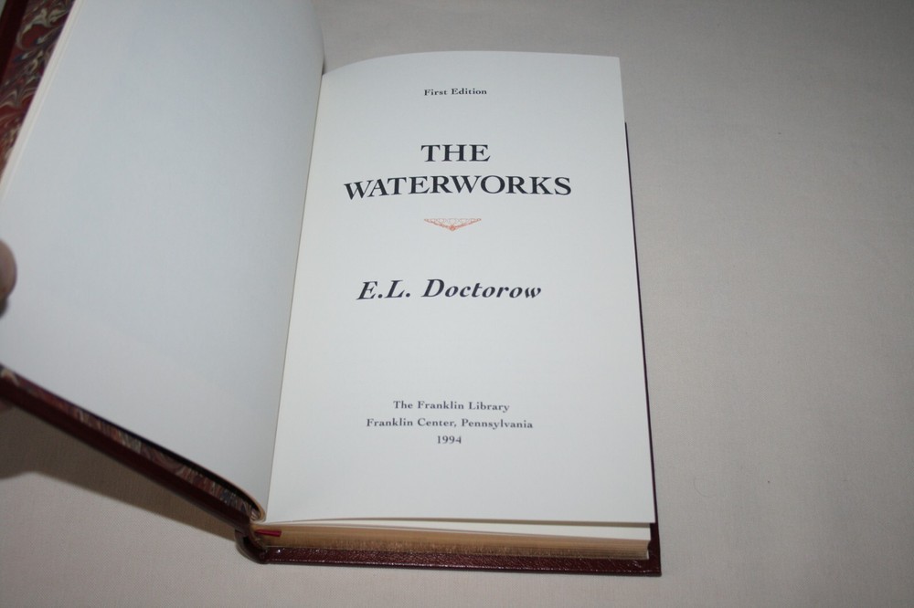 From the Franklin Library Collection... The Waterworks Personally Signed by E. L. Doctorow Copyright 1994 by The Franklin Library! SIGNED FIRST EDITION! Bound in Premium Full Leather! This Signed First Edition contains all of these classic Franklin Library trimmings: Premium Leather Binding Marbled Endleaves Distinctive Cover Design Hubbed Spine, Accented in Gold Satin Ribbon Page Marker Gilded Page Edges Long-lasting, High Quality Acid-neutral Paper Beautiful Illustrations A very scarce title in any condition, this copy is in Absolute Mint and Unread condition. The front and back covers are both in Perfect condition showing and the gilded page edges show no wear at all! There is NO attached bookplate nor any other signs of previous ownership . This book is part of the Signed First Editions Collection published by The Franklin Library and is Personally Signed by E. L. Doctorow. It comes with the original collector's notes and would be a beautiful addition to your Franklin Library book collection. Overall, this copy is a grade collector's book. This book is very elusive in this superior condition, as only a limited number of them were ever published, so now is the time to act. Hopefully you can add this book to your collection and enjoy it in the years to come... Please Email Me With Any Questions You Might Have! Shipping Info: Buyer To Pay Shipping and Handling International Bidders Pay Extra Shipping Seller Not Responsible For Uninsured Items Lost or Damaged in Mail Good luck and happy bidding!