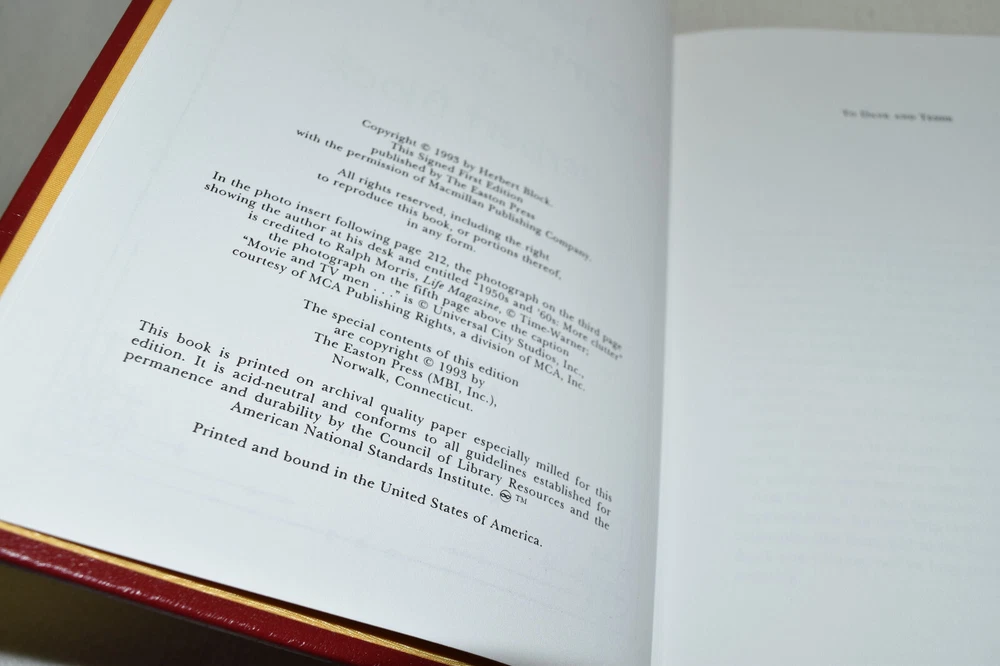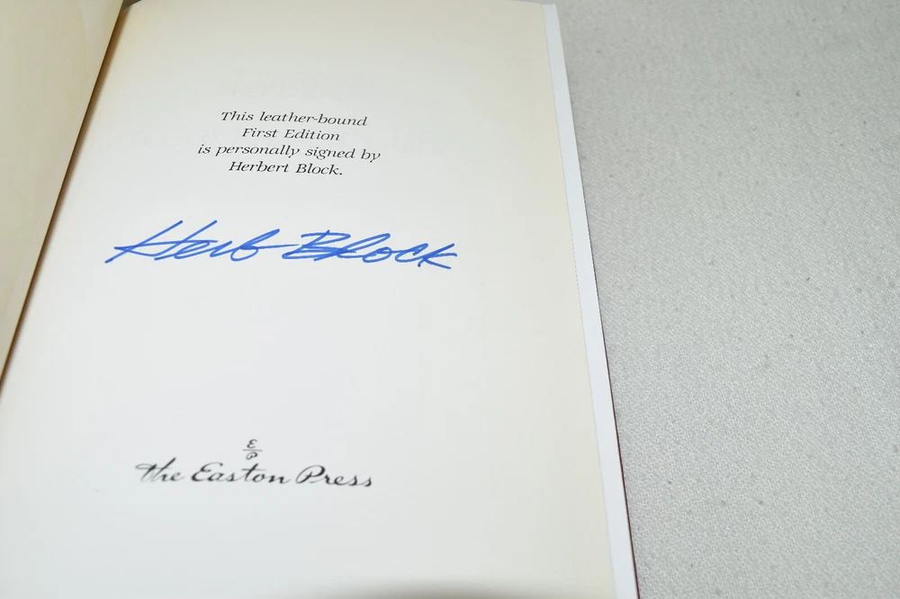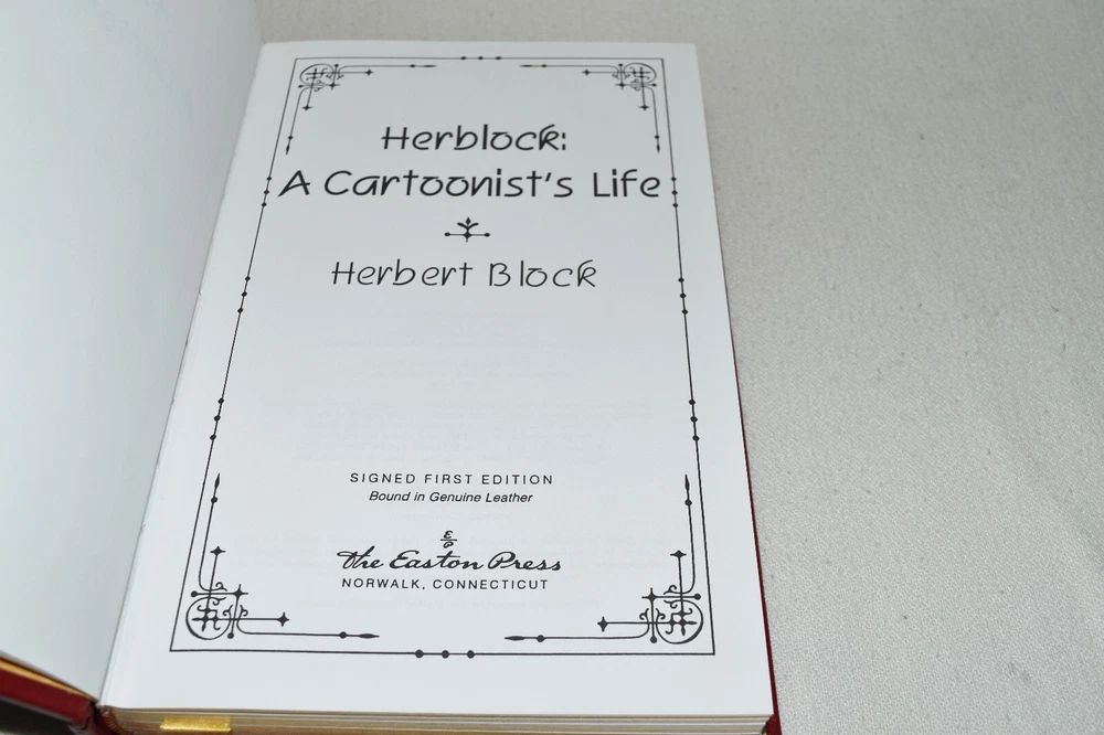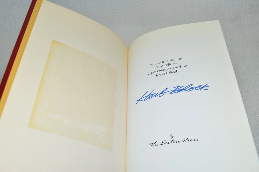 From the Easton Press Signed First Editions Collection... Herblock: A Cartoonist's Life PERSONALLY SIGNED by Author Herbert Block Easton Press Signed First Edition Copyright 1993 by The Easton Press Bound in Premium Full Leather This Signed First Edition contains all of the classic Easton Press trimmings: Premium Leather Silk Moire Endleaves Distinctive Cover Design Hubbed Spine, Accented in Real 22KT Gold Satin Ribbon Page Marker Gilded Page Edges Long-lasting, High Quality Acid-neutral Paper Smyth-sewn Pages for Strength and Durability A very scarce title in any condition, this copy is in Fine condition. The front and back covers are both in near perfect condition and the gilded page edges show minor wear. There is a residue on the second page. This book is personally signed by Herbert Block and would be a beautiful addition to your Easton Press collection. Hopefully you can add this book to your collection and enjoy it in the years to come... Please Email Me With Any Questions You Might Have! Shipping Info: Buyer to Pay Shipping and Handling International Bidders Pay Extra Shipping Seller Not Responsible For Uninsured Items Lost or Damaged in Mail Forms of Payment Accepted: Paypal Good luck and happy bidding! Powered by eBay Turbo Lister The free listing tool. List your items fast and easy and manage your active items.