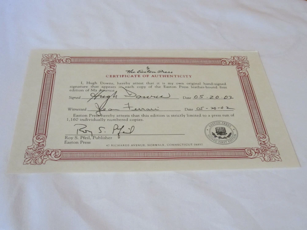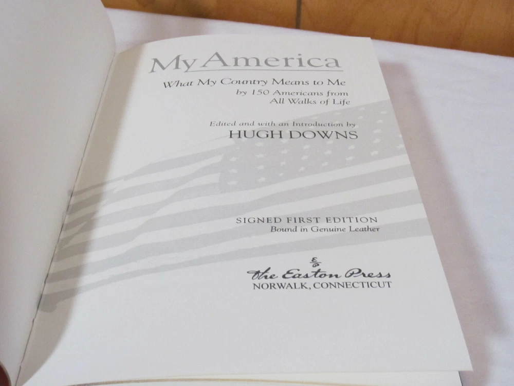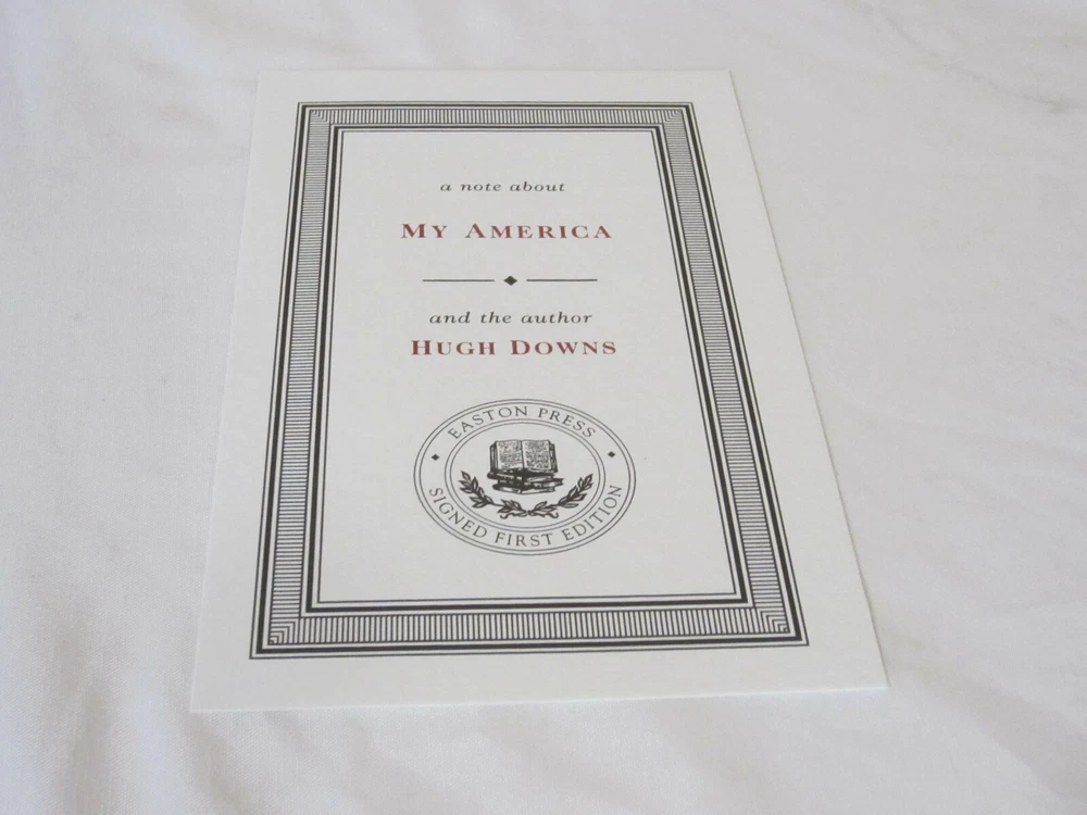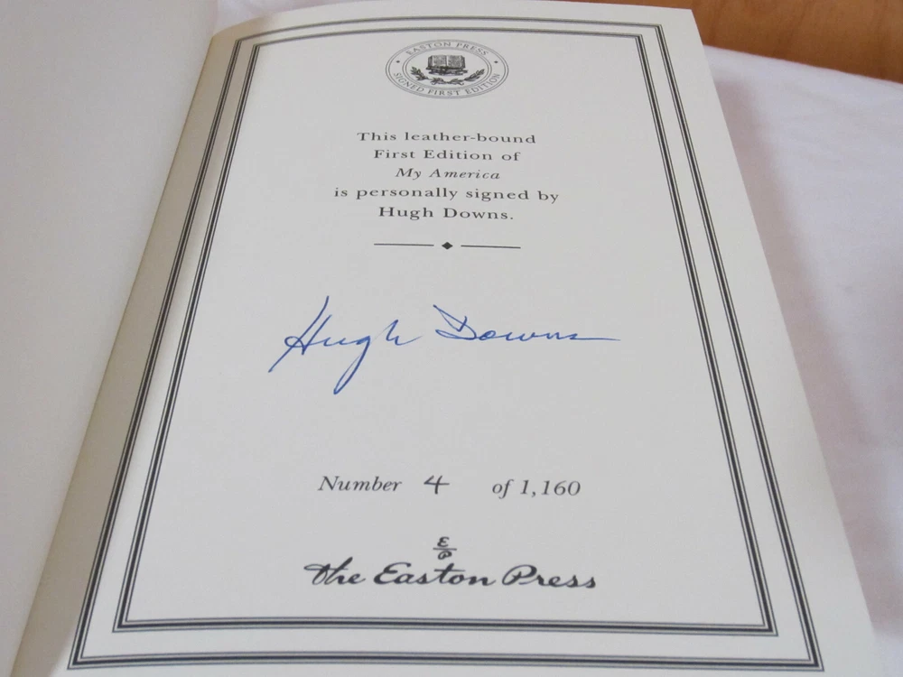 From the Easton Press Signed First Editions Collection... My America PERSONALLY SIGNED by Author Hugh Downs Easton Press Signed First Edition Copyright 2002 by The Easton Press Number 4 of 1,160 Signed Copies Bound in Premium Full Leather This Signed First Edition contains all of the classic Easton Press trimmings: Premium Leather Silk Moire Endleaves Distinctive Cover Design Hubbed Spine, Accented in Real 22KT Gold Satin Ribbon Page Marker Gilded Page Edges Long-lasting, High Quality Acid-neutral Paper Smyth-sewn Pages for Strength and Durability A very scarce title in any condition, this copy is in Fine condition. The front and back covers are both in near perfect condition and the gilded page edges show hardly any wear! There is NO attached bookplate nor any other signs of previous ownership. This edition is limited to only 1,160 signed copies; this being number 4. This book is personally signed by Hugh Downs and comes complete with a Collectors Note and Certificate of Authenticity. It would be a beautiful addition to your Easton Press collection. Overall, this copy is a grade collector's book. This book is very elusive in this superior condition, as only a limited number of them were ever published, so now is the time to act. Hopefully you can add this book to your collection and enjoy it in the years to come... Please Email Me With Any Questions You Might Have! Shipping Info: Buyer to Pay Shipping and Handling International Bidders Pay Extra Shipping Seller Not Responsible For Uninsured Items Lost or Damaged in Mail Forms of Payment Accepted: Paypal Good luck and happy bidding! Powered by eBay Turbo Lister The free listing tool. List your items fast and easy and manage your active items.