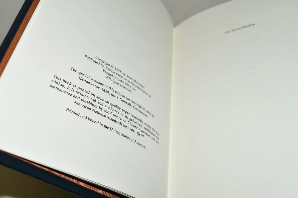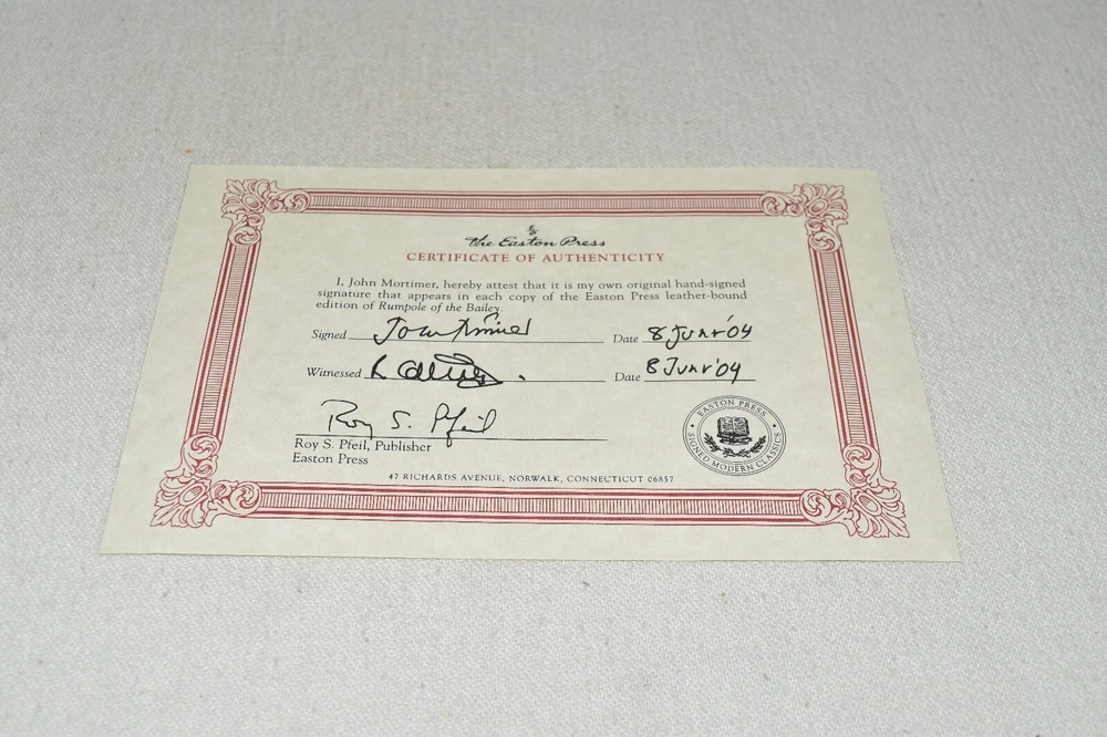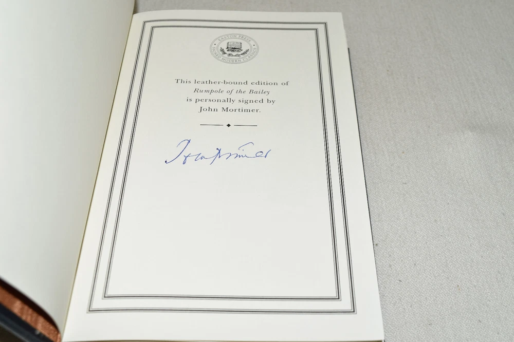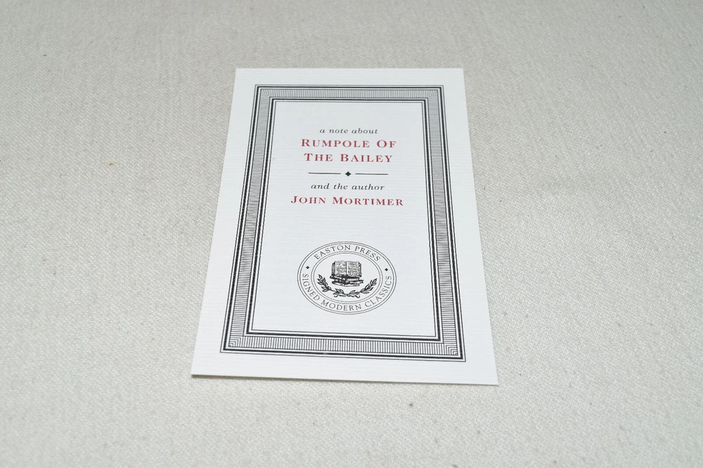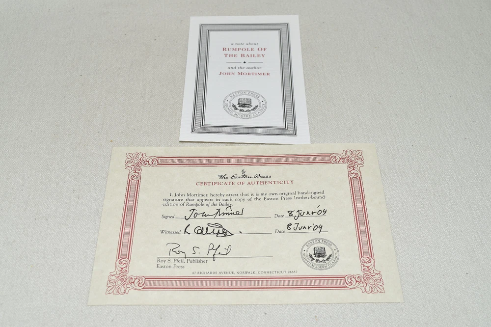 From the Easton Press Signed First Editions Collection... Rumpole of the Bailey PERSONALLY SIGNED by Author John Mortimer Easton Press Signed First Edition Copyright 2004 by The Easton Press Bound in Premium Full Leather This Signed First Edition contains all of the classic Easton Press trimmings: Premium Leather Silk Moire Endleaves Distinctive Cover Design Hubbed Spine, Accented in Real 22KT Gold Satin Ribbon Page Marker Gilded Page Edges Long-lasting, High Quality Acid-neutral Paper Smyth-sewn Pages for Strength and Durability A very scarce title in any condition, this copy is in Fine condition. The front and back covers are both in near perfect condition and the gilded page edges show hardly any wear! There is a blank bookplate on the second page. This book is personally signed by John Mortimer. It comes with a Certificate of Authenticity and Collector's Notes and would be a beautiful addition to your Easton Press collection. Overall, this copy is a grade collector's book. This book is very elusive in this superior condition, as only a limited number of them were ever published, so now is the time to act. Hopefully you can add this book to your collection and enjoy it in the years to come... Please Email Me With Any Questions You Might Have! Shipping Info: Buyer to Pay Shipping and Handling International Bidders Pay Extra Shipping Seller Not Responsible For Uninsured Items Lost or Damaged in Mail Forms of Payment Accepted: Paypal Good luck and happy bidding! Powered by eBay Turbo Lister The free listing tool. List your items fast and easy and manage your active items.