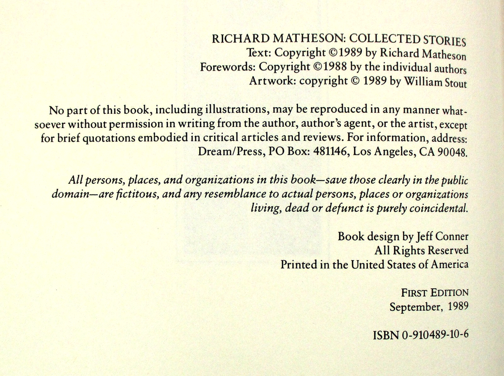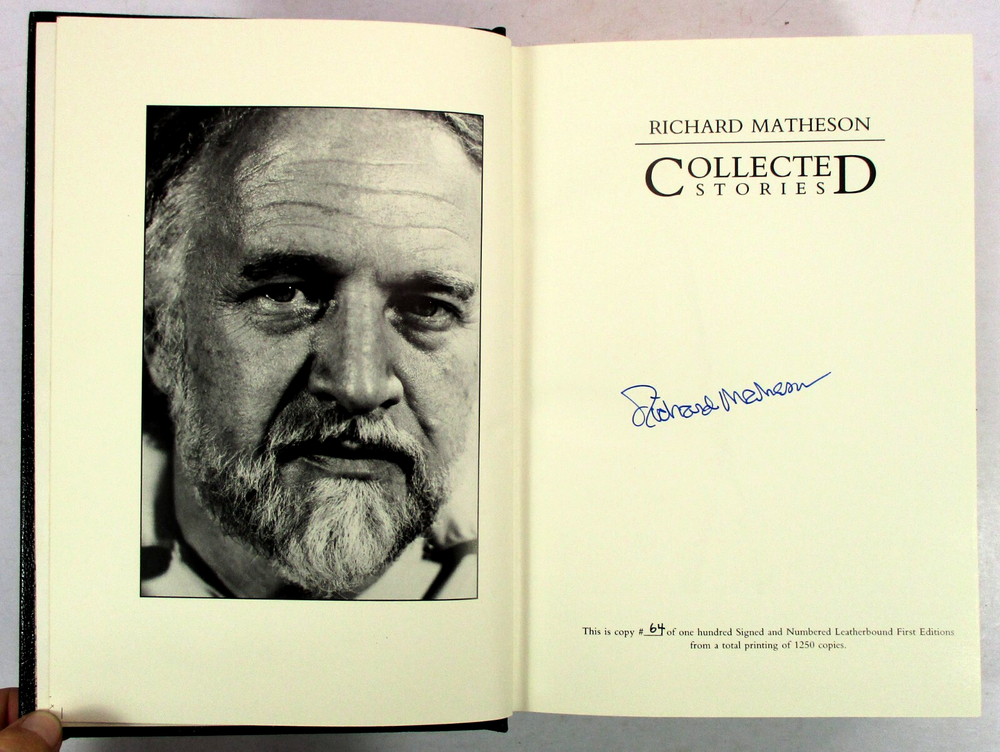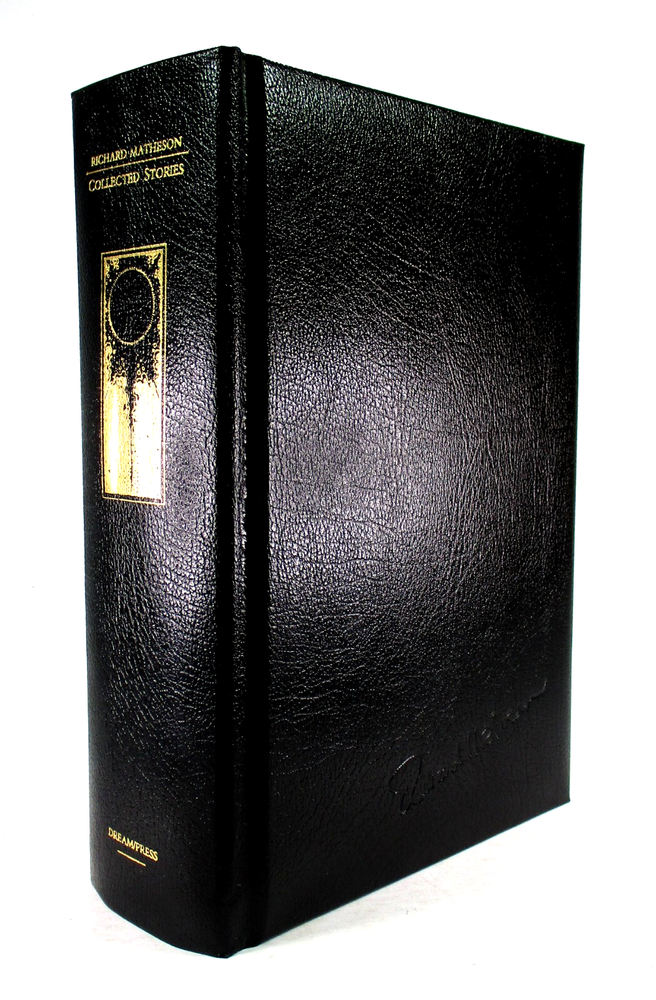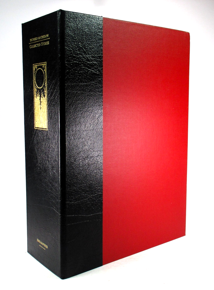 Very Good+ condition leather hardcover copy of Collected Stories by Richard Matheson. SIGNED by Matheson on limitation page! Limited Edition #64 of 100 made! P ublished September 1989 by Dream/Press in Los Angeles, CA. Bound in black padded leather with gold foil lettering and decoration, gilt pages, red satin placeholder ribbon, and black and white in-text illustrations. Protected in a red cloth and black leather quarter-stripe clamshell case. Binding is sound and pages are unmarked, with the exception of previous owner's bookplate affixed to first pastedown endpaper. Boards are clean and square. Clamshell case is in Very Good- condition with seam splits to interior fore edge seams of bottom half, minor bumping to head fore edge corners, very minor rubbing to corners, and minor shelf wear. Please see photos for condition detail. L-1587