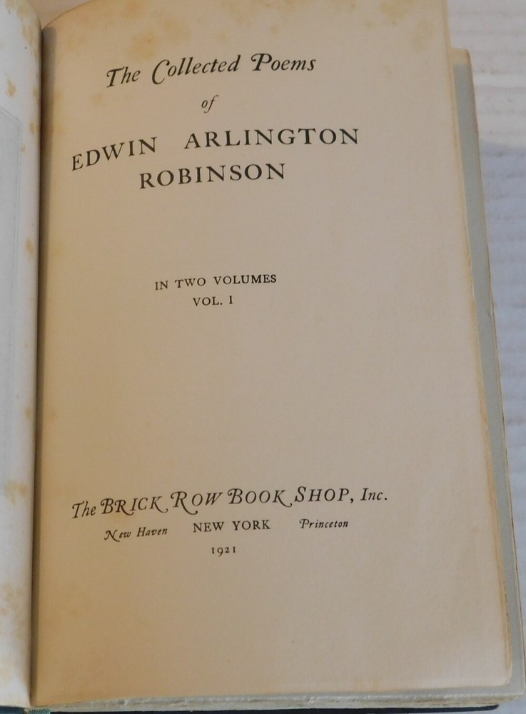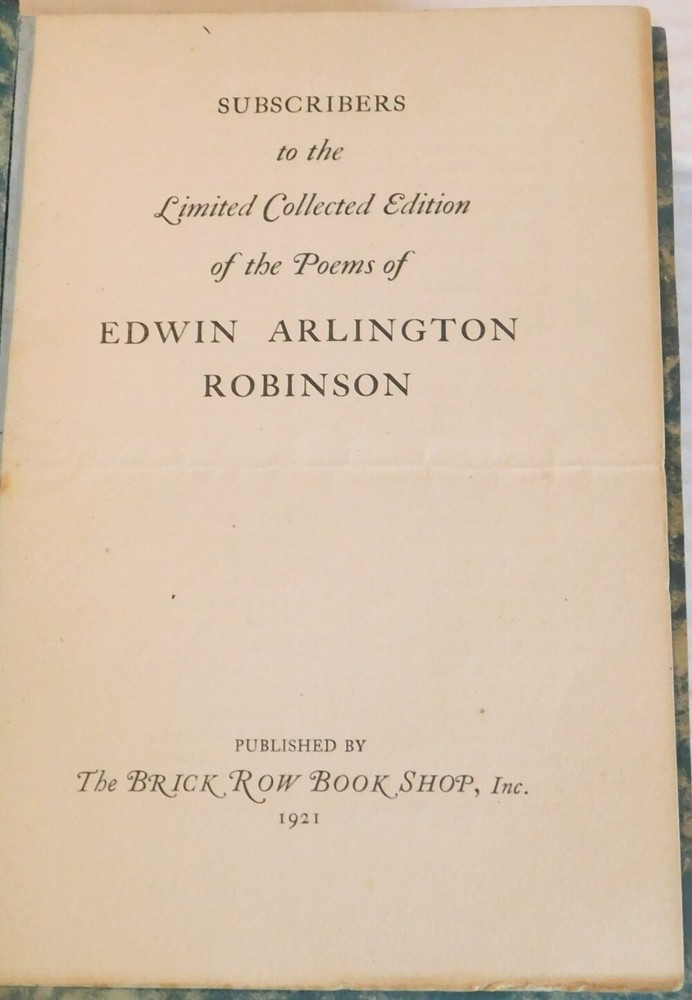 SIGNED LIMITED EDITION Robinson, Edwin Arlington. THE COLLECTED POEMS OF EDWIN ARLINGTON ROBINSON. 2 Volumes bound as one. [Signed Limited Edition]. New York: The Brick Row Book Shop, Inc., 1921. Octavo, 7-3/4 inches high by 5-1/4 inches wide. Hardcover, bound in three-quarter black leather and pebbled green cloth titled with devices in gilt between raised bands on the spine. The top edge is gilt and the endpapers are marbled. The covers are rubbed and scuffed with some of the leather rubbed away from the bottom of the spine. [4] leaves, pages 1-314 & [3] leaves, pages [315]-591 & [1], illustrated with a portrait frontispiece by Bradford Perin. The top and bottom of the front hinge are starting to crack. Very good. No. 110 of 200 numbered copies, signed by Edwin Arlington Robinson. This privately commissioned limited issue of the Macmillan Collected Poems published in the same year is from the library of one of the original subscribers, Lincoln MacVeagh . The subscriber list is laid in. With the bookplate of MacVeagh and his wife Margaret. Lincoln MacVeagh (1890-1972), a Renaissance man, graduated from Harvard magna cum laude in 1913. He went on to study languages at the Sorbonne and became fluent in German, French, Spanish, Latin, Greek and Classical Greek. After World War I he became a director of the Henry Holt and Company publishing firm where he became friendly with the poet Robert Frost. In 1923 he left the firm and founded the Dial Press. His name appears on the imprint of many of their publications. In 1933 President Roosevelt appointed him Minister to Greece. He followed presentation of his credentials with a speech in Classical Greek. While in Greece he conducted excavations beneath the Acropolis and made archeological contributions to the National Museum in Athens. He left Greece in 1941 when the German army over ran the country. From there he was appointed the first US Minister to Iceland where he negotiated agreements for the construction of the Keflavik airfield. In late 1942 he became Minister to the Union of South Africa and coordinated American wartime agencies there. In 1943 he was sent to Cairo as Ambassador so that he could assist the governments in exile of Greece and Yugoslavia. He returned to Athens as Ambassador in 1944. MacVeagh gave secret testimony before Congress concerning the Balkans in 1947, testimony that was an important factor in the formation of the Truman Doctrine. In 1948 as Ambassador to Portugal MacVeagh was influential in admitting her into NATO. In 1952 President Truman named him Ambassador to Spain. President Truman wrote to him on March 9, 1948: "On the occasion of your appointment as Ambassador to Portugal, I would like to make some personal expression of appreciation for the high services you have already rendered your country. During the past fifteen critical years you have served with distinction as Chief of the United states Missions to Iceland, the Union of South Africa, Yugoslavia and Greece. In this last post especially - as Minister from 1933 to 1941 and as Ambassador since 1943 - your scholarly statesmanship and diplomatic judgment have been of the utmost value." I UNCONDITIONALLY GUARANTEE THE AUTHENTICITY OF THE ABOVE AUTOGRAPH! TERMS: Shipping charges are calculated based on the total packed weight of this item. New York State residents will be assessed and charged the relevant sales tax. All items are guaranteed authentic and as described. Be sure to add me to your favorites list ! Check out my other items !