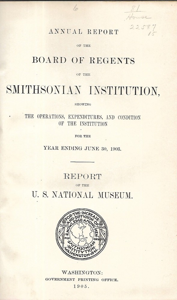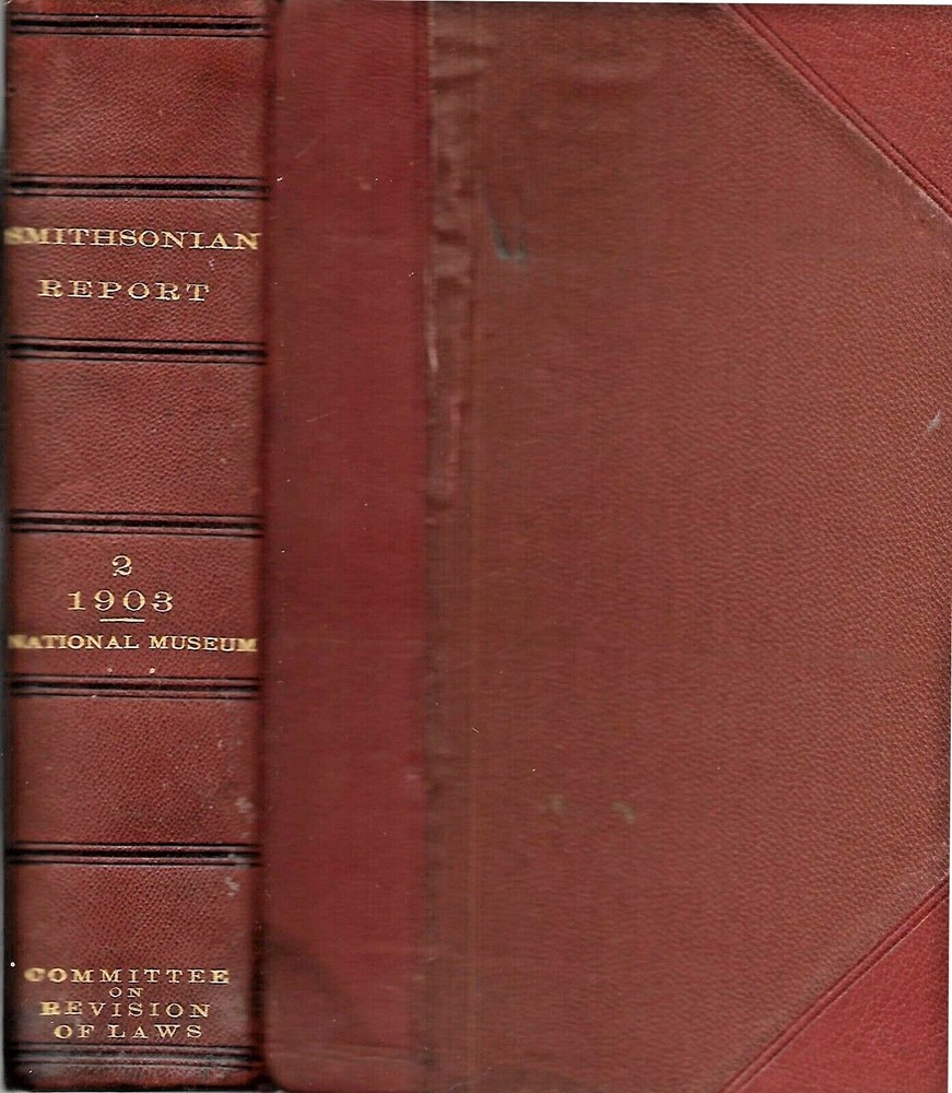 Annual Report of the Board of Regents of the Smithsonian Institution Year Ending June 30, 1903 by S. P. Langley, Assistant Secretary 1905, First Edition, Government Printing Office, Washington, 646 pages plus 69 plates (715 pages total). Contains: I. Report of the Assistant Secretary of the Smithsonian Institution, in charge of the National Museum, upon the general considerations and operations of the Museum. II. Reports of the Head Curators. III. Papers illustrative of the collections in the U.S. National Museum, including: - The United States National Museum: An account of the buildings occupied by the national collections. - Studies of the museums and kindred institutions of New York City, Albany, Buffalo, and Chicago, with notes on some European institutions. Enhanced with 69 full-page plates and 120 text figures. Part-leather book in Very Good condition, clean and tight with no marks; marbled end-papers. Pages are clean and white. Red covers, leather spine and corners, with gilt titles on the spine are clean and bright with very minor scuffing along edges. No dust jacket as issued. Visit My Store (See Below) or Check “Popular Categories” for More Items of Interest.