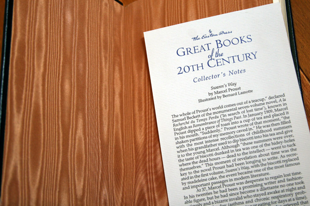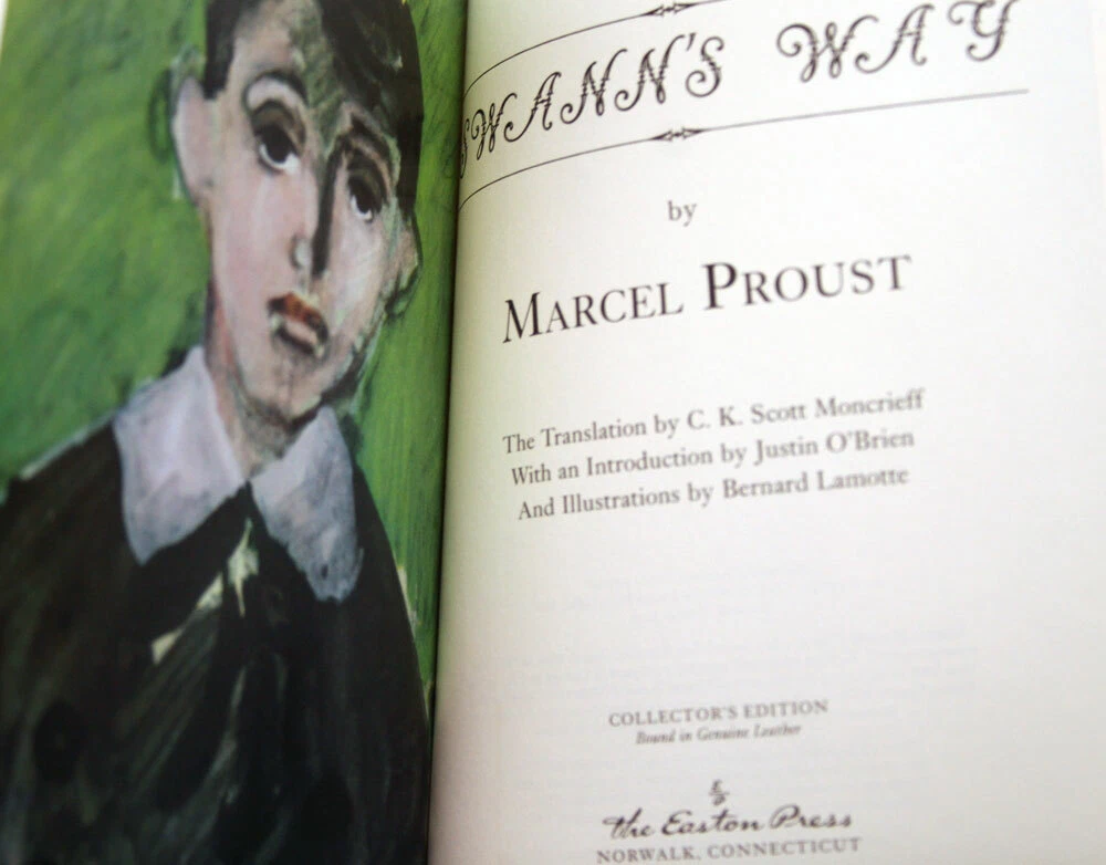 Description SWANN'S WAY by Marcel Proust. Leather-bound collectible book published by THE EASTON PRESS. Copyright 1982. Gilt-tipped pages. Easton Press leaflet included. Light cover wear, binding secure, minimal scratches to the gilt-tipped pages, no handwriting, no bookplate, excellent interior pages. Nice copy. 441 pages. Books will be packed securely for safe shipment. Books will ship via USPS Media Mail, unless otherwise requested. If you would like to upgrade to an expedited shipping method, please contact me for a quote. Please view the photos and contact me with any specific questions. X3 **Please contact me with any questions prior to bidding. Check out my other auctions for many more books and other collectibles being offered!** ***Please note: If you are bidding on a used or antique book... We do our best to accurately describe each book and identify any flaws it may have. If you have specific questions regarding its condition, please never hesitate to ask. Unfortunately, we cannot always inspect each page, and therefore grading is from visual inspection and browsing through the book. Unless stated otherwise, our books will contain signs of wear and age which is normal within this category. We offer primarily used, vintage and antique books. Our books are stored in a dry, 100% smoke-free environment . We will always mention if a book has a noticeably unpleasant odor, however if you have a particularly sensitive sense of smell, we cannot recommend that you purchase any antique or vintage books. Payment Paypal Accepted. Shipping FREE anywhere in the U.S. **Sorry, no international shipping for this item.** Return Policy We consider All Sales to be Final. Returns Accepted for Full Refund of Purchase Price only if Item is Significantly Not as Described. Shipping & Handling costs will not be refunded under any circumstances. Please be sure that this is the item you are looking for prior to bidding. If you have any questions about the content of an item, condition of an item or a question about any of our policies please do not hesitate to ask. Feedback Feedback will be posted once feedback has been posted for us. If you were pleased with your purchase and experience with us please leave a comment. We will do likewise right away.