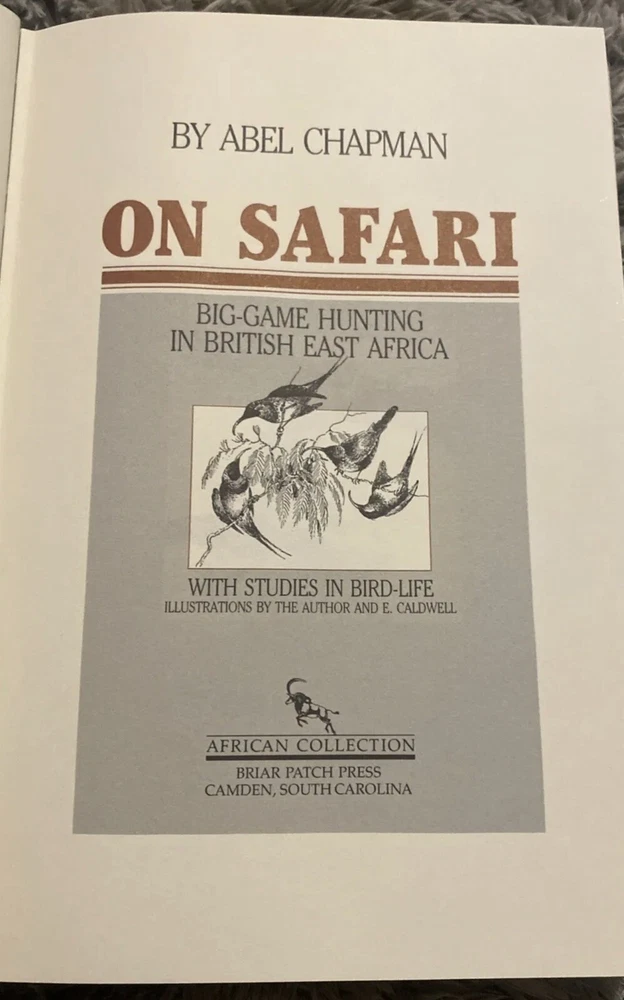 On Safari - Big-Game Hunting in British East Africa with studies in bird life by Abel Chapman African Collections reprint edition, beautifully presented. Printed in USA in 1988 Black/white sketches throughout and a handful of old black/white photos. 336-pages, approximate size 16 cm wide x 23.5 cm tall. On Safari - Big Game Hunting in British East Africa with Studies of Bird Life Author: CHAPMAN, Abel Title: On Safari - Big Game Hunting in British East Africa with Studies of Bird Life A very good+ copy. Clean and An attractive copy. Abel Chapman was a Sunderland born hunter-naturalist. He saved the Spanish Ibex goat from extinction. Chapman travelled the world, particularly East Africa, studying and shooting both wild game & game birds. Many of his stuffed specimens can be seen in the Sunderland Museum & the National History Museum.