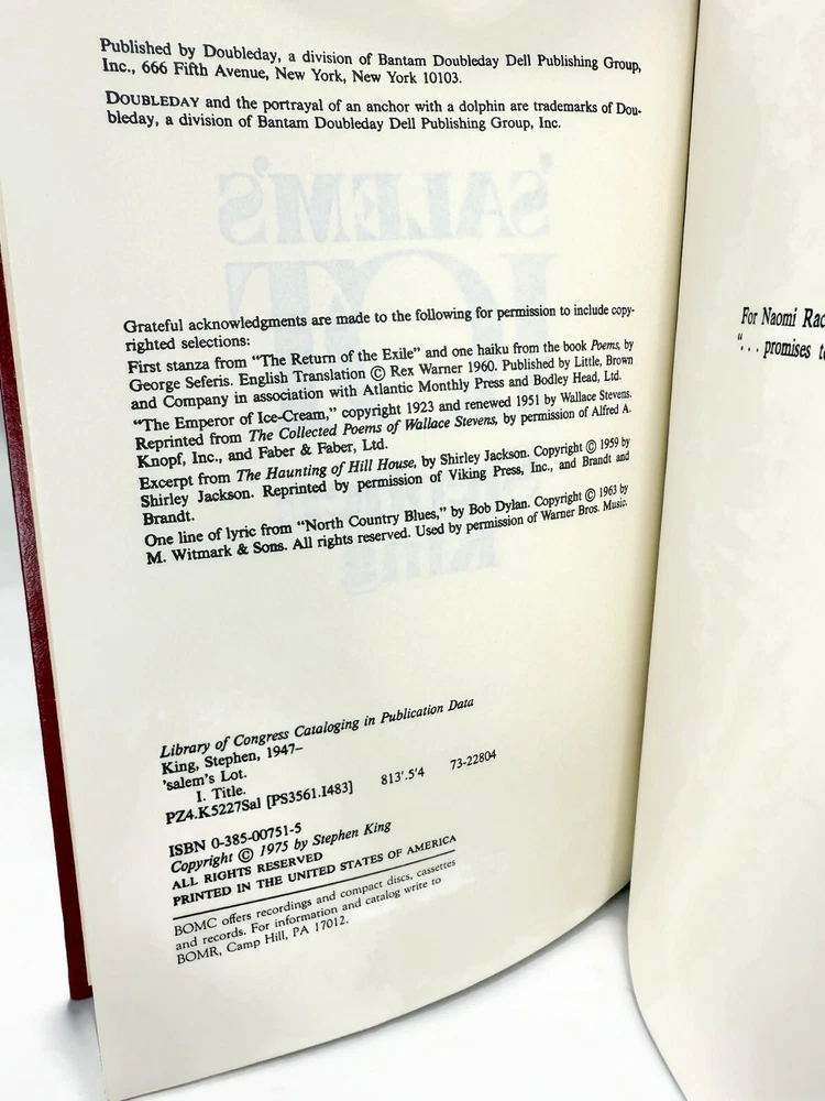 Salem’s Lot - Stephen King Library - Red (Faux) Leather-Bound Hardcover - 1975 Condition: Pre-owned. An item that has been used previously. The item may have some signs of cosmetic wear but is fully operational and functions as intended. Book Series: Stephen King Library Collection Series OUT OF PRINT Original Language: English Item length: 9 1/2 in. (measurement is approximate) Item height: 1 3/8in. (measurement is approximate) Item Width: 6 1/4 in. (measurement is approximate) Publication Year: 1975 Author: Stephen King Genre: Fiction Topic: Horror Book Title: Salem’s Lot Narrative Type: Fiction Publisher: Doubleday Publishing Group Edition: Collector’s Edition, Limited Edition, Luxury Edition Type: Novel Language: English Country/Region of Manufacture: United States Item Weight: 26 Oz. (weight is approximate) Number of Pages: 439 *NOTE: My customers are very important, as is the item they have purchased. I pack each item very well, so your item is safe during shipping. Also, I have available shipping options for you to choose from that determines cost and delivery time depending on size and weight. Please be aware, postal and shipping carries time of delivery may change due to THEIR handling. Thank you for visiting Fabulous-Things4U. 100% GENUINE- USA SELLER. I do the best I can to accurately describe all my items and point out any areas of potential concern. All pictures provided are the item/s you will receive. The pictures are shot on a white background for better picture quality. Please examine pictures as a form of description, so that you can see what you will receive. Where appropriate, I will provide a close-up photo of any problem area and note it in the description. If I have not mentioned any concerns or potential defects, it means I did not notice any. If you order from me and feel that I missed describing a significant defect, please let me know. Return Policy : After receiving the item, contact seller within 30 days, return will be given as money back and buyer pays return shipping. In the event you experience any problems with your order, please contact us prior to leaving a negative or neutral feedback and we will be sure to offer a speedy resolution to any issues that may arise.