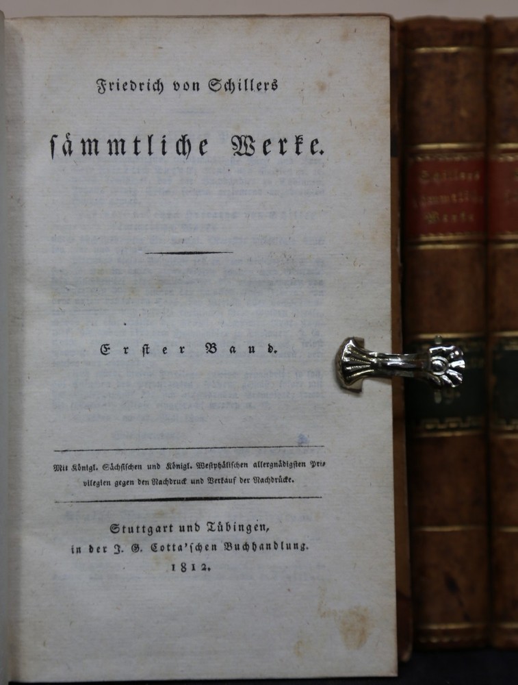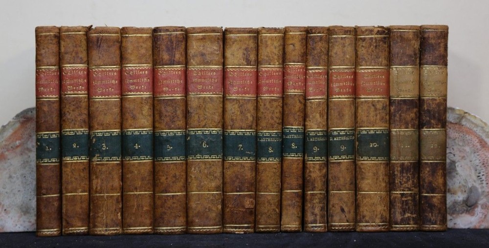Article details All works. 12 volumes in 14 sub -books (complete). Schiller, Friedrich: Stuttgart and Tübingen, Cotta, 1812-1815. 19.5 x 11 cm. Half leather volumes of the time. Language: German Order no.: 156478 Remarks: *Goedeke V, 142; Marcuse 4; Fischer, Cotta 894. - First legitimate total edition (large aktav edition). - Beautiful decorative bound copy in contemporary half -leather bonds (the backsaws in volume 11 and 12 slightly different in color). Pressure on good paper (consistently clean). Keywords: total editions of work expenditure VAT) Free shipping within Germany Further illustrations Recorded with WHBOOK Article set with the W+H GmbH eBay-Service Data and pictures powered by Book friend (2025-05-12)