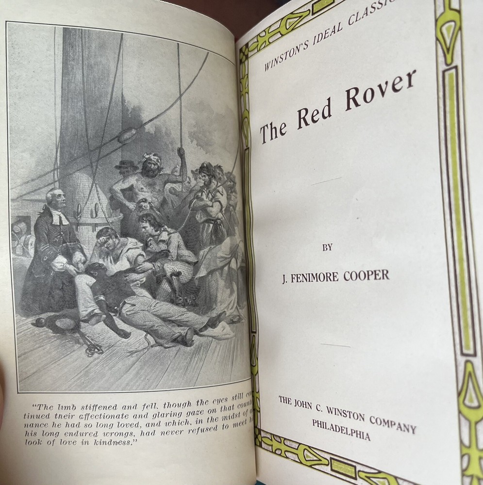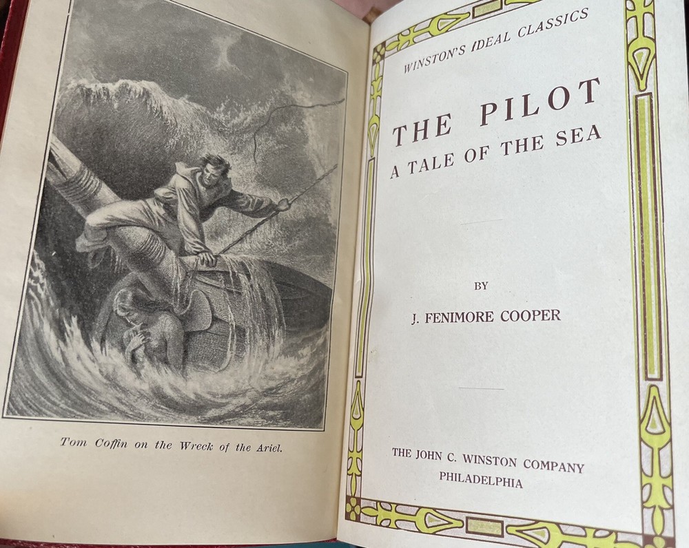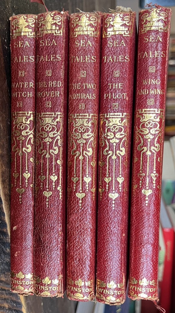 Complete five volume set of J. Fenimore Cooper's Sea Tales: The Pilot; The Red Rover; The Two Admirals; The Water Witch; The Wing-and-Wing . Philadelphia: John C. Winston Company - no date, circa 1900. Complete 5 volumes in matching red leather. 4 1/2" x 6 1/2", unique frontis in each volume (see photos). Blind embossed red leather with gilt spine titles and designs, red linen endpapers, top edge gilting, ribbon markers bound in. Light wear at spine ends/outer tips - no interior markings or other visible flaws. $6.55 domestic U.S. shipping. Payment must be received within 24 hours of sale.