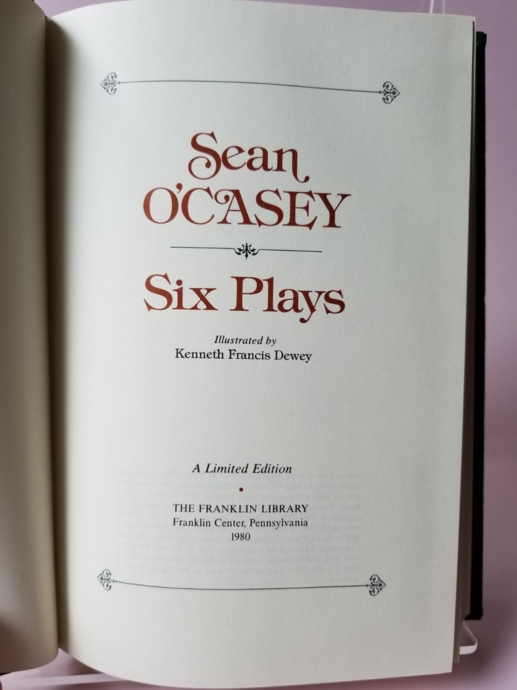 Sean O'Casey Six Plays Franklin Library 1980 Leather An unread copy. These and the other Franklin Library books I've listed would make a great addition to your collection, or terrific gifts for students, military, US History buffs, and literature lovers. Bound in leather, the book has French moire silk end leaves, hubbed spine, satin book marker, acid-free paper, Smyth-sewn binding, gold gilding on three edges. CONDITION: In very good condition with light fading to the edges of the silk endpapers VERY GOOD : Tight binding, clean pages, might still show some scuffs and shelf wear. Accented in 22kt gold. Leather bound. Printed on archival paper with gilded edges. The endsheets are of moire fabric with a silk ribbon page marker. Smyth sewing and concealed muslin joints and hubbed spine. From our family collection. My father collected this and many others in the 80s. We will combine items to adjust shipping to the best price we can find. Shipping cost is based on weight and value, and includes tracking and insurance. Please look at all the photos as they are part of the description. ENLARGE PHOTOS FOR DETAILS MY GRADING SYSTEM FOR BOOKS I try to mention loose pages, stains, binding damage, condition of dust jacket and to the book etc. However, sometimes binding glue weakens and when old paperbacks are opened for reading, additional pages may loosen at that time. VERY FINE : in exceptional condition with tight binding, clean pages, no spine or cover creases, appears unread. No shelf wear or edge wear. FINE : in exceptional condition with tight binding, clean pages, no spine or cover creases, appears unread. Might still show very light scuffing and light shelf wear or edge wear. VERY GOOD : Tight binding, clean pages, might still show some scuffs and shelf wear. GOOD : the average used book or paperback; not heavily read, but may show an accumulation of wear and creases. ACCEPTABLE : reader's copy: a complete copy, but well-read with worn edges and a greater accumulation of creases and other wear. Ask questions if you have them. We do offer returns, but really want you to bid ONLY if you want this item, and not to just check it out and return it. Thanks for understanding . RETURNS: MUST BE IN ORIGINAL CONDITION for you to have a refund. It's hard to know what all to mention or even look for in vintage and antique pieces, as you might be searching for something I never noticed or thought of! Feel free to ask questions too! We try very hard to point out imperfections , but sometimes you just have to search the photos for yourself. The charm and patina these items have gained over the years and the stories they tell are part of their charm! Please remember that vintage and antique items are treasure that have been lived with and loved for generations and will show signs of love and use. They may also have minor imperfections from all that love, use and time. Please don't expect these items to be perfect. Smoke free home , but not pet free . Check back often, we're always shopping estate sales.