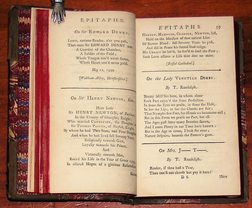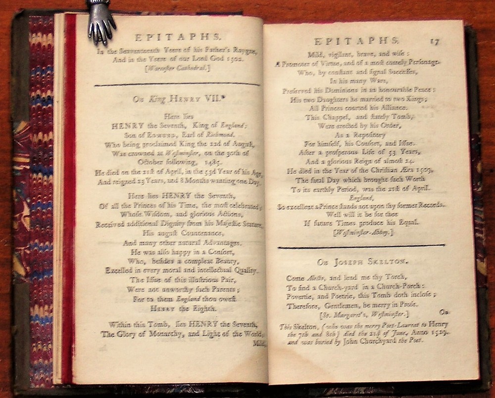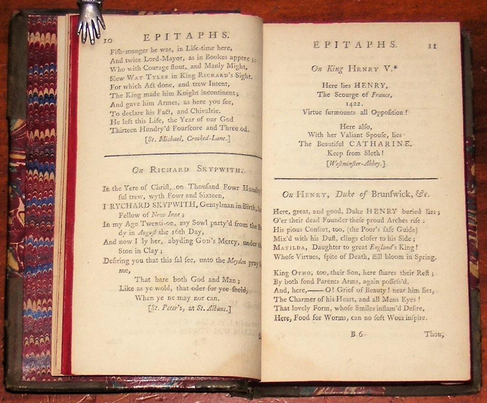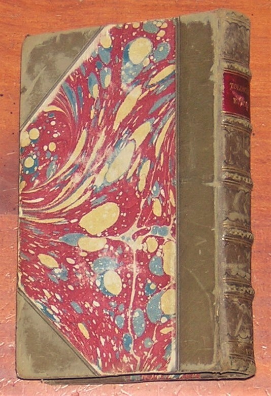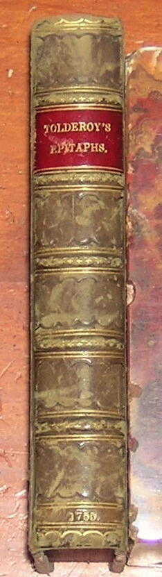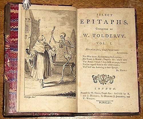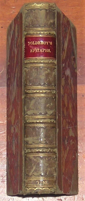 Select Epitaphs Collected by W. Toldervy [sic], Vols. I and II. By William Tolderoy. Published in 1755 by W. Owen, London. Two volumes in one book (216 and 238 pages). Three quarter leather over marbled boards, banded spine (6 compartments, including leather spine label), marbled endpapers, with frontispiece by Worlidge. Measures 4 X 6.5 X 1 in. Good condition. Scuffed leather edges, nicks on the board edges, rubbed board corners. Unmarked, securely bound. Hinge papers are torn, but the binding is still very much intact. Two volumes in one book. Free shipping in the USA. Thanks for looking. Location: glass shelves.