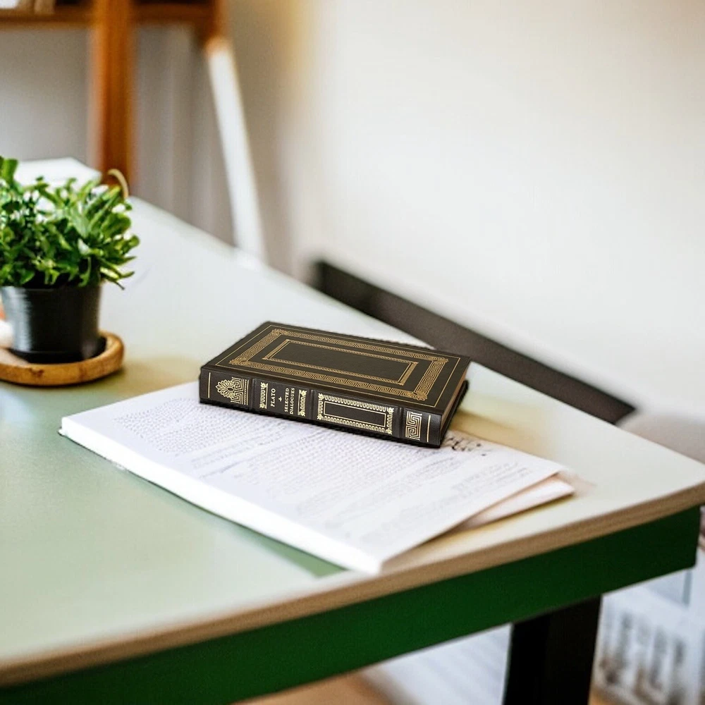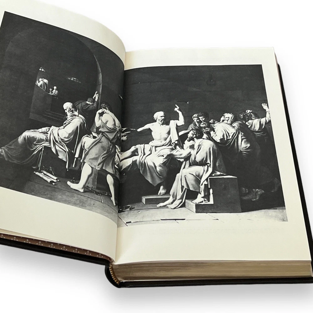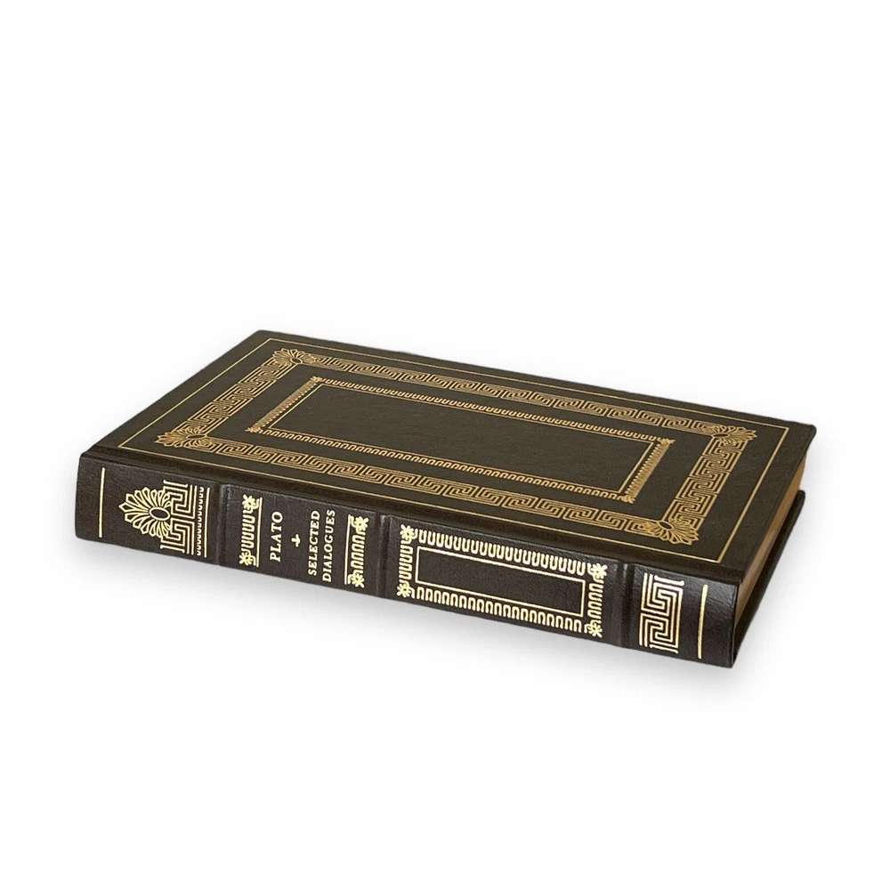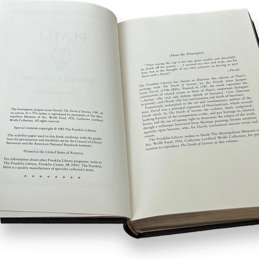 ABOUT THE BOOK: This collectible edition is in EXCELLENT Vintage condition. In the original faux leather boards, elaborately gilt stamped. This book has a genuine leather cover with 22 kt. gold accents and lettering, raised spine bands, silk moire endpapers, gilt-edged pages. Publisher THE FRANKLIN LIBRARY, PENNSYLVANIA, USA; 1983 The translation of Benjamin Jowett Plato Plato (428-348 BCE) was a philosopher and mathematician in ancient Greece. A student of Socrates and a teacher of Aristotle, his Academy was one of the first institutions of higher learning in the Western world. He is widely regarded as the father of modern philosophy. Language English Series Title Leather-Bound Classics Book Format Leather Bounded Hardcover