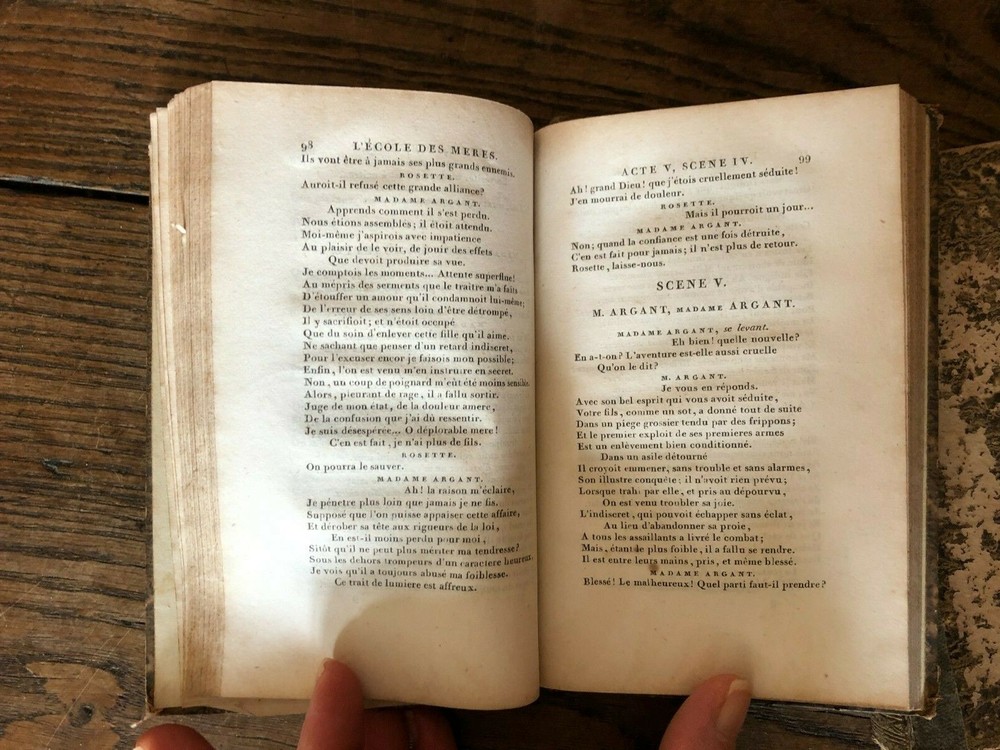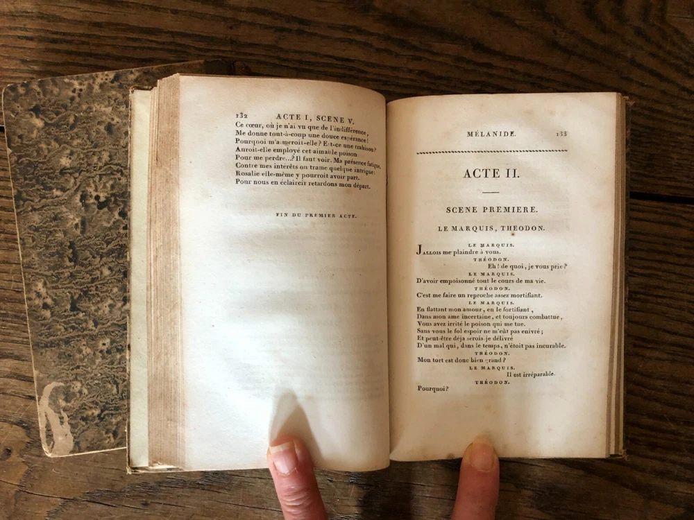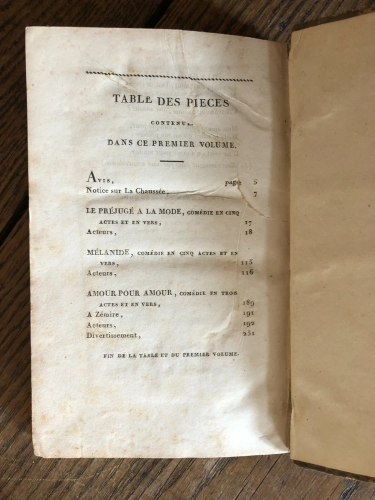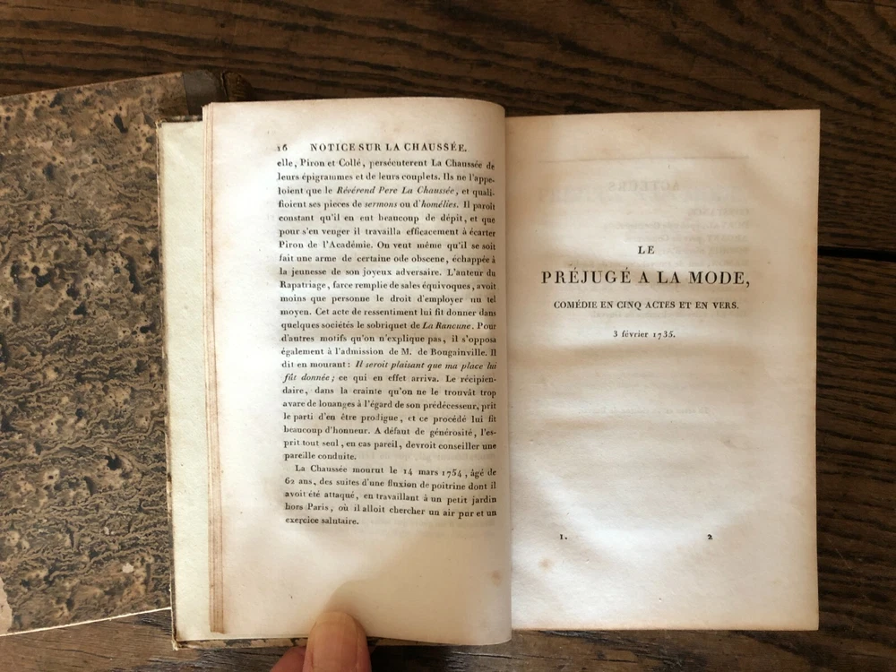 This rare 1810 two-volume set of Nivelle de La Chaussée's selected works is a gem for collectors! The gold-stamped leather binding shows its age with some wear but remains sturdy, while the interior pages are well-preserved with minimal foxing. Contains fascinating pieces like "Fashionable Prejudice" and "The School of Mothers" in a compact 15.7cm format. A beautiful piece of French literary history from the prestigious Didot publishing house – perfect for enthusiasts of 18th-century drama and classic bookbindings. The publisher's notes add extra depth to these thought-provoking comedies.