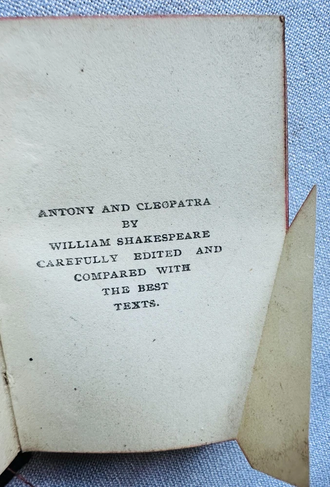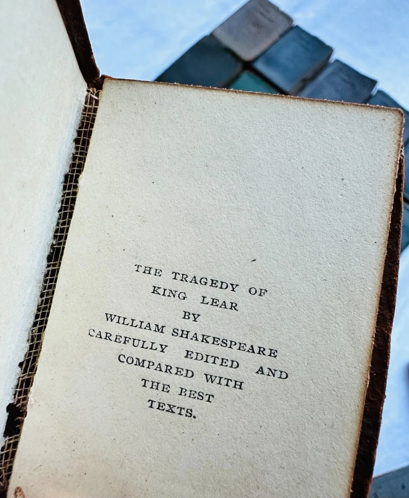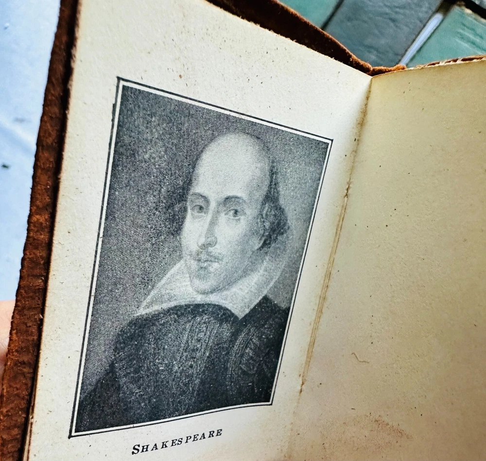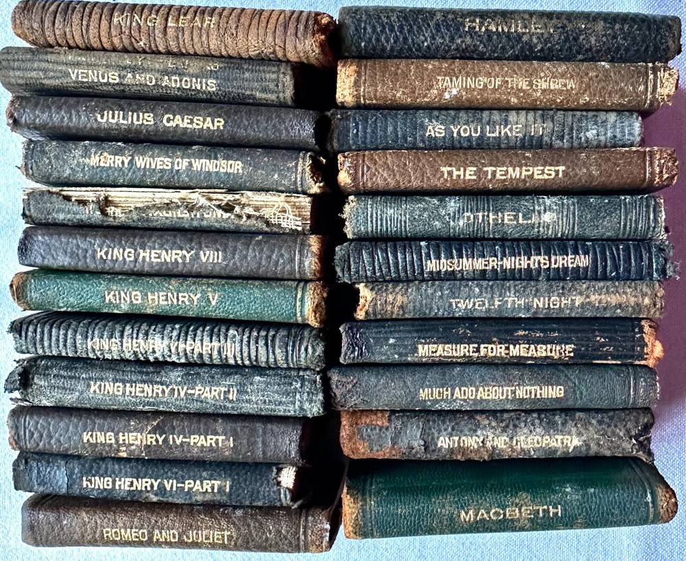 Set (23) Miniature Antique Leather Books by Shakespeare - Knickerbocker - 1910 Set of (23) Miniature Books by William Shakespeare Knickerbocker Leather and Novelty, New York As You Like It Measure for Measure Romeo and Juliet Julius Caesar Hamlet Much Ado About Nothing Twelth Night - back cover is not attached King Henry 4 - Part 1 King Henry 4 - Part 2 King Henry 5 King Henry 6 - Part 1 King Henry 6 - Part 2 King Henry 6 - Part 3 King Henry 8 Macbeth Othello Antony and Cleopatra Merry Wives of Windsor Comedy of Errors/Venus and Adonis The Tempest King Lear Taming of the Shrew Midsummer Nights Dream No stated date - circa 1910 Each measures approximately 2.25" x 3.25" Used, fair/good. Nice overall condition of interiors. Some loose at endpapers. (2) have loose covers. Leather is deteriorating on edges.