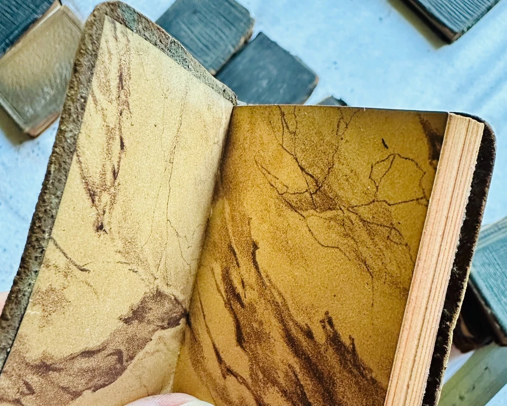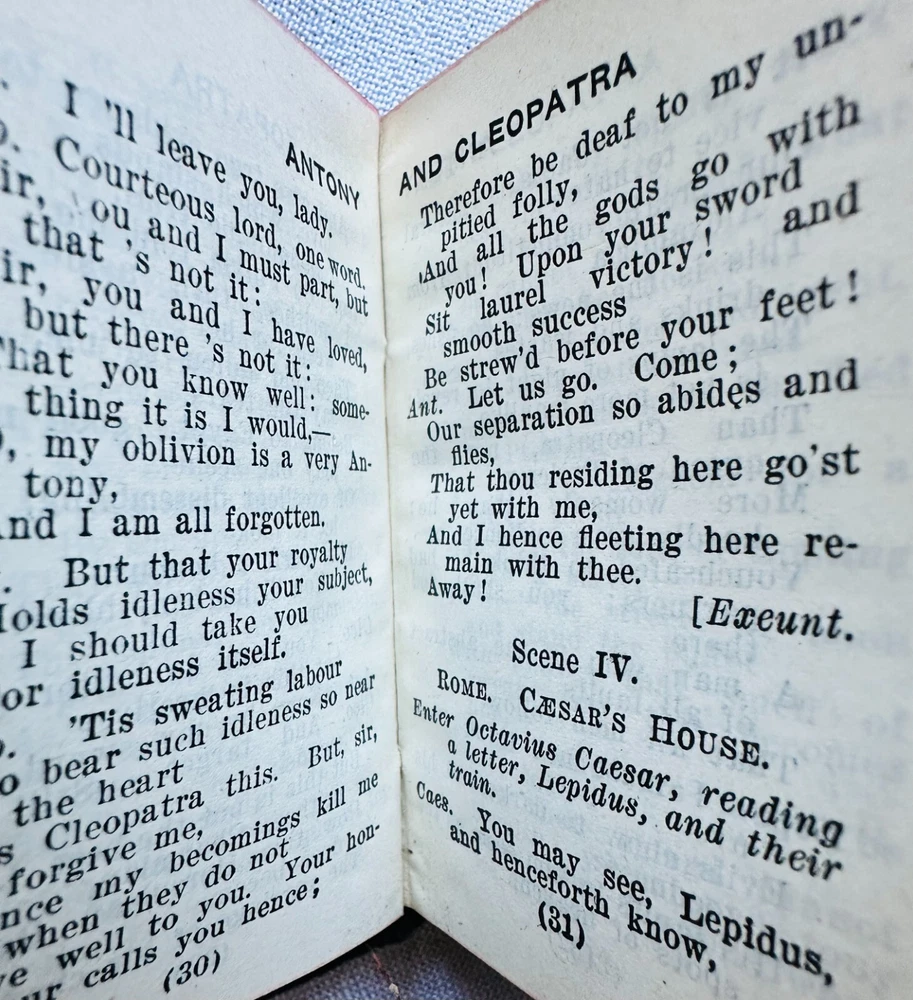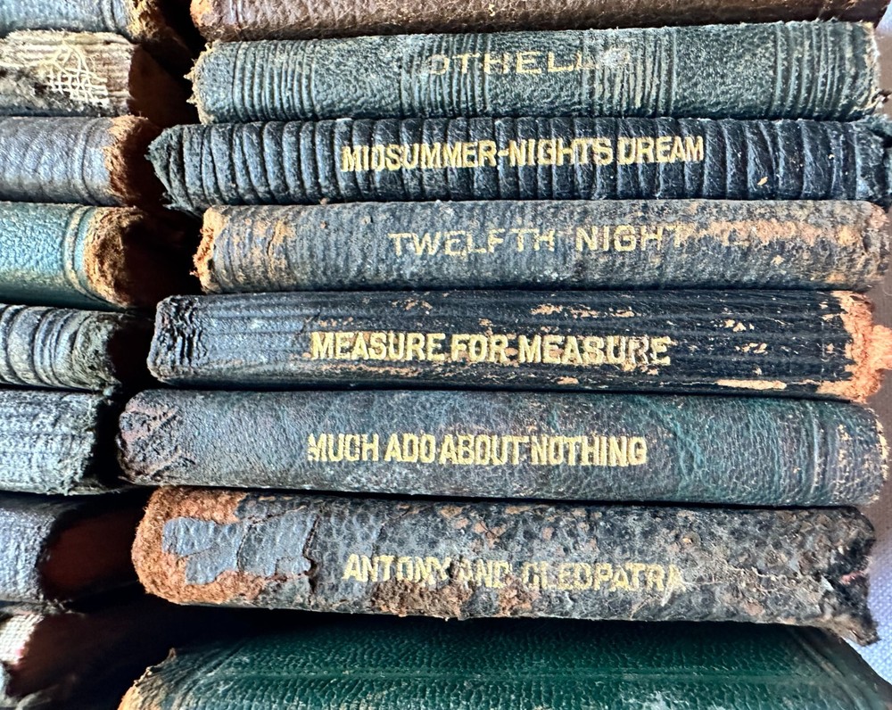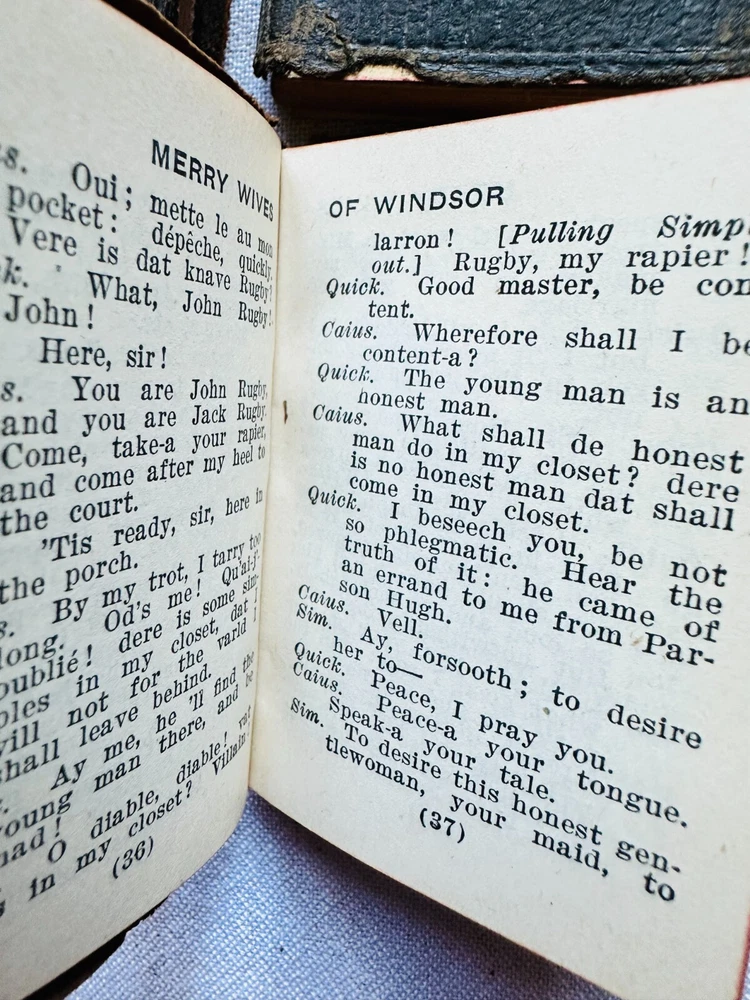 Set (23) Miniature Antique Leather Books by Shakespeare - Knickerbocker - 1910 Set of (23) Miniature Books by William Shakespeare Knickerbocker Leather and Novelty, New York As You Like It Measure for Measure Romeo and Juliet Julius Caesar Hamlet Much Ado About Nothing Twelth Night - back cover is not attached King Henry 4 - Part 1 King Henry 4 - Part 2 King Henry 5 King Henry 6 - Part 1 King Henry 6 - Part 2 King Henry 6 - Part 3 King Henry 8 Macbeth Othello Antony and Cleopatra Merry Wives of Windsor Comedy of Errors/Venus and Adonis The Tempest King Lear Taming of the Shrew Midsummer Nights Dream No stated date - circa 1910 Each measures approximately 2.25" x 3.25" Used, fair/good. Nice overall condition of interiors. Some loose at endpapers. (2) have loose covers. Leather is deteriorating on edges.