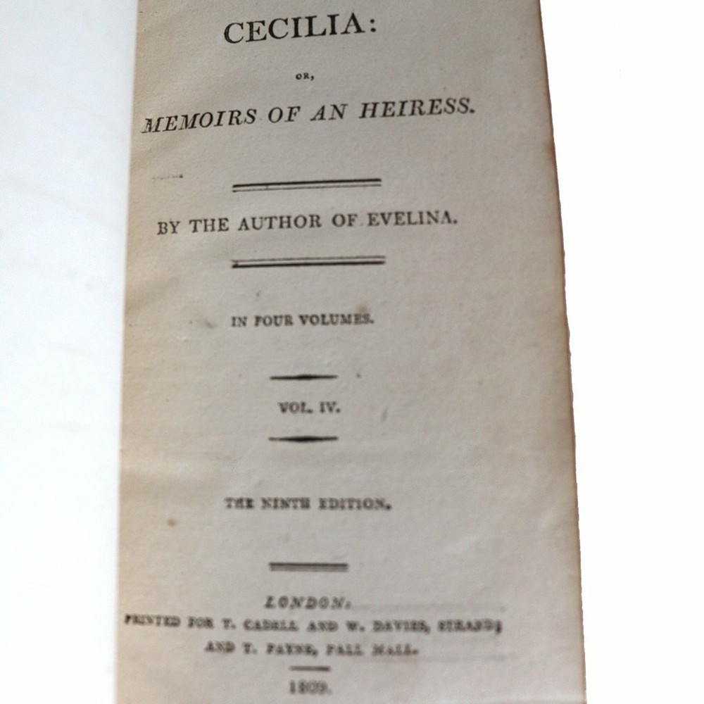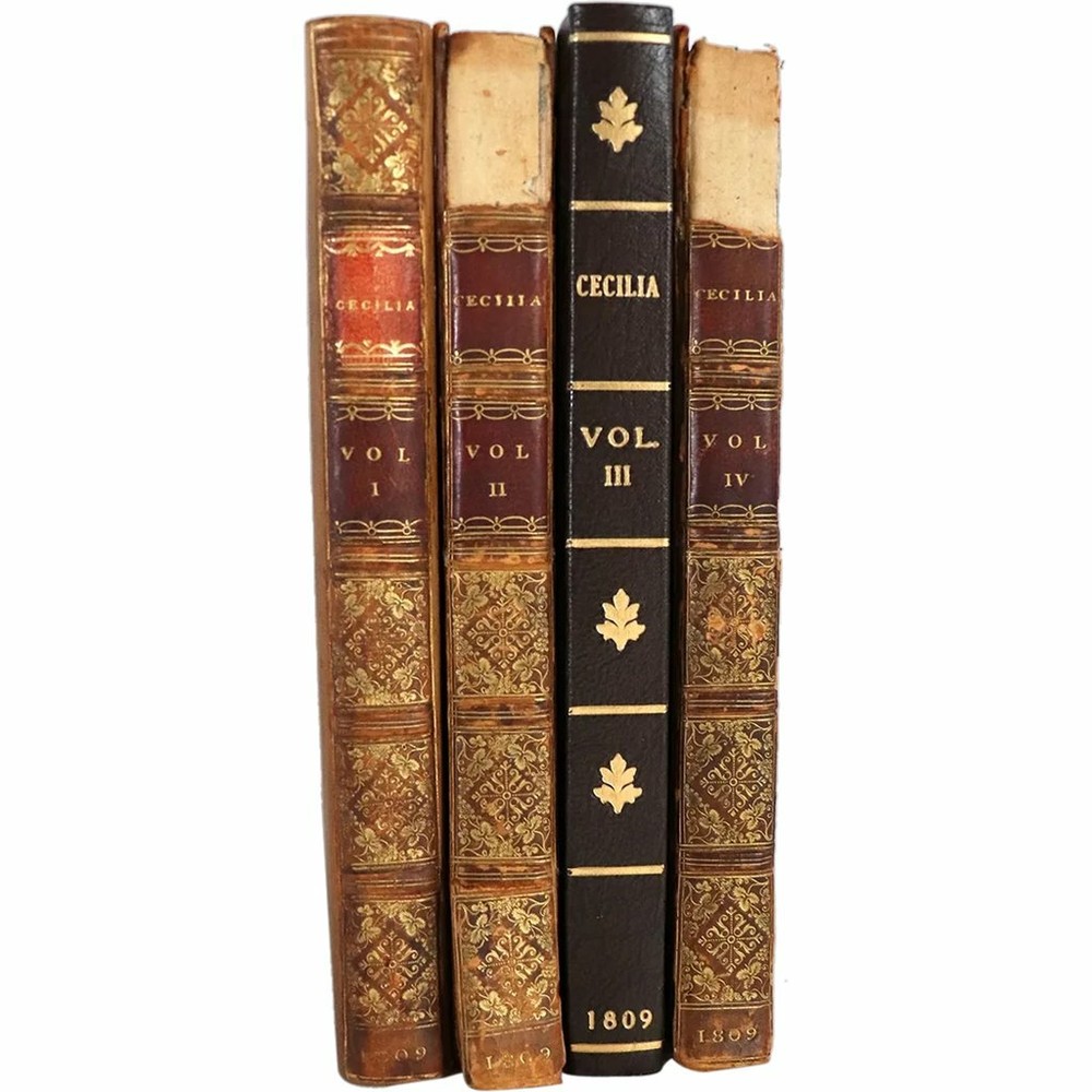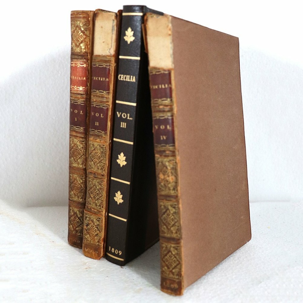 DETAILS Volumes I, II, III, IV. Highly successful book with over 51 editions. TITLE Cecelia or, Memoirs of an Heiress. By the Author of Evelina in Four-Volumes PUBLISHER T. Cadell and W. Davies (London, England) BINDING (3) Brown leather hardcover binding. Gilt embossed lettering. Marbled fore-edge. LANGUAGE English EDITION Ninth edition. Originally published: 1782 SUBJECT(S) Romance, social satire AUTHOR(S) Frances (Fanny/Madame d'Arblay) Burney (English, 1752-1840) PERIOD George III (1760-1820) | Early 19th century DATE Copyright 1809 DIMENSIONS Width 4.5 Depth 1 Height 7 inches CONDITION Note: (1) rebound. Some losses to leather spines. (1) missing leather cover