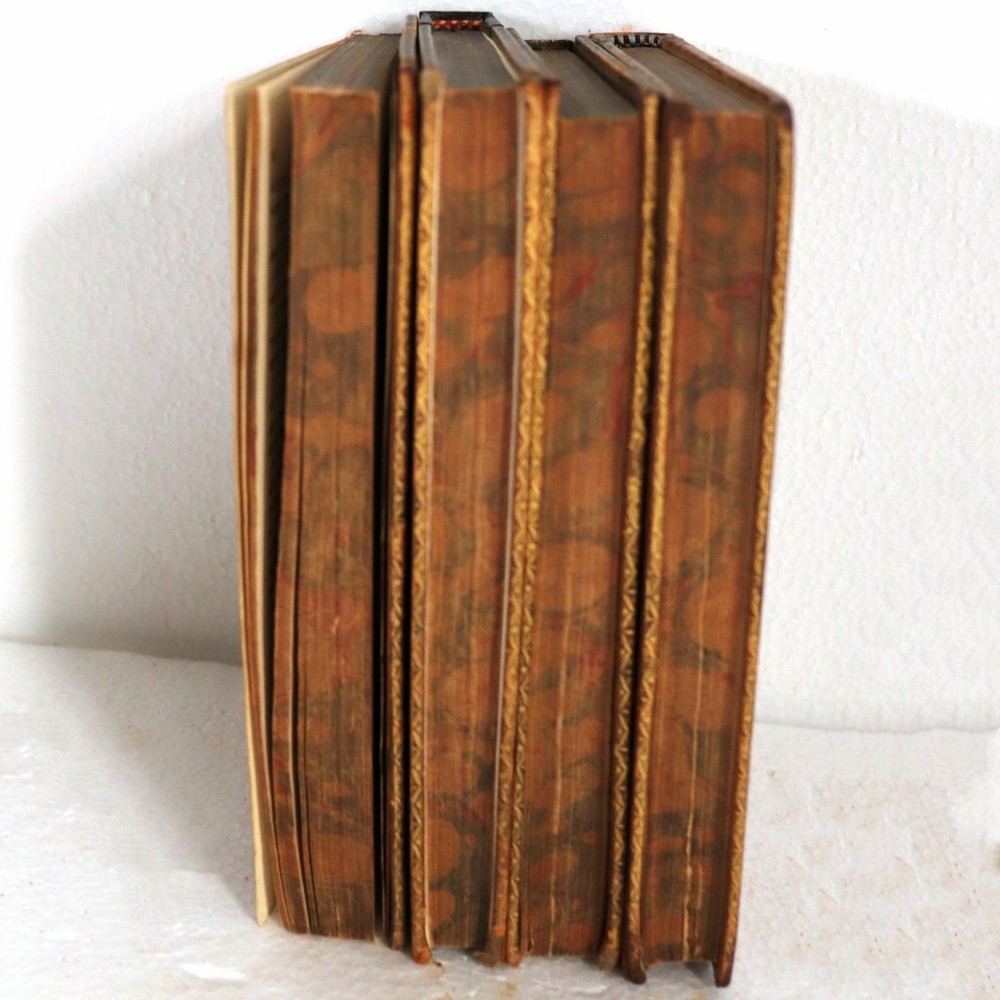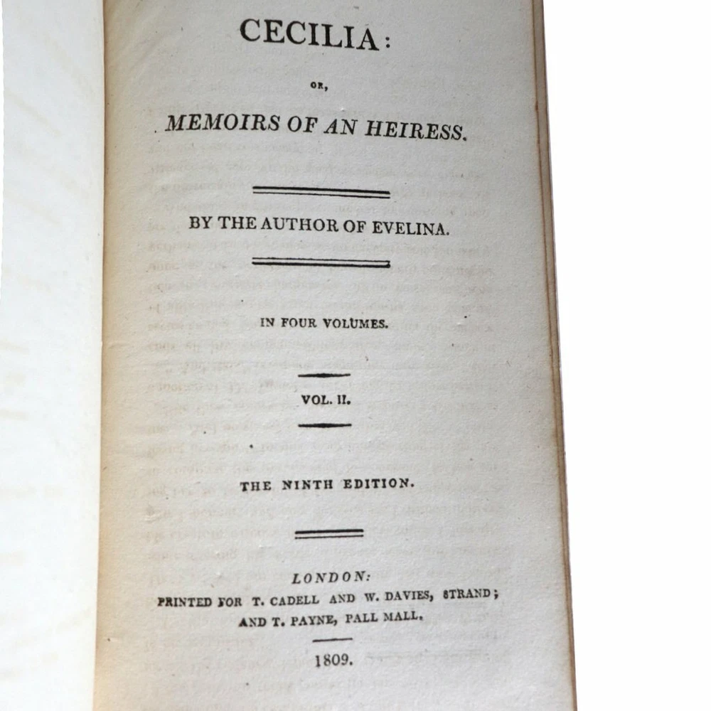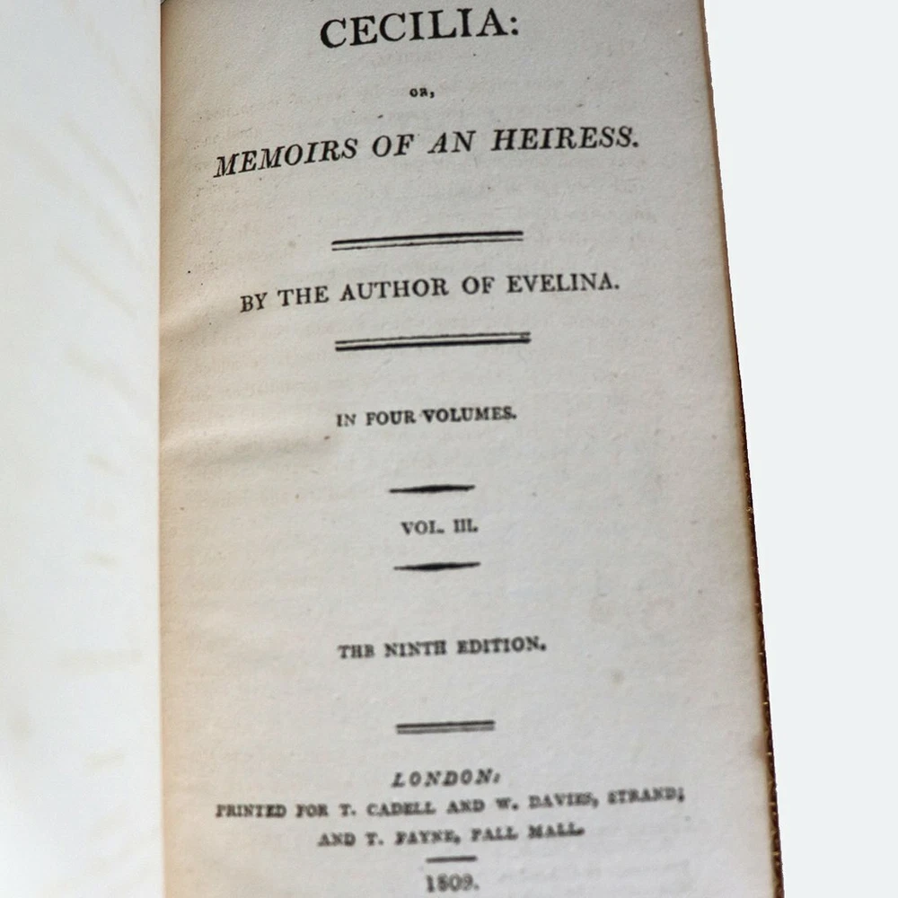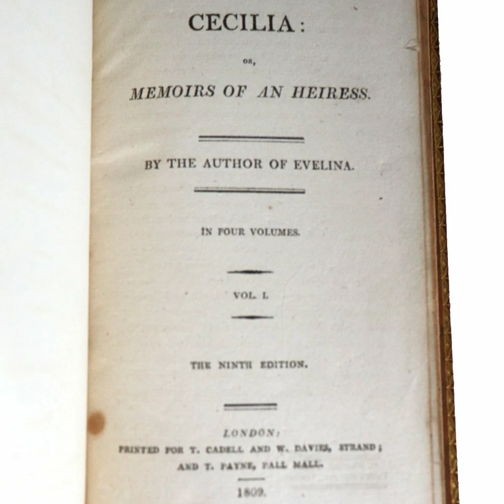 DETAILS Volumes I, II, III, IV. Highly successful book with over 51 editions. TITLE Cecelia or, Memoirs of an Heiress. By the Author of Evelina in Four-Volumes PUBLISHER T. Cadell and W. Davies (London, England) BINDING (3) Brown leather hardcover binding. Gilt embossed lettering. Marbled fore-edge. LANGUAGE English EDITION Ninth edition. Originally published: 1782 SUBJECT(S) Romance, social satire AUTHOR(S) Frances (Fanny/Madame d'Arblay) Burney (English, 1752-1840) PERIOD George III (1760-1820) | Early 19th century DATE Copyright 1809 DIMENSIONS Width 4.5 Depth 1 Height 7 inches CONDITION Note: (1) rebound. Some losses to leather spines. (1) missing leather cover