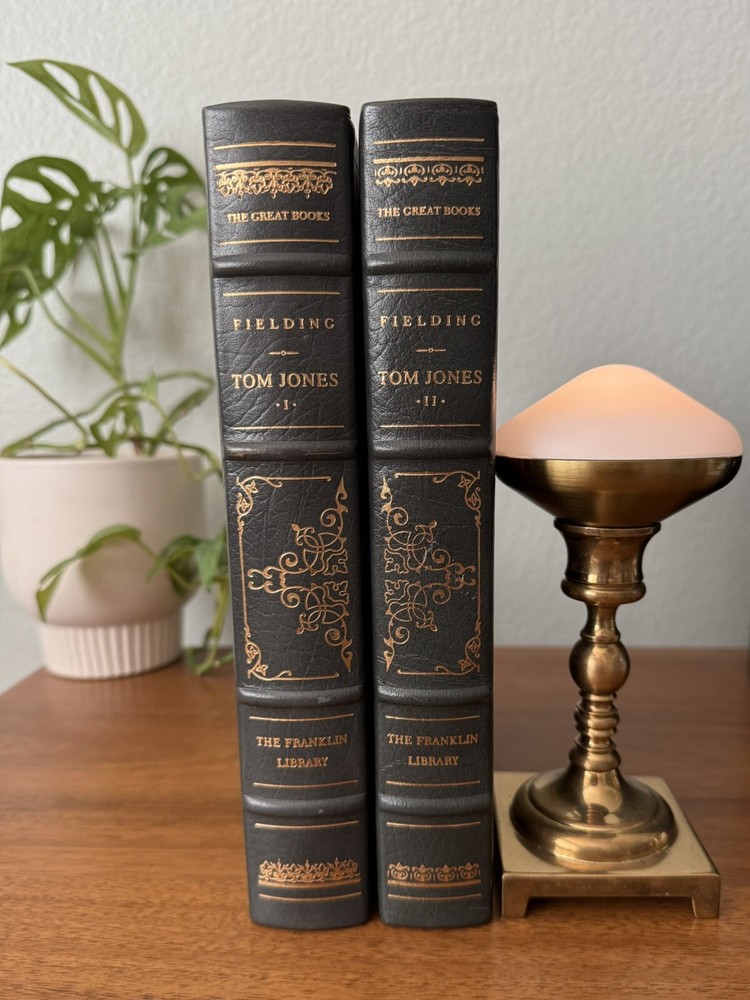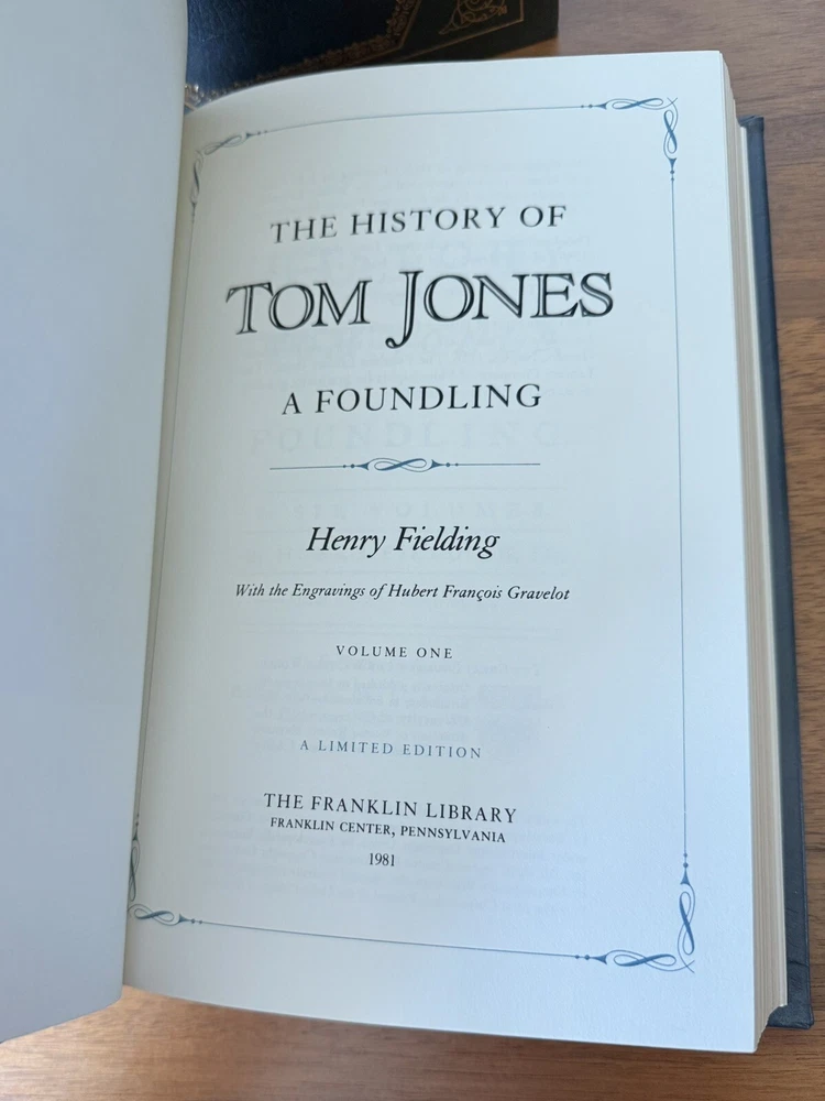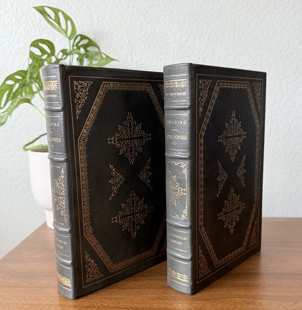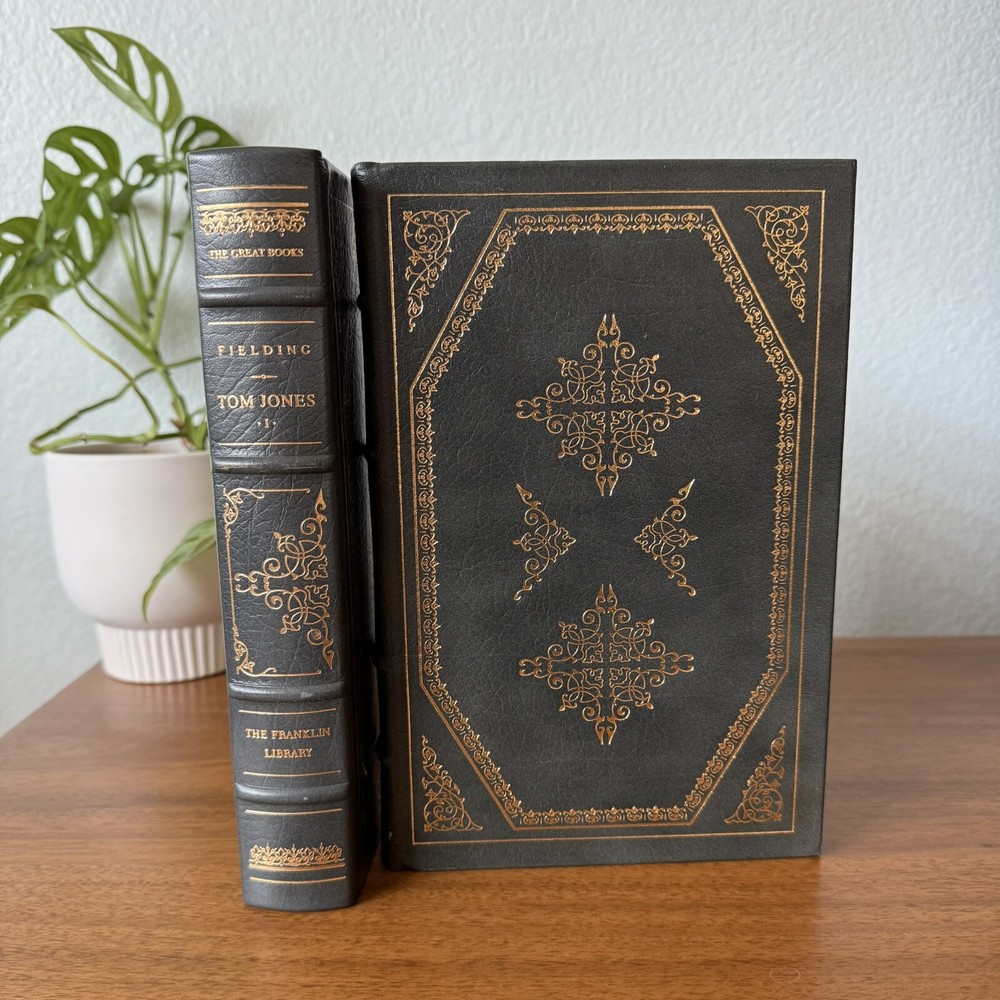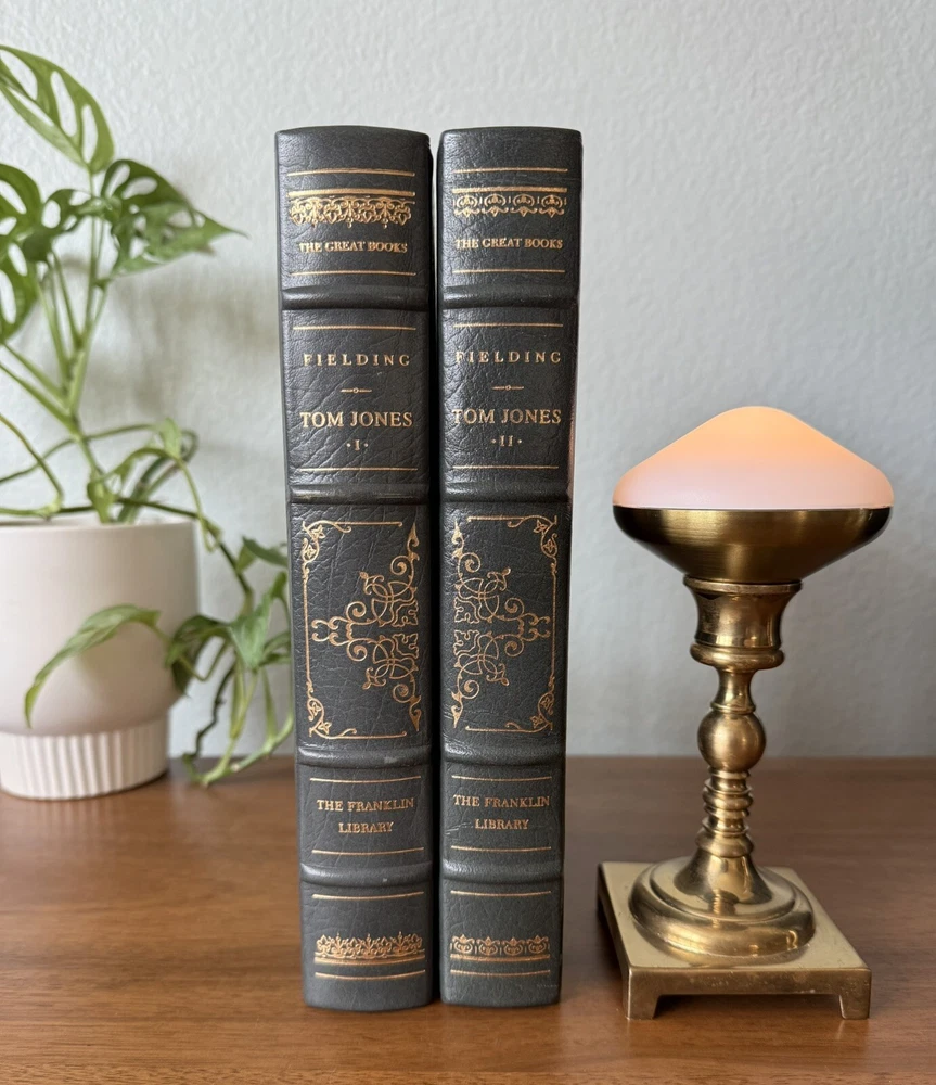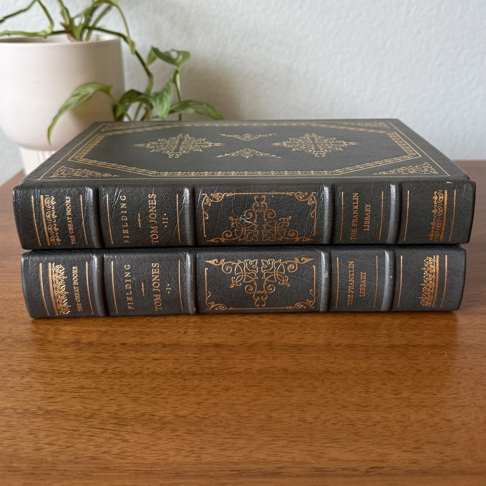 This set of 2 collector's edition books by author Henry Fielding; The History of Tom Jones, a foundling volumes 1 & 2. Published by Franklin Library in 1981 in Pennsylvania, United States. These books are part of the 25th Anniversary Limited Edition of the Great Books of the Western World series. They are in excellent preowned condition, look to be unread and near mint. Accented in 22kt gold. Leather Bound. Printed on archival paper with gilded edges. The endsheets are of moire fabric with a silk ribbon page marker. Smyth sewing and concealed muslin joints.