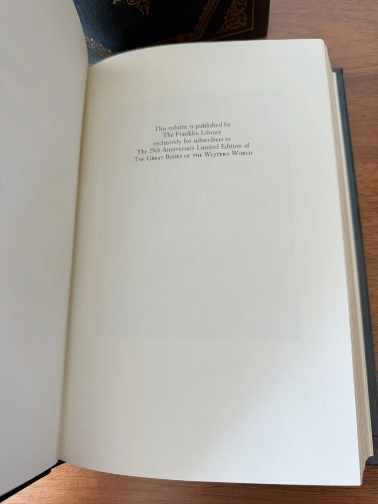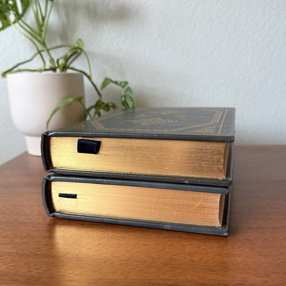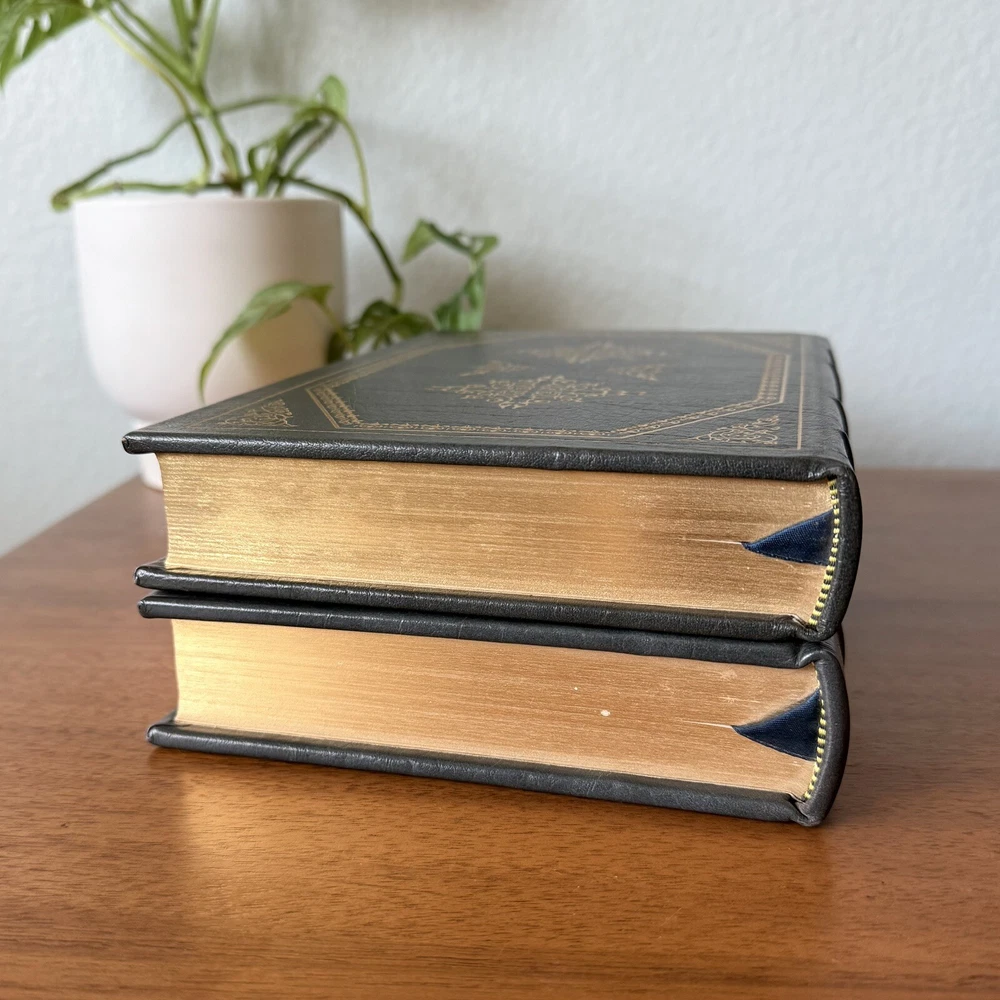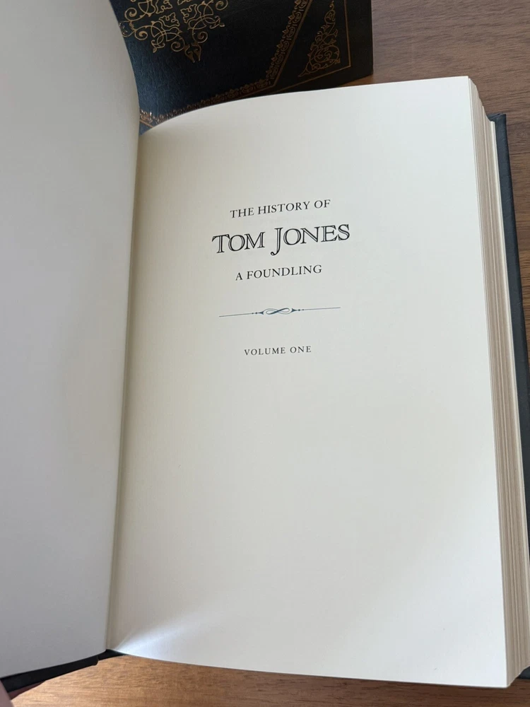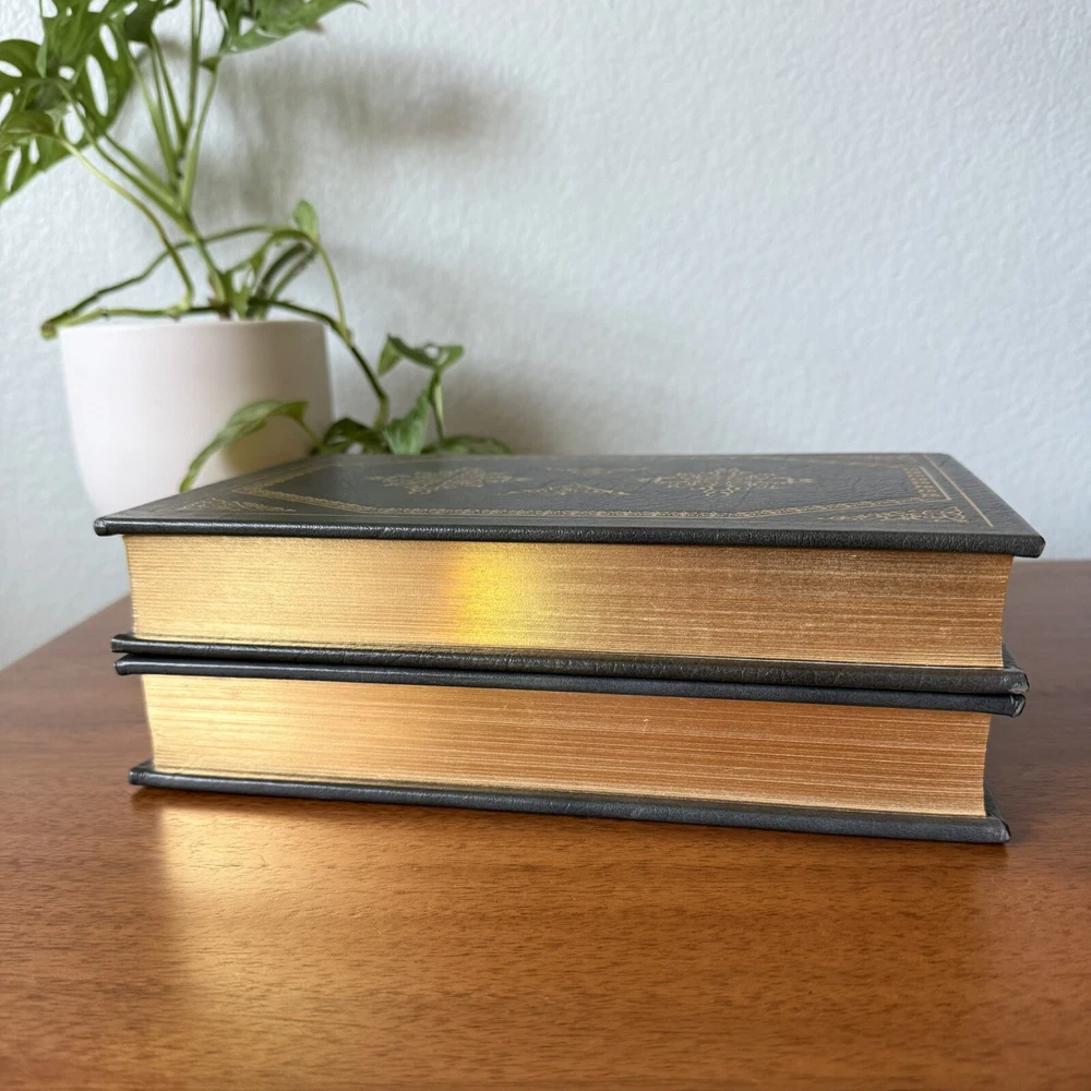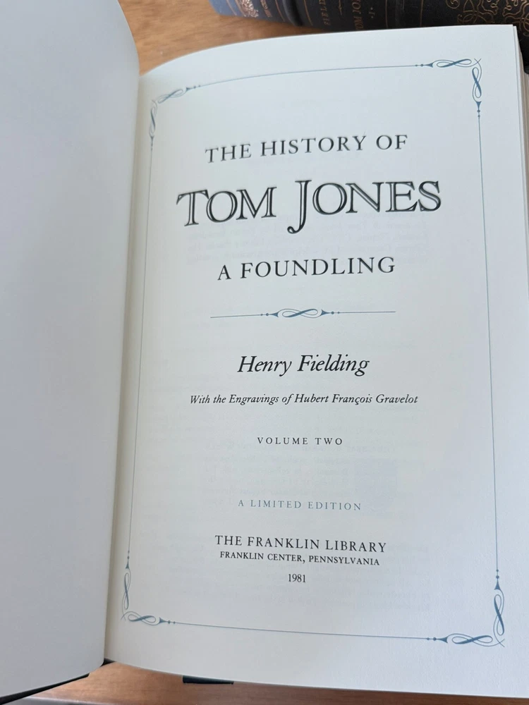 This set of 2 collector's edition books by author Henry Fielding; The History of Tom Jones, a foundling volumes 1 & 2. Published by Franklin Library in 1981 in Pennsylvania, United States. These books are part of the 25th Anniversary Limited Edition of the Great Books of the Western World series. They are in excellent preowned condition, look to be unread and near mint. Accented in 22kt gold. Leather Bound. Printed on archival paper with gilded edges. The endsheets are of moire fabric with a silk ribbon page marker. Smyth sewing and concealed muslin joints.