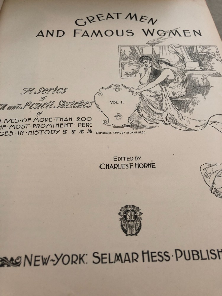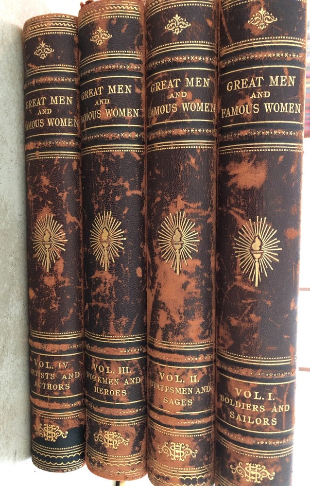Full, four-volume set, Great Men and Famous Women, by Charles Horne. Volumes 1-4, published in 1894 by Selmar Hess. Leather binding. "A Series of Pen and Pencil Sketches of the lives of more than 200 of the most prominent personages in history." Bindings are tight, covers in tact. They do show shelf wear. Pages, illustrations and text are clean. No detectable handwriting, markings or other imperfections. Volume 1: Soldiers and Sailors. Volume 2: Statesmen and Sages. Volume 3: Workmen and Heroes. Volume 4: Artists and Authors. This rare collection has been kept in a custom built library away from sunlight for as long as I can remember. No pets or smokers in the home.
