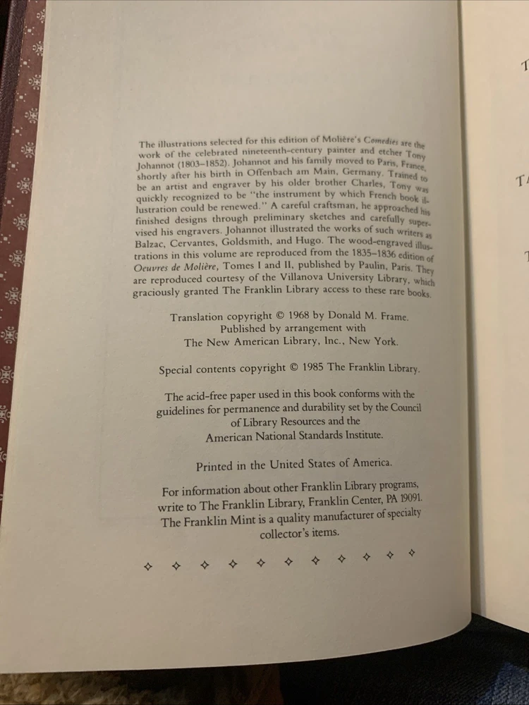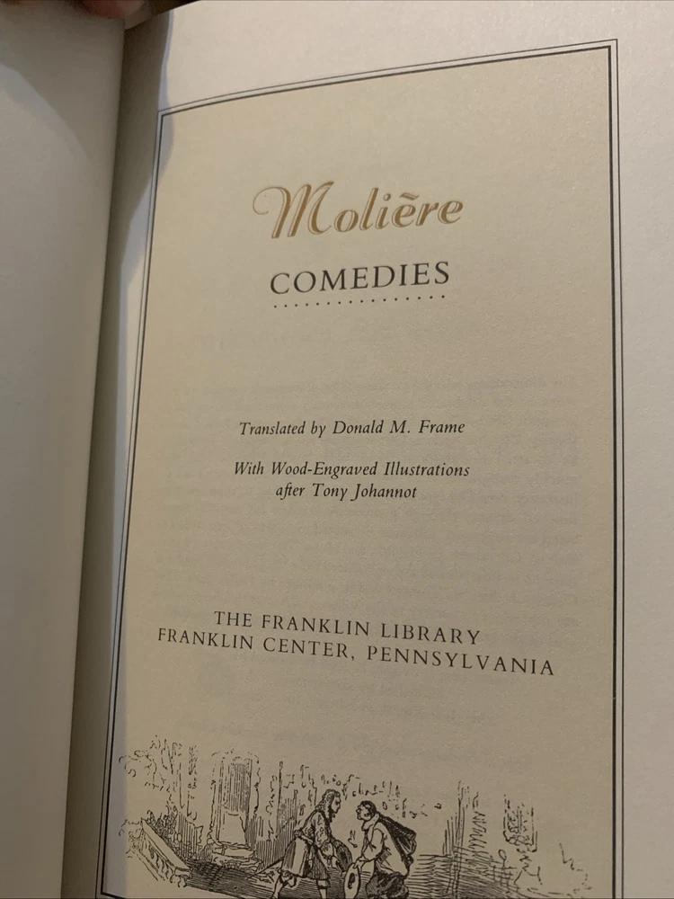 This set of three books from Franklin Library features classic works of literature and fiction. The collection includes comedies by Moliere, plays by Shakespeare, and adventures of Huckleberry Finn. The books are beautifully bound in leather with collector's edition and illustrated special attributes. The authors of the books are various, and the set is an original edition published by Franklin Library in the United States. The books are written in English and are perfect for readers who enjoy classics. The set is a great addition to any book lover's collection.