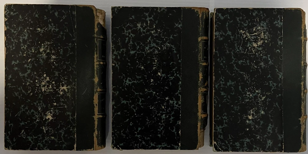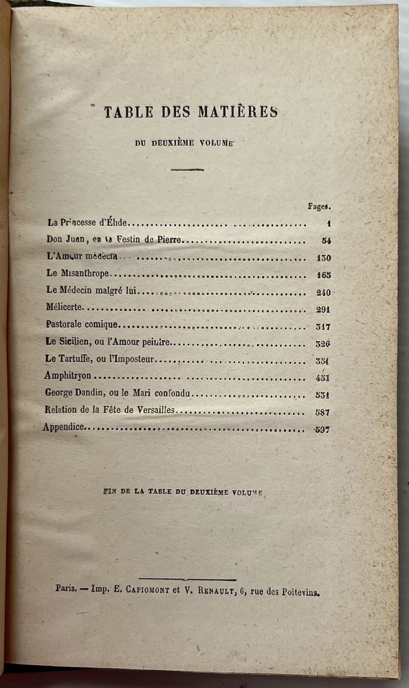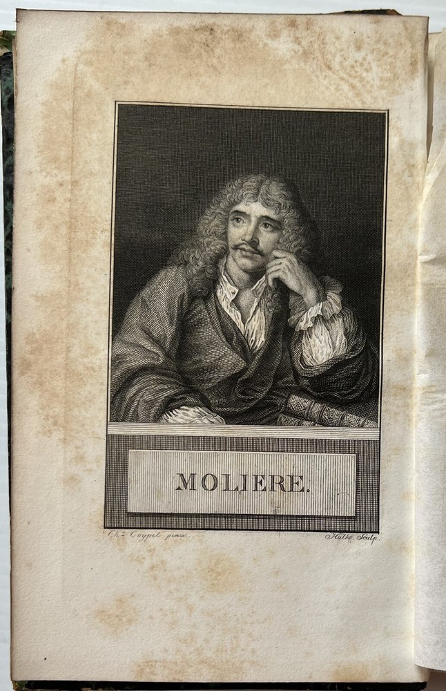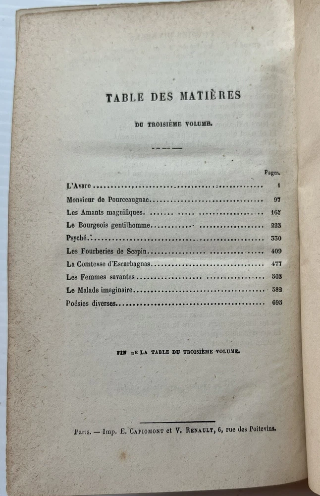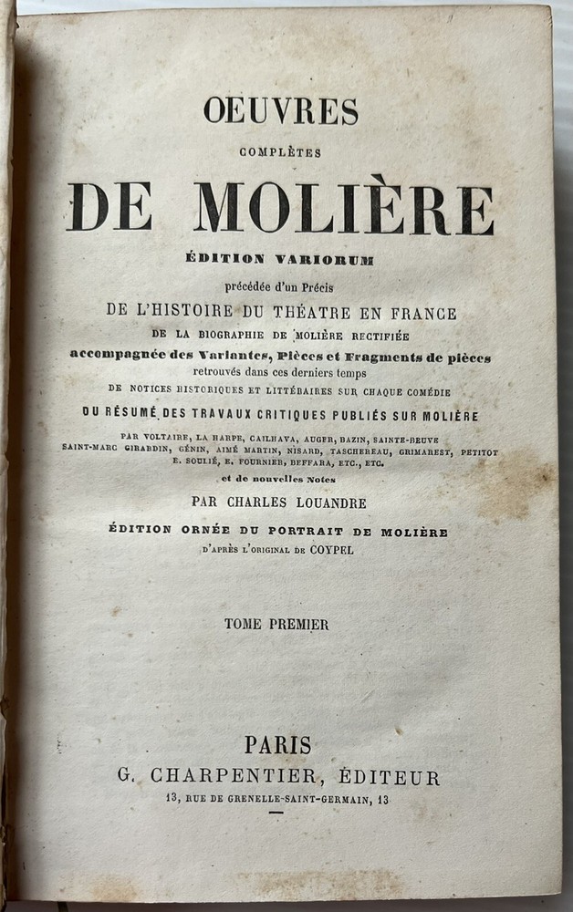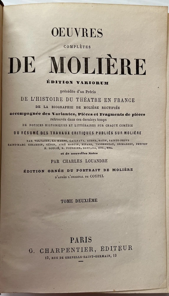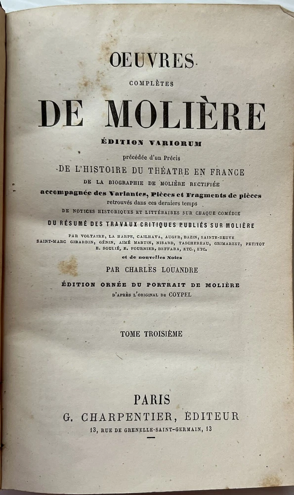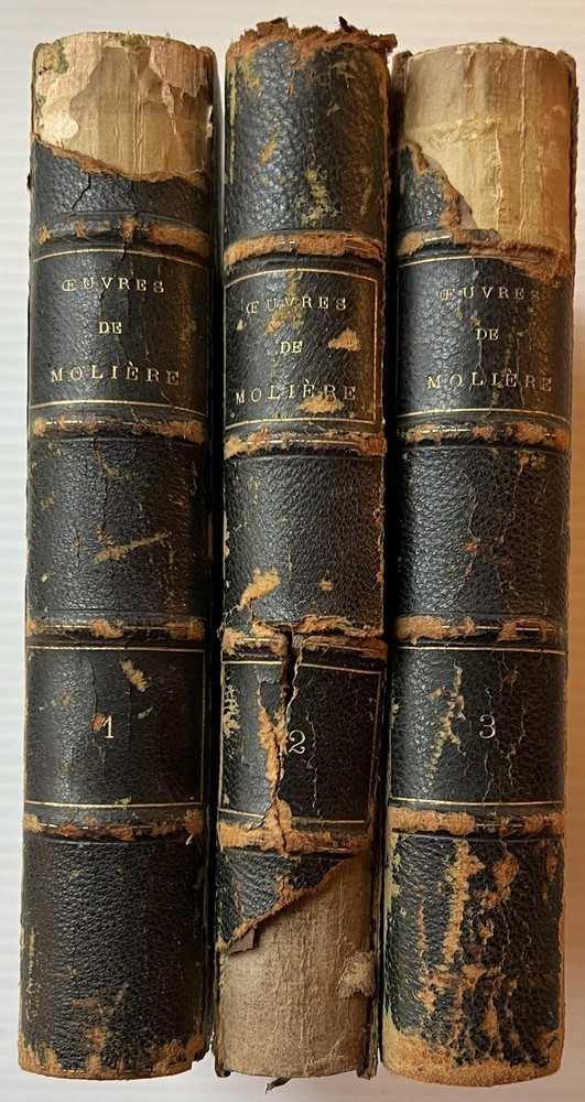 (Set of 3 Volumes in French) OEUVRES COMPLETES DE MOLIERE, Edition Variorum . New Notes by Charles Loundre. Paris, G. Charpentier, no date (estimated later 1800s?*) 1/2 Leather with Marbled Boards. 3 volumes with dark green half-leather at spines. Boards are black and green marbling. The leather on spines is fragile, deteriorated, and missing some pieces (seen in photos) Leather is rubbed and scraped. The gilt titling and volume numbers on spines are rubbed but legible. Spine leather of v. 2 is detached in front and hanging loose. The marbled boards show considerable edgewear, bumped and frayed corners, scraped surfaces front and rear. Hinges vary: the boards of v 1 are tight and secure; v. 2 is tight at the rear and essentially detached, hanging by threads at front; boards of v. 3 are tight and secure. Binding of all 3 volumes is tight, no loose pages. Text pages are clean, no writing, quite bright with some toning at the margins. Volume 1 has a frontis portrait of Moliere that is tissue protected but quite foxed at margins; no other plates or illustrations. The volumes have thin green silk ribbon markers. In spite of the exterior condition, the text in this set is complete and in good condition, ehhanced by the historical and critical material gathered by the eidtors. 4.75" x 7" The 3 contents pages (see photos) list the plays. The full contents of the set as transcribed from the title page: "Oeuvres Completes de Moliere, Edition Variorum, Precede d'un Precis de L'Histoire du Theatre en France de la Biographie de Moliere Rectifee, Accompagnee des Variantes, Pieces et Fragments de Pieces Retrouvee Dans ces Derniers Temps de Notices Historiques et Litteraires sur Chaque Comedie de Resume de Trauvaux Critiques Publies Sur Moliere par Voltaire, La Harpe,...etc., etc. et de Nouvelles Notes Par Charles Louandre. Edition Ornee De Portrait de Moliere D'Apres L'Original de Coypel." *No date is found in the volumes; the editor, C. Loundre, lived 1812-1882; publisher G. Charpentier took over his father's publishing house in 1872, so a good guess as to date places the set later 1800s, 1880s?