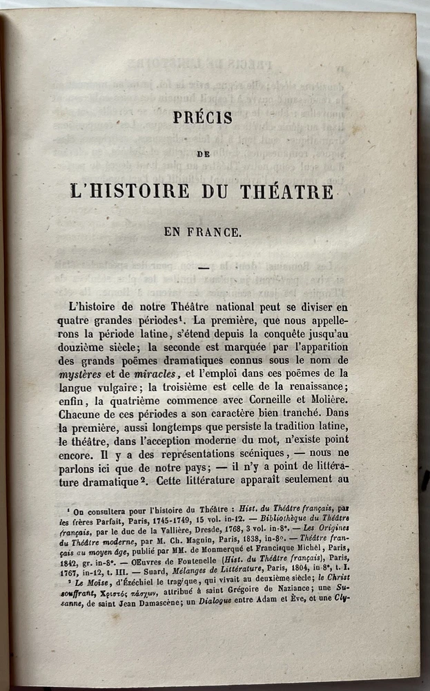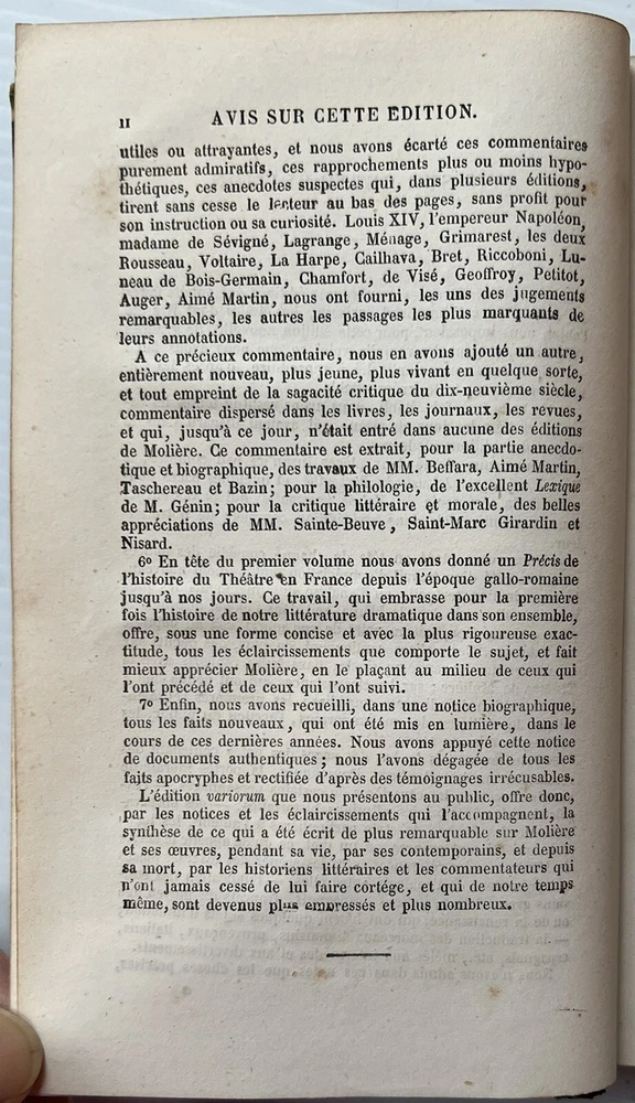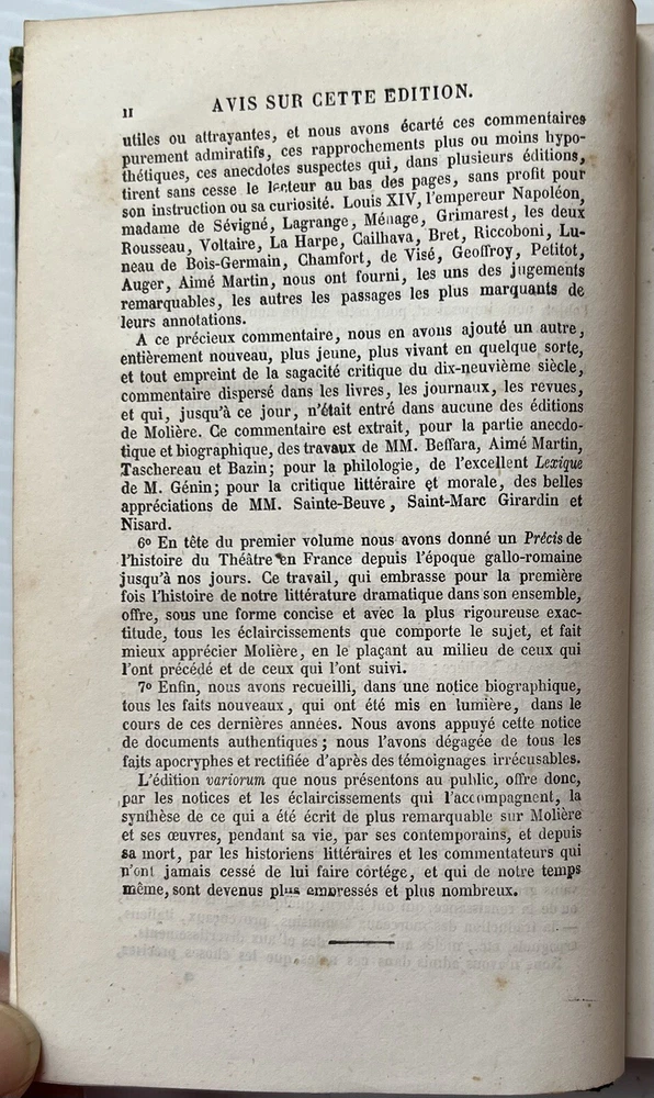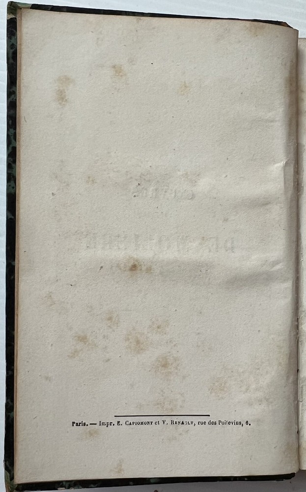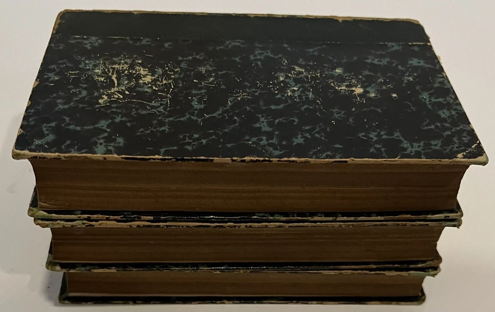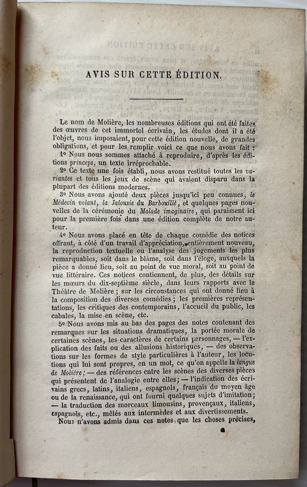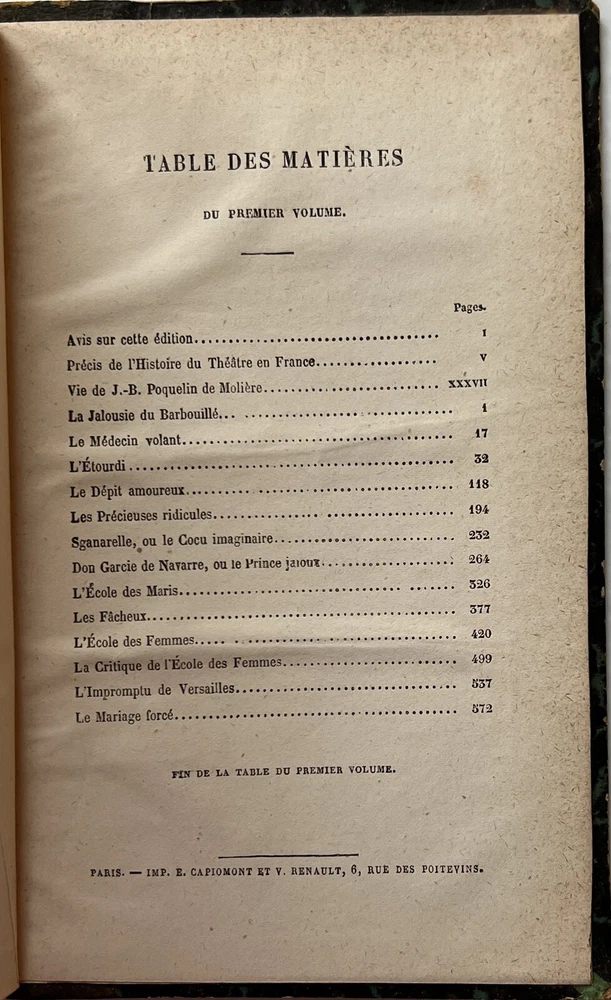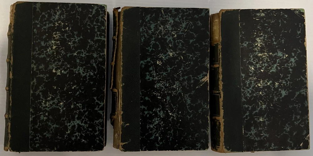 (Set of 3 Volumes in French) OEUVRES COMPLETES DE MOLIERE, Edition Variorum . New Notes by Charles Loundre. Paris, G. Charpentier, no date (estimated later 1800s?*) 1/2 Leather with Marbled Boards. 3 volumes with dark green half-leather at spines. Boards are black and green marbling. The leather on spines is fragile, deteriorated, and missing some pieces (seen in photos) Leather is rubbed and scraped. The gilt titling and volume numbers on spines are rubbed but legible. Spine leather of v. 2 is detached in front and hanging loose. The marbled boards show considerable edgewear, bumped and frayed corners, scraped surfaces front and rear. Hinges vary: the boards of v 1 are tight and secure; v. 2 is tight at the rear and essentially detached, hanging by threads at front; boards of v. 3 are tight and secure. Binding of all 3 volumes is tight, no loose pages. Text pages are clean, no writing, quite bright with some toning at the margins. Volume 1 has a frontis portrait of Moliere that is tissue protected but quite foxed at margins; no other plates or illustrations. The volumes have thin green silk ribbon markers. In spite of the exterior condition, the text in this set is complete and in good condition, ehhanced by the historical and critical material gathered by the eidtors. 4.75" x 7" The 3 contents pages (see photos) list the plays. The full contents of the set as transcribed from the title page: "Oeuvres Completes de Moliere, Edition Variorum, Precede d'un Precis de L'Histoire du Theatre en France de la Biographie de Moliere Rectifee, Accompagnee des Variantes, Pieces et Fragments de Pieces Retrouvee Dans ces Derniers Temps de Notices Historiques et Litteraires sur Chaque Comedie de Resume de Trauvaux Critiques Publies Sur Moliere par Voltaire, La Harpe,...etc., etc. et de Nouvelles Notes Par Charles Louandre. Edition Ornee De Portrait de Moliere D'Apres L'Original de Coypel." *No date is found in the volumes; the editor, C. Loundre, lived 1812-1882; publisher G. Charpentier took over his father's publishing house in 1872, so a good guess as to date places the set later 1800s, 1880s?