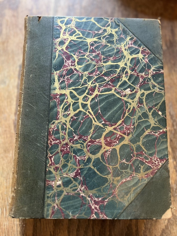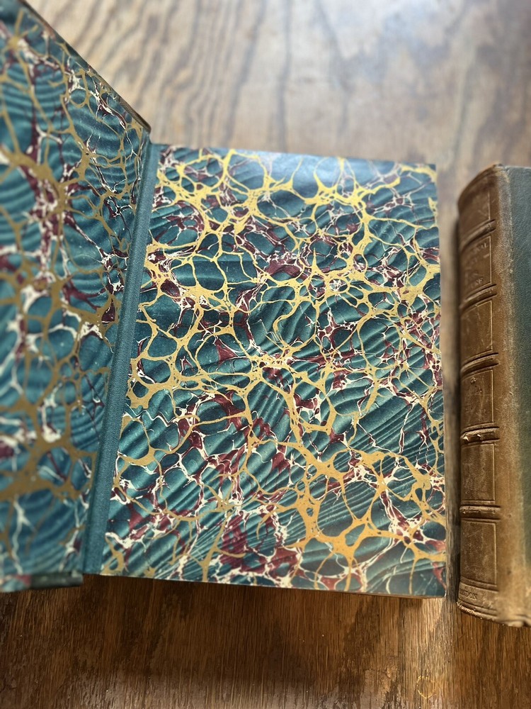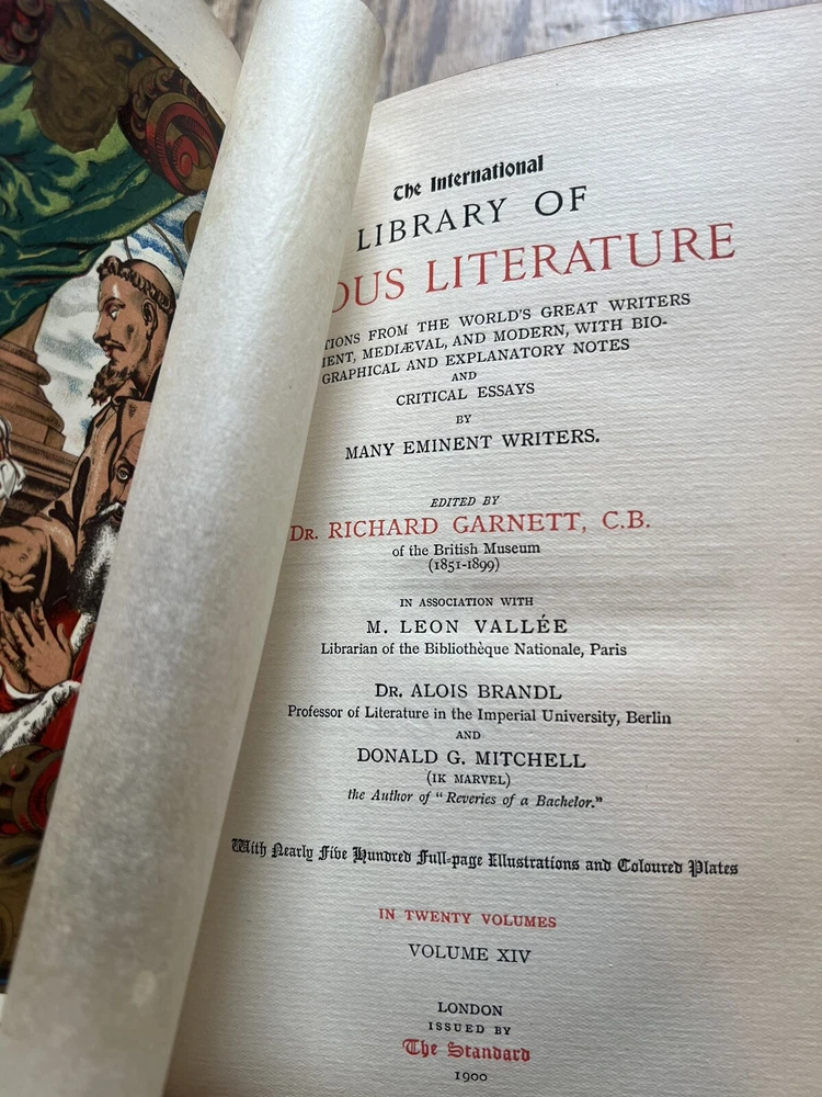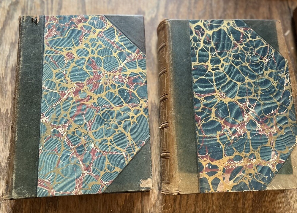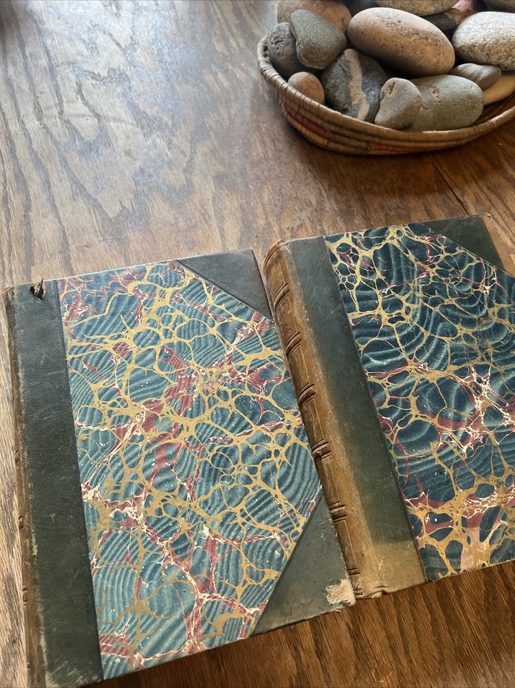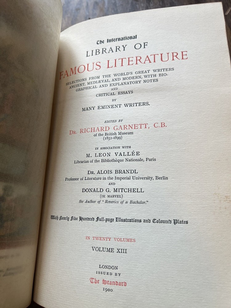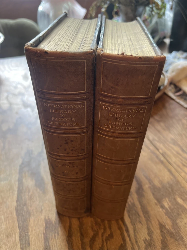Set of two antiquarian books: three-quarter green, leather bound, marbled covers and marbled and papers, guild, top edge, and guild titles on spine, raised bands on spine. International library of famous literature, three volumes published by the standard in London in 1900. A set of two out of a total of 20 volumes. Edited by Dr. Richard Garnett. These volumes include number 14, number 13 in there Selections from these authors: Henry James Oliver, Wendell Holmes JM, Berrie, Hans Christian Andersen, nathaniel Hawthorne, Lewis, Carroll, Henry Longfellow, William Thackery, Longfellow, John, Keats, Mark Twain, Charles Dickens, Sir Walter Scott, James Fenimore, Cooper, Francis Bacon, Lord Byron, Victor Hugo, Ballack, John Greenleaf, Whittier, Robert Browning, Charles Darwin, Shakespeare, Charlotte Brontë, Alexandre Dumas