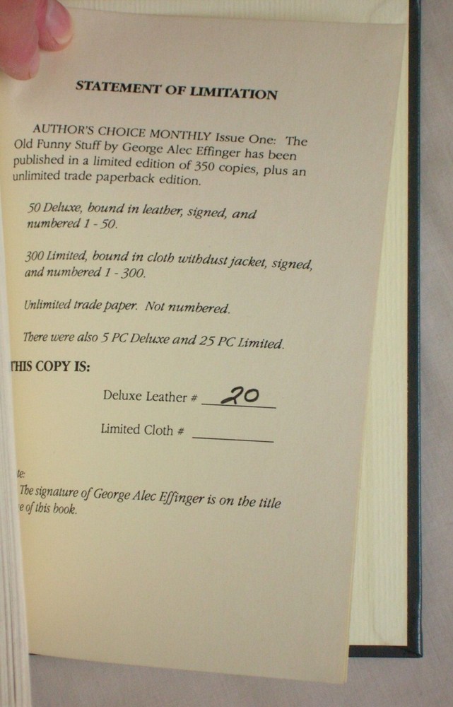 This is a hardcover first edition, first printing, published by Pulphouse Publishing . Number 20 of 50 copies signed by the author on the title page. Book is bound in leather and is in near fine (very very slight wear at upper edge of front cover) condition without a dustjacket as issued. An Attractive Copy! All books are carefully wrapped in bubble wrap and shipped in boxes. International buyers are welcome. Thanks for shopping at Mind Electric Books!