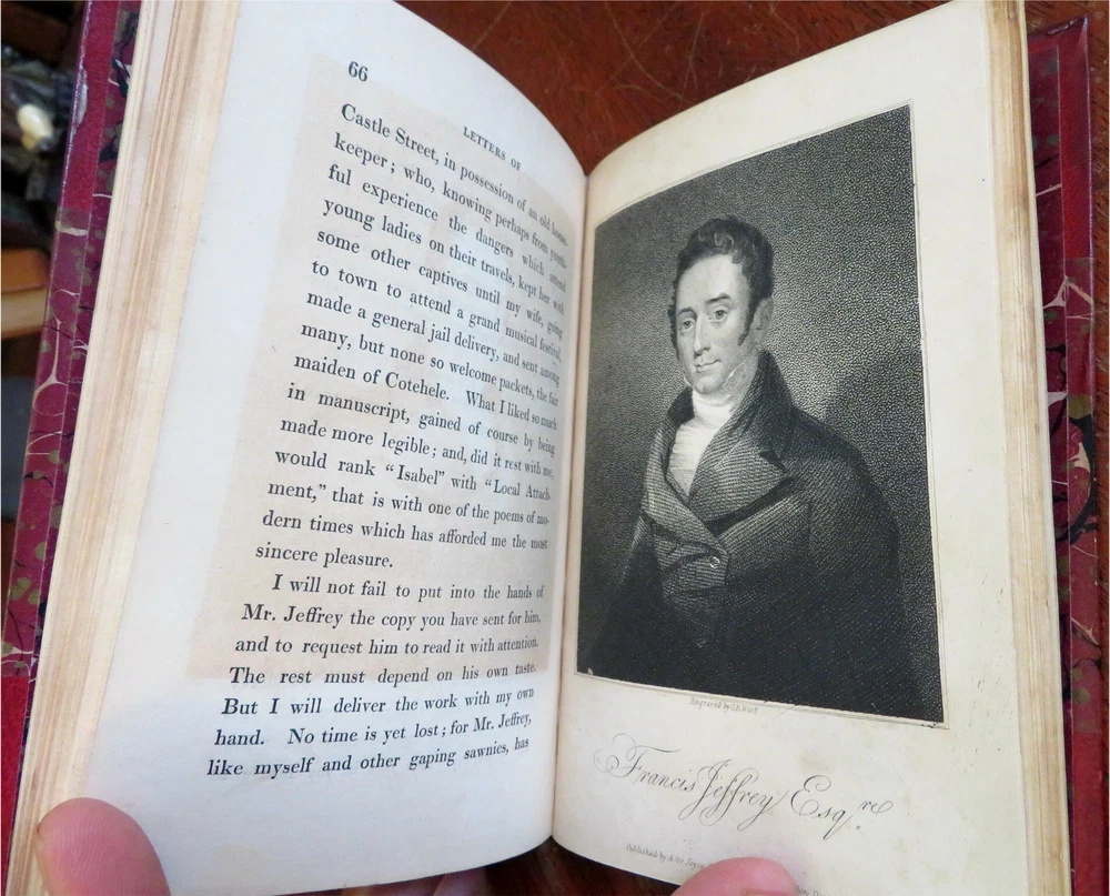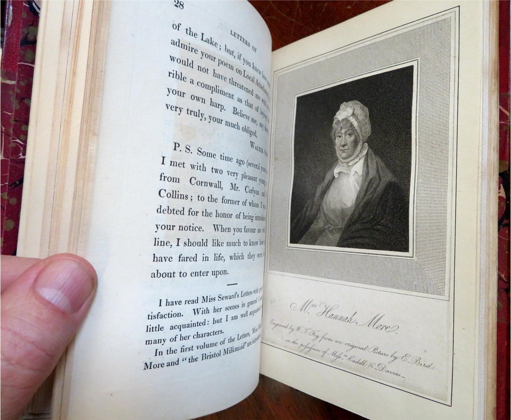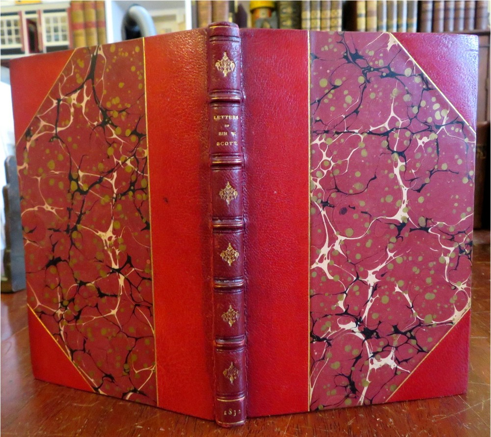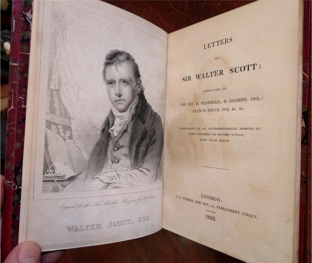 Sir Walter Scott 1832 Collected Letters Zaehnsdorf red leather book 8 engravings Sir Walter Scott 1832 Collected Letters Zaehnsdorf red leather book 8 engravings (Old Books, 19th Century Books, Leather Books, Sir Walter Scott, Collected Letters). Letters of Sir Walter Scott; Addressed to the Rev. R. Polwherle; D. Gilbert, Esq; Francis Douce, Esq, &c. &c. Published 1832, London by J.B. Nichols and Son. 103 pages. Text in English. Engraved frontis portrait. Extra-Illustrated (grangerized) with a total of eight fine early steel engraved portraits. Publisher's catalog at rear. Stamped binding by Zaehnsdorf. Beautiful period 1/2 red morocco leather binding, raised & gilt bands, gilt compartment decorations & gilt title lettering, marbled covers & end papers, t.e.g. Book is physically old and shows some signs of handling and time. Book is not new or in "new" condition. Binding gently age worn but still appealing, leather rubbed but still supple, joints slightly scuffed, remains overall attractive as an object. Text block paper is gently toned, internally still clean, well preserved, tight, sound. Still attractive on the shelf. Book displays a pleasing and unique age patina and is in nice antiquarian condition, any age flaws easy to overlook or forgive. Please review photos for more detail and our best attempt to convey how this beautiful and one of a kind book survives. Book Measures c. 7 1/4" H x 5" W. [B4486 -BR1124].