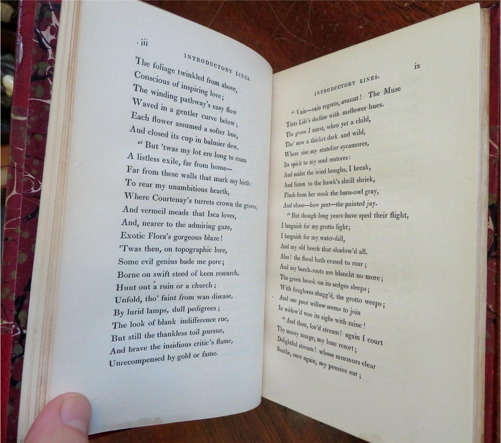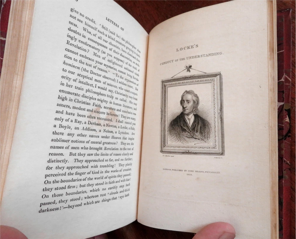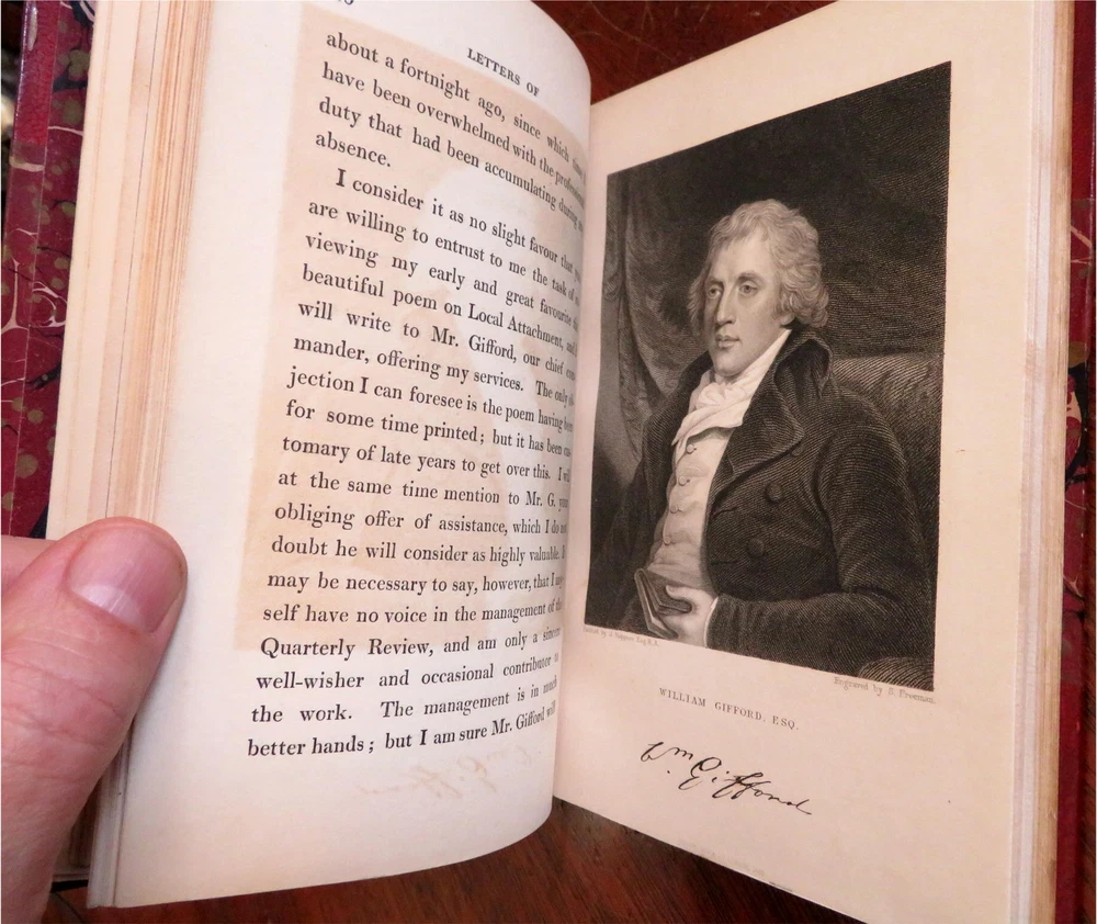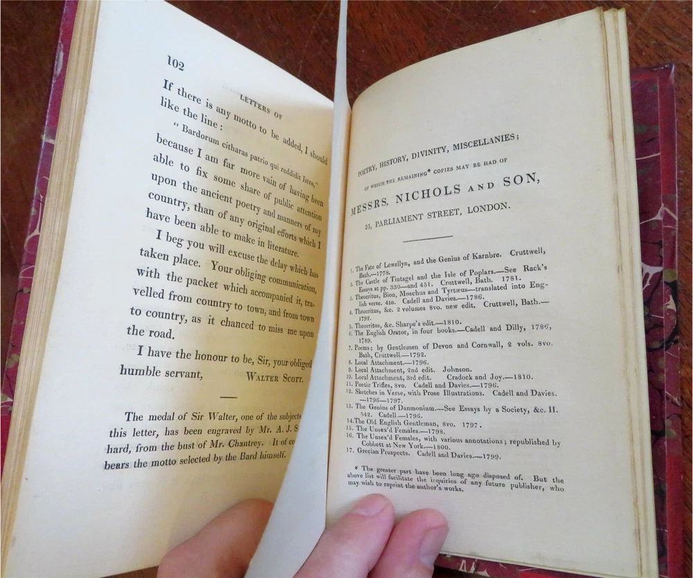 Sir Walter Scott 1832 Collected Letters Zaehnsdorf red leather book 8 engravings Sir Walter Scott 1832 Collected Letters Zaehnsdorf red leather book 8 engravings (Old Books, 19th Century Books, Leather Books, Sir Walter Scott, Collected Letters). Letters of Sir Walter Scott; Addressed to the Rev. R. Polwherle; D. Gilbert, Esq; Francis Douce, Esq, &c. &c. Published 1832, London by J.B. Nichols and Son. 103 pages. Text in English. Engraved frontis portrait. Extra-Illustrated (grangerized) with a total of eight fine early steel engraved portraits. Publisher's catalog at rear. Stamped binding by Zaehnsdorf. Beautiful period 1/2 red morocco leather binding, raised & gilt bands, gilt compartment decorations & gilt title lettering, marbled covers & end papers, t.e.g. Book is physically old and shows some signs of handling and time. Book is not new or in "new" condition. Binding gently age worn but still appealing, leather rubbed but still supple, joints slightly scuffed, remains overall attractive as an object. Text block paper is gently toned, internally still clean, well preserved, tight, sound. Still attractive on the shelf. Book displays a pleasing and unique age patina and is in nice antiquarian condition, any age flaws easy to overlook or forgive. Please review photos for more detail and our best attempt to convey how this beautiful and one of a kind book survives. Book Measures c. 7 1/4" H x 5" W. [B4486 -BR1124].