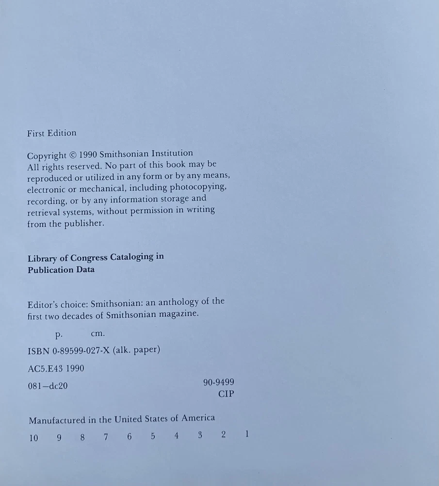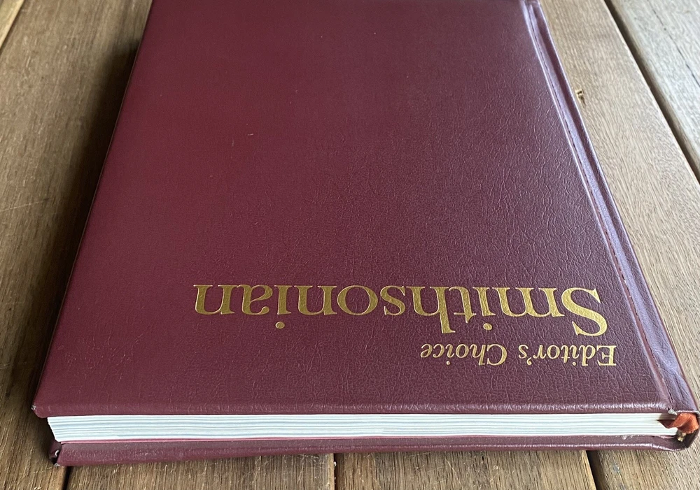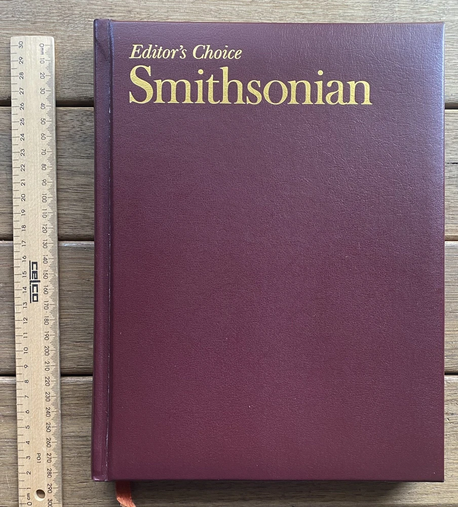 Smithsonian Editor's Choice 1990 First Edition Faux-Leather Padded Hardcover "An anthology of the first two decades of Smithsonian Magazine" 1.3kg Minor wear to vintage hardcover cover and spine. No dust jacket. Pages secure in binding, however gutter visible on page 116. Pages looks to be clean and crease free. Please see the photos as they are part of the description. Will be well wrapped for shipping.