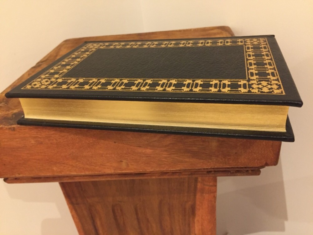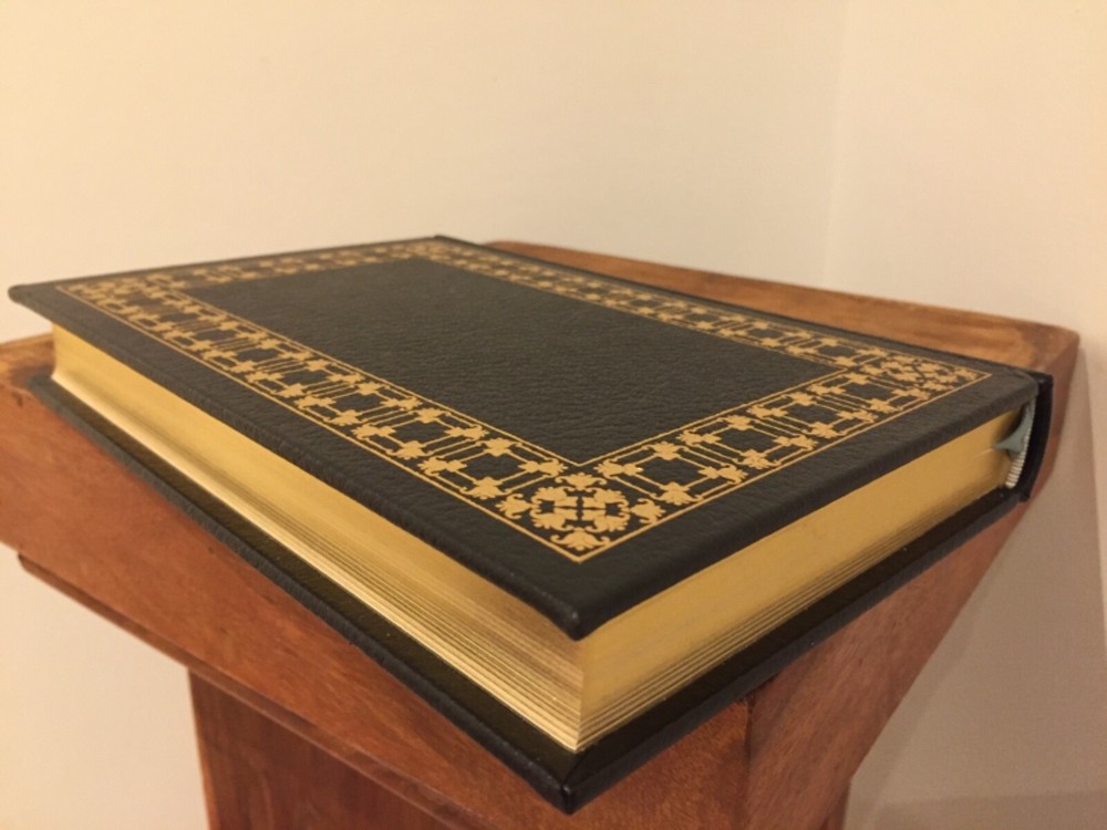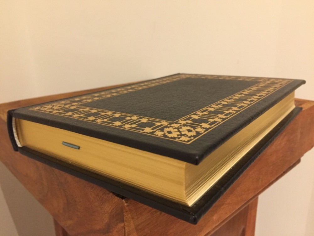 This is full genuine leather bound in new condition, never opened or read. There is no damage to the leather, no damage to the gold gilding of the page block, no frayed bookmark, no sun fading to the moire end pages. There is some form of unevenness to the gold gilding of the page block, as shown in the photos. Photos show no sagging of the page block, which means it was never displayed and the top has not separated from the spine . 'The Sound and The Fury' by William Faulkner is one of Franklin Library's ‘The 100 Greatest Masterpieces of American Literature’, with wonderful attributes: •Fully and tightly bound in genuine leather. •22kt gold accents deeply inlaid on the "hubbed" spine and covers. •Heavy duty binding boards enhance the book’s durability. •Superbly printed on acid-neutral paper that lasts for generations. •Sewn pages – not just glued like ordinary books. •Handsome moiré end pages and a satin-ribbon page marker. •Gold gilded page ends. •Rigorous inspection at every stage ensured adherence to exacting standards and the highest quality. •Superb craftsmanship and commitment to quality. The appeal for collecting Franklin Library comes from having these attributes taken way further into the exquisite quality, durability and craftmanship, than Easton Press and Folio Society managed with their productions. This book is the perfect companion out on a park bench with a hot cup of coffee or snuggled up in front of the fireplace. Despite its all-inclusive nature it still feels very light and compact at a size of 3 x 16 x 24cm. Wonderful to hold and excellent reading experience.
