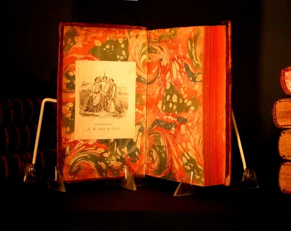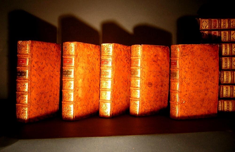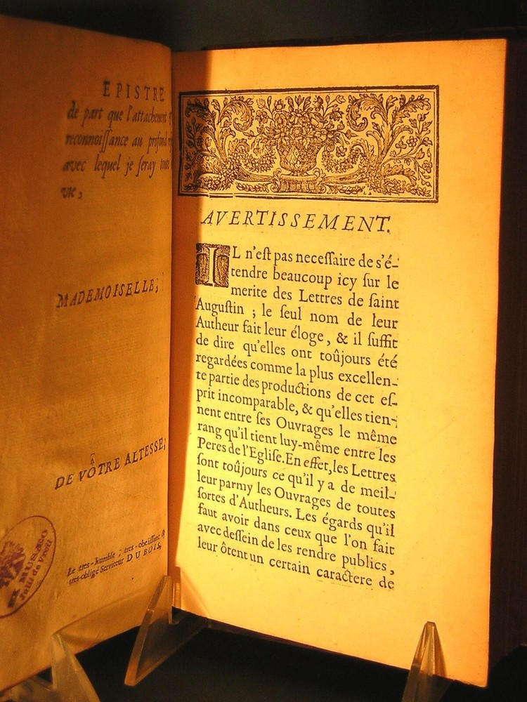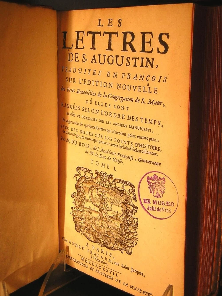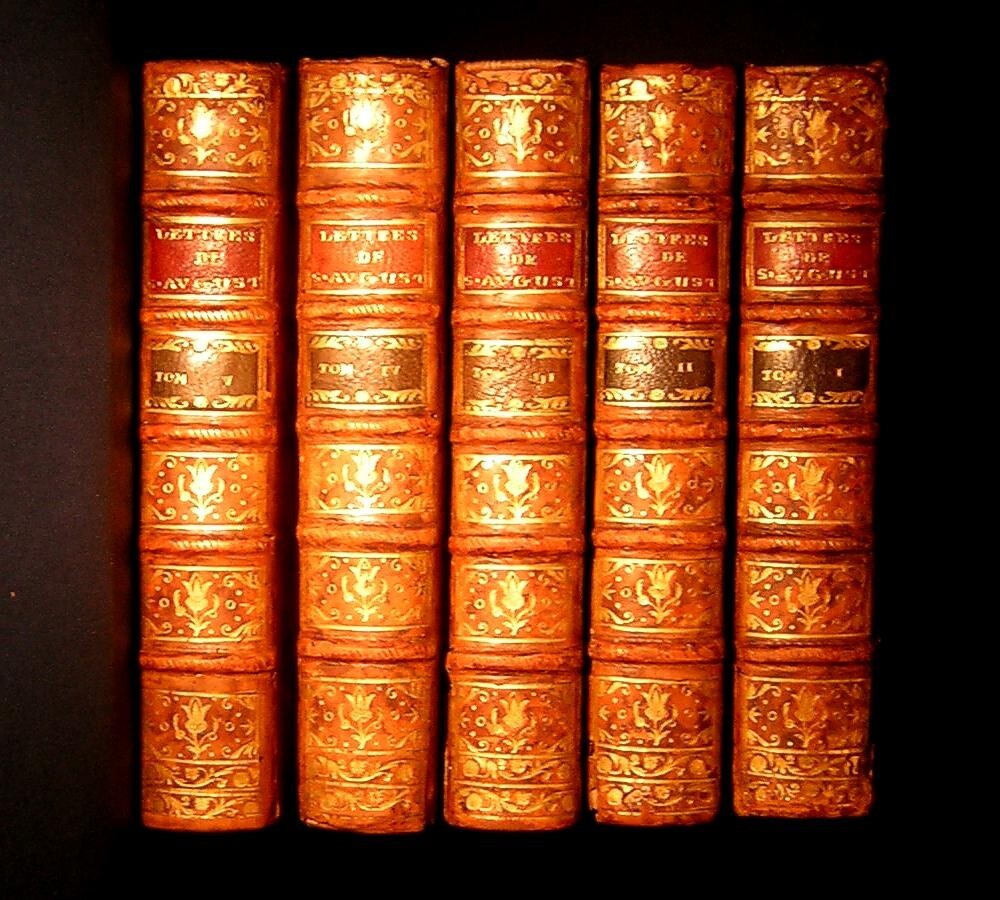Argentum Romanum is proud to present for your consideration Two magnificent, important, and complete antiquarian sets of the work of the great Christian theologian and philosopher St. Augustine of Hippo, in spectacular gilt full-leather bindings dating from the reign of Louis XIV. Both sets shown together for illustrative purposes. Note that each set is a separate listing; Psalms and Letters. The phrase "museum quality" is tossed about quite commonly these days but these volumes actually come to us from a Museum (The Letters) and a Monastery (The Psalms) hence the sets' complete and intact condition well into their fourth century of existence. Almost incredibly, these books were published during the lifetimes of people who actually experienced the final years of the Protestant Reformation and Catholic Counter-Reformation. Sets of more than two or three volumes dating from the 1600s are exceedingly rare. That these two sets--of five and seven volumes--come down to us in complete and intact condition represents an extraordinary circumstance and very likely an unrepeatable opportunity. The volumes' unmatched provenance is further attested by their virtually immaculate and unmarked text blocks and the extraordinary luminosity of their elaborately gilt, full-calfskin period leather bindings. These sets offer truly breathtaking shelf presence. Spectacular full-calfskin leather bindings; paneled, raised-hub spines with intricate gilt devices and integral russet title blocks. Marvelously intact overall, with age-appropriate wear and several genuine bookworm holes. Polished face leather of mottled design displaying magnificent patination throughout. All hinges functional, original and intact. Marbled endpapers; carmine lake edges. Spines exhibit minor chipping at extremities and some visible cracking of face leather at hinges; rubbing wear to several corners. EXTREMELY RARE: POSSIBLY UNIQUE AS A COMPLETE SET IN THIS CONDITION. As further and ultimate testimony to these volumes' longstanding residence in a private museum, there is no apparent evidence of repair or restoration to any of the bindings or in fact anywhere throughout the entire collection of volumes: an extraordinary circumstance considering their immense age. These astonishing octavo volumes are well into their fourth century of existence and look prepared for another millennium at least. Notations present on title pages (see photos) otherwise the entirety of the text appears unmarked, which is extraordinary for volumes of this age. Very little foxing to the text block proper; minimal coloration on title pages. Published by André Pralard, Paris, 1696 (Psalms) and 1697 (Letters). Pralard was arguably the most prominent Parisian publisher of his age, active from about 1668 until 1719. Pralard publications may be found in all of the greatest Continental and British libraries (including Versailles) as well as the Libraries of Congress, Harvard and Yale. All text in French, naturally. As an unforgettable gift for yourself or another, these extraordinary sets will naturally form the centerpiece of any collection of fine and rare antiquarian books.