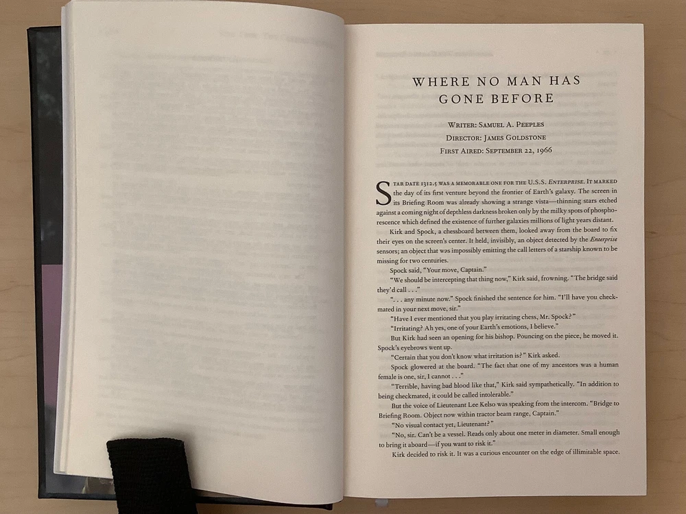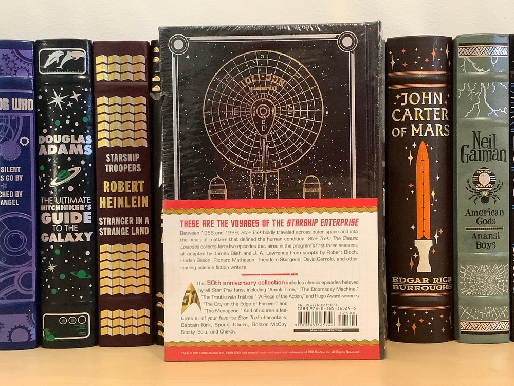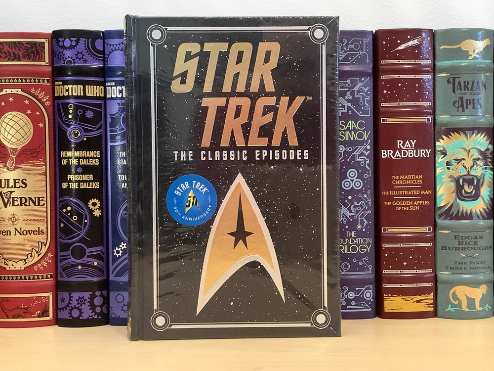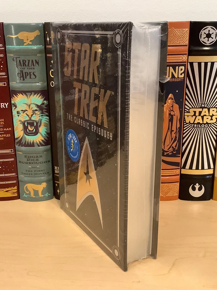 Star Trek : The Classic Episodes bound in leather, with silver edged pages and a ribbon marker contents from the back cover include: Amok Time The Doomsday Machine The Trouble With Tribbles A Piece Of The Action The City On The Edge Of Forever The Menagerie Item Condition: This is a sealed, unread leatherbound hardcover. The seal is beginning to open and there are marks and dings to the silver page edging. The corners and spine are lightly bumped. Dimensions are approx: 9.25" x 6.25" x 1.5” This book will ship in a box with bubble wrap. Photos #1-8 are of the actual book that will be shipped, the rest are examples of the book from an open copy