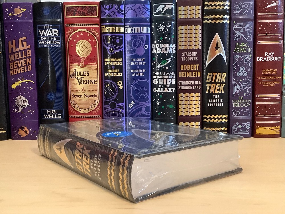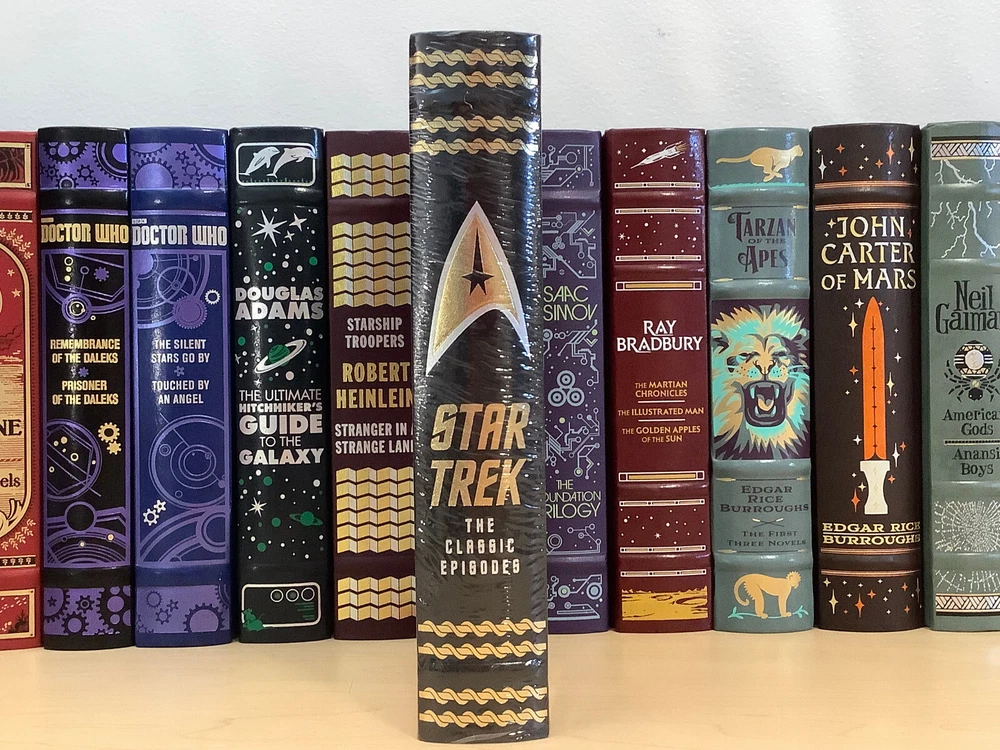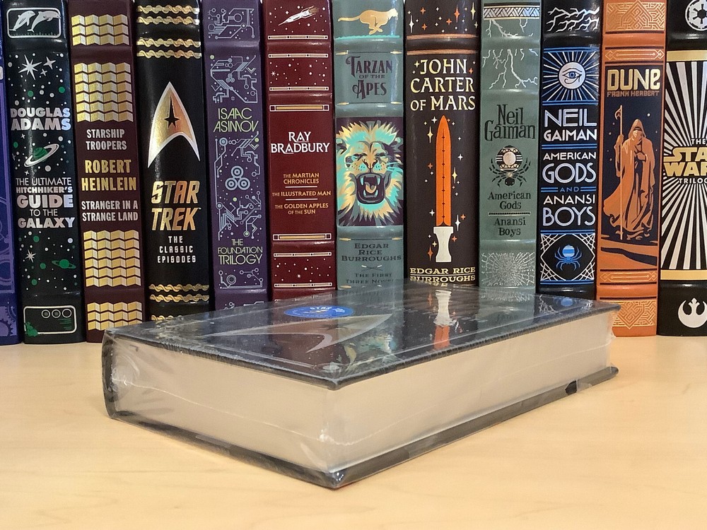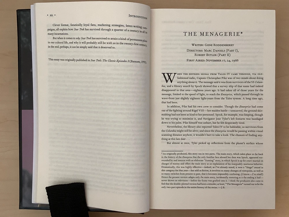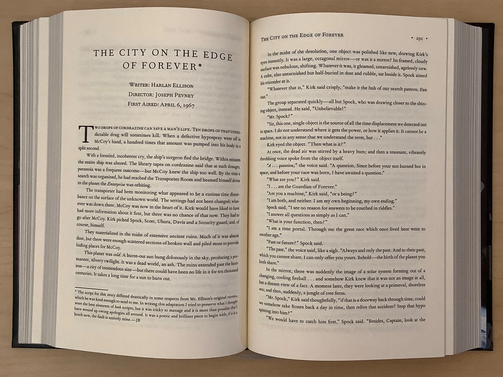 Star Trek : The Classic Episodes bound in leather, with silver edged pages and a ribbon marker contents from the back cover include: Amok Time The Doomsday Machine The Trouble With Tribbles A Piece Of The Action The City On The Edge Of Forever The Menagerie Item Condition: This is a sealed, unread leatherbound hardcover. The seal is beginning to open and there are marks and dings to the silver page edging. The corners and spine are lightly bumped. Dimensions are approx: 9.25" x 6.25" x 1.5” This book will ship in a box with bubble wrap. Photos #1-8 are of the actual book that will be shipped, the rest are examples of the book from an open copy