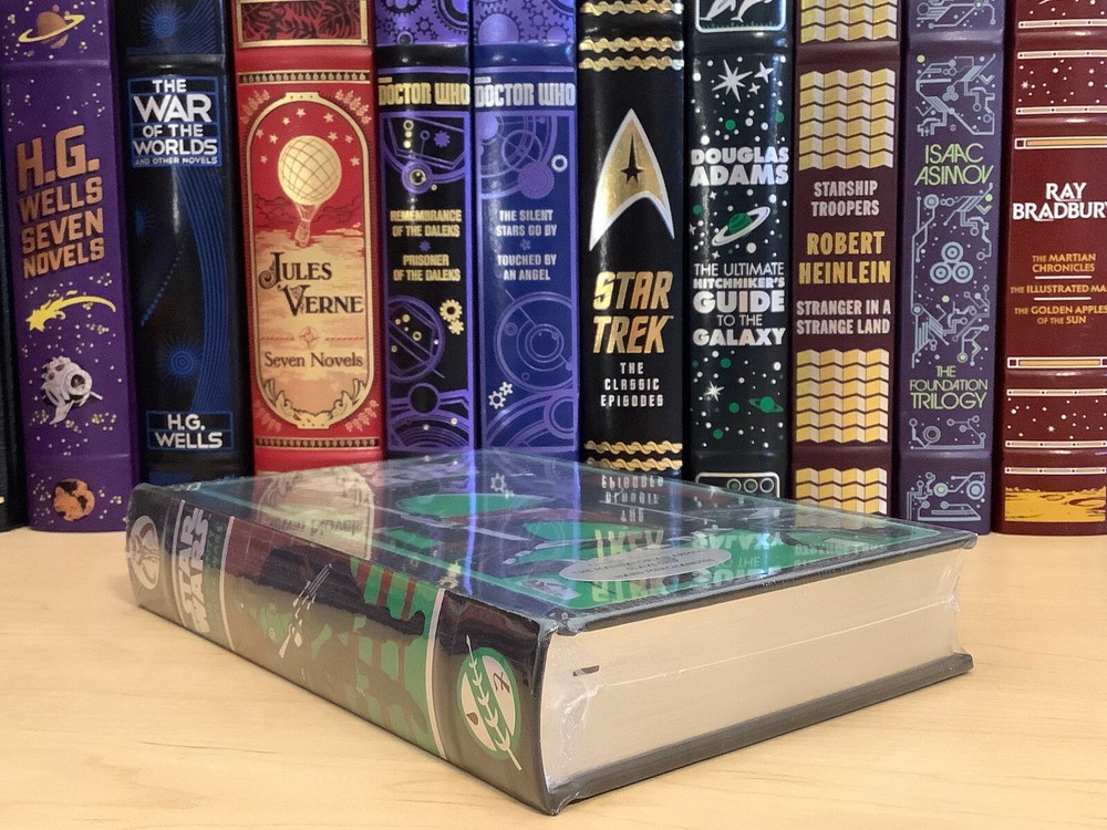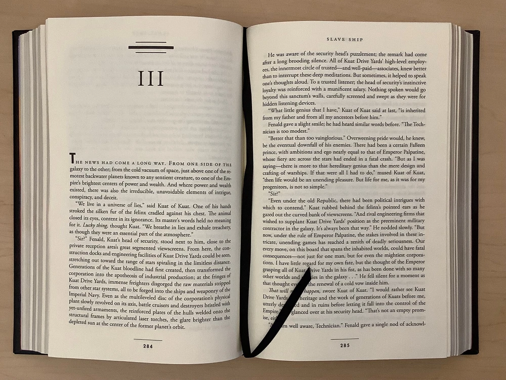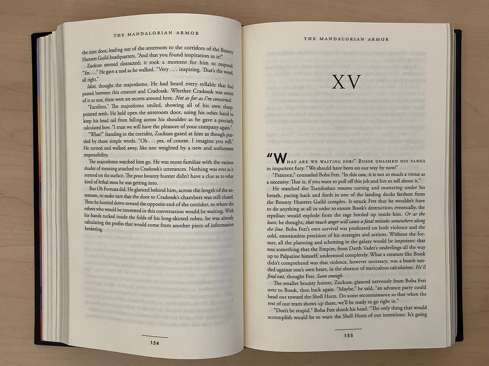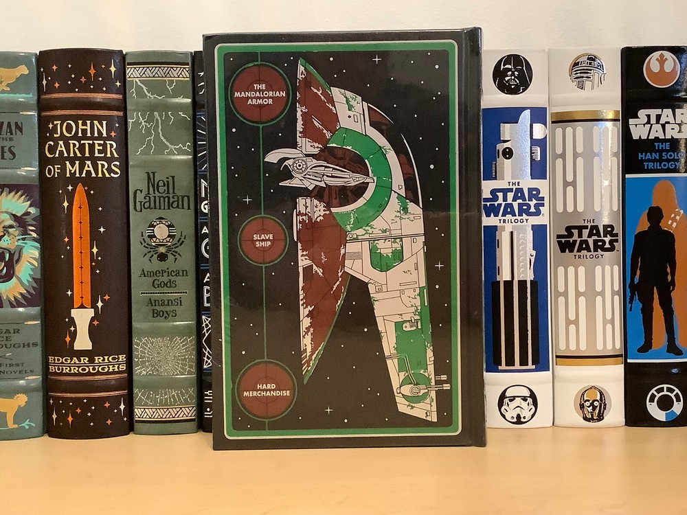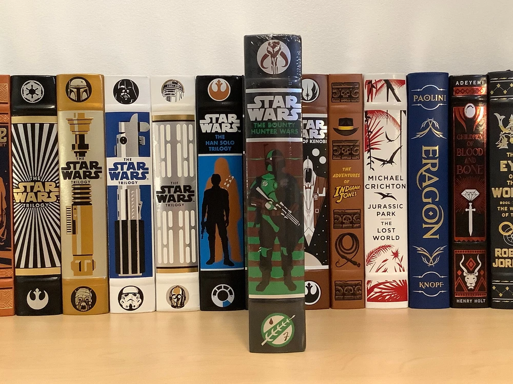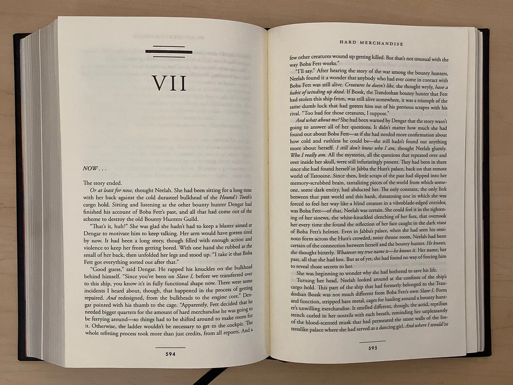 The Bounty Hunter Wars by K. W. Jeter – Legends Star Wars bound in leather, with silver edged pages and a ribbon marker contents: The Mandalorian Armor Slave Ship Hard Merchandise Item Condition: This is a sealed, unread leatherbound hardcover. The seal is beginning to open and there are some minor flaws to the silver page edging. Dimensions are approx: 9.25 x 6.25" x 1.5" This book will ship in a box with bubble wrap. Photos 1-8 are of the actual book that will be shipped, the rest are examples of the book from an open copy.